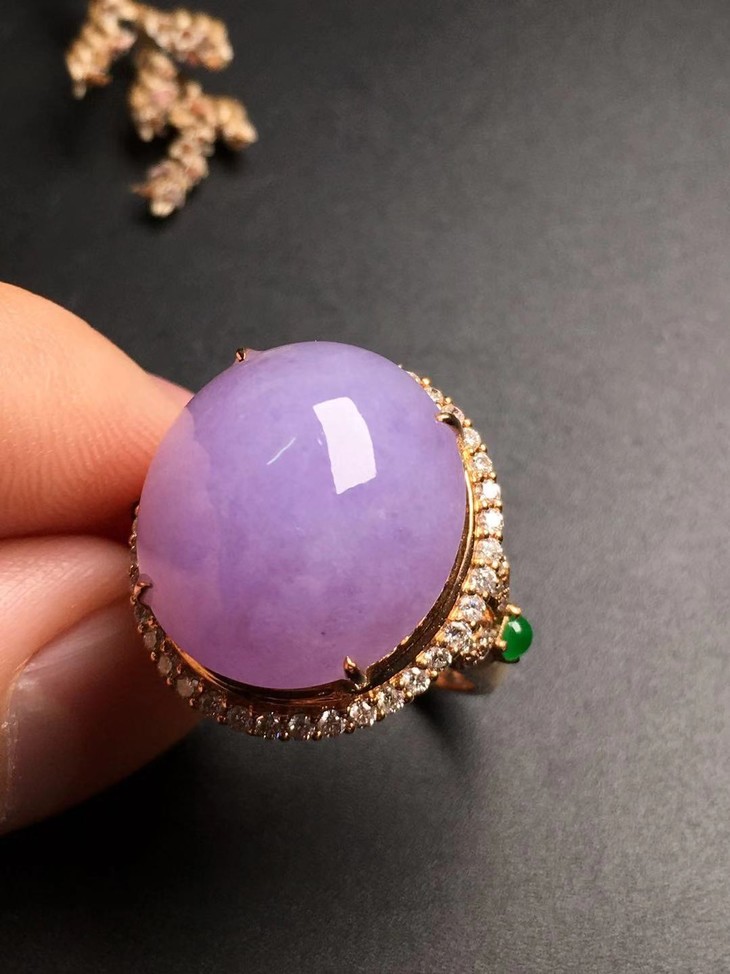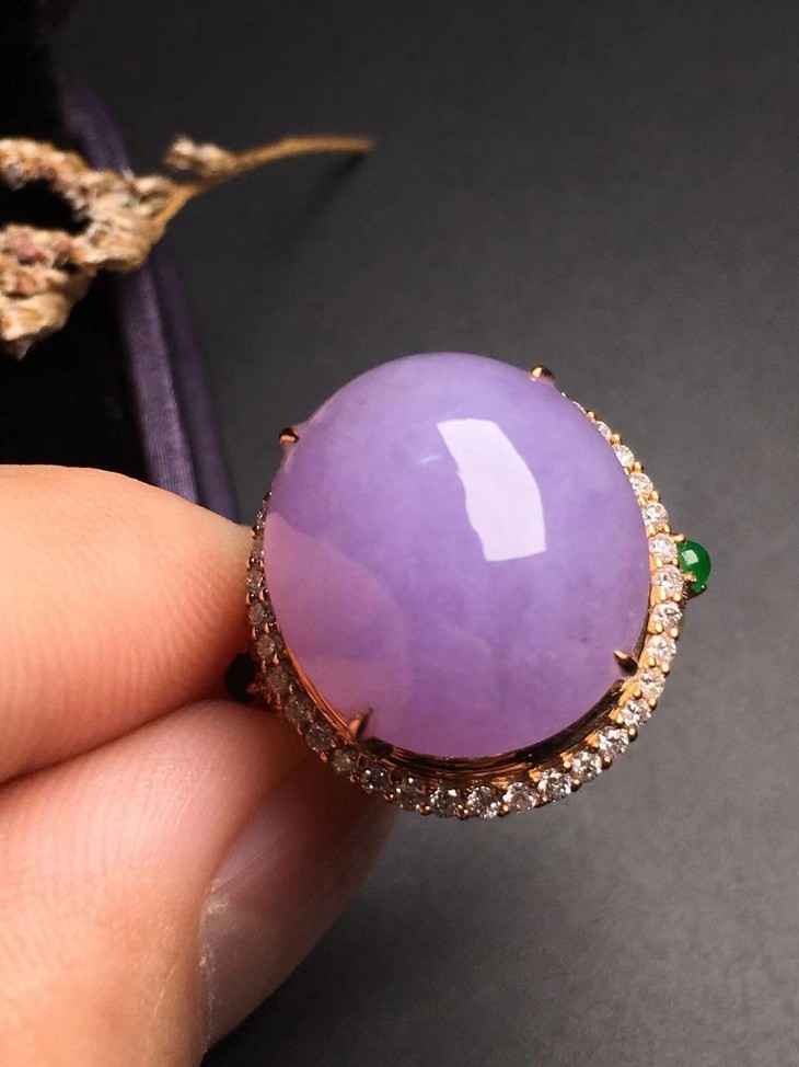 【13001】翡翠粉紫大蛋面戒指,庄厚饱满,水润光泽,完美无裂,色泽浓郁,18K镶嵌,款式精美大方,上手尽显优雅气质。裸石尺寸16.8*15*6.8mm,圈口14。超值价18000