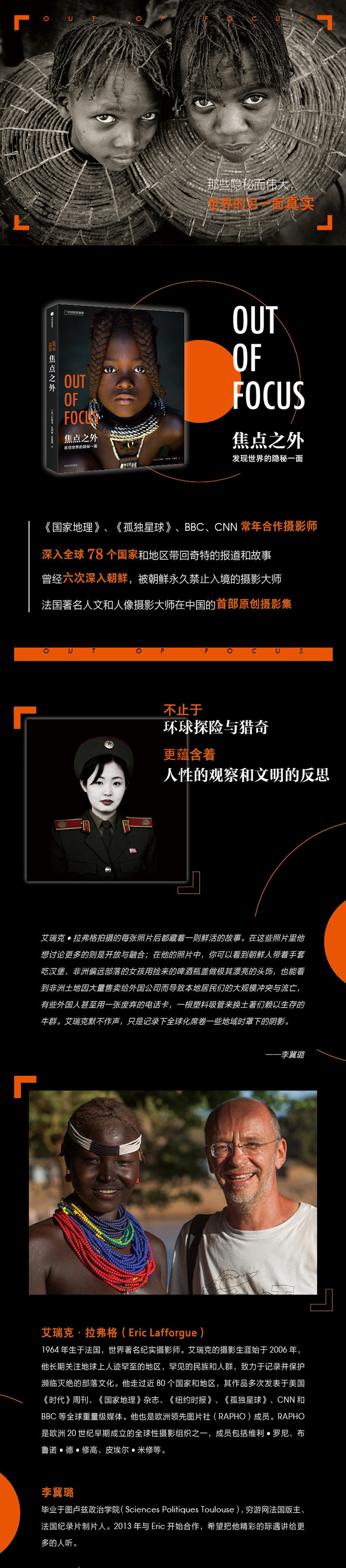 书名:《焦点之外:发现世界的隐秘一面》(法国著名人文和人像摄影大师艾瑞克•拉弗格在中国的首部原创摄影集。不止于环球探险与猎奇,更蕴含着人性的观察和文明的反思。•《国家地理》、《孤独星球》、《时代周刊》、BBC、CNN 常年合作摄影师深入全球78个国家和地区带回奇特的报道和故事。)
