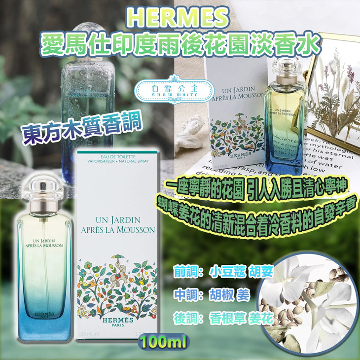 👑HERMES 爱马仕印度雨后花园淡香水 100ML 👍一款有韵味有态度的香水🌬。 🌀避开特别辛辣和刺鼻的原料🙅,配合花草系的中尾调,呈现出雨季后活泼愉悦的氛围🌧,让人产生闻到雨水落在草地和河面的味道的感觉 🌱清新水感中性香,日常适用。 【香调】东方木质香调 【前调】芫荽、豆蔻 【中调】姜、胡椒 【后调】香根草、姜花