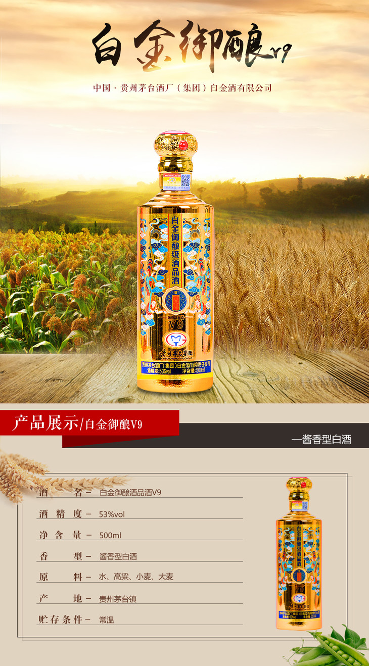 【推荐】贵州茅台集团 白金酒业 白金御酿酒品酒V9 酱香型白酒 500ml*6(新老包装随机发货)