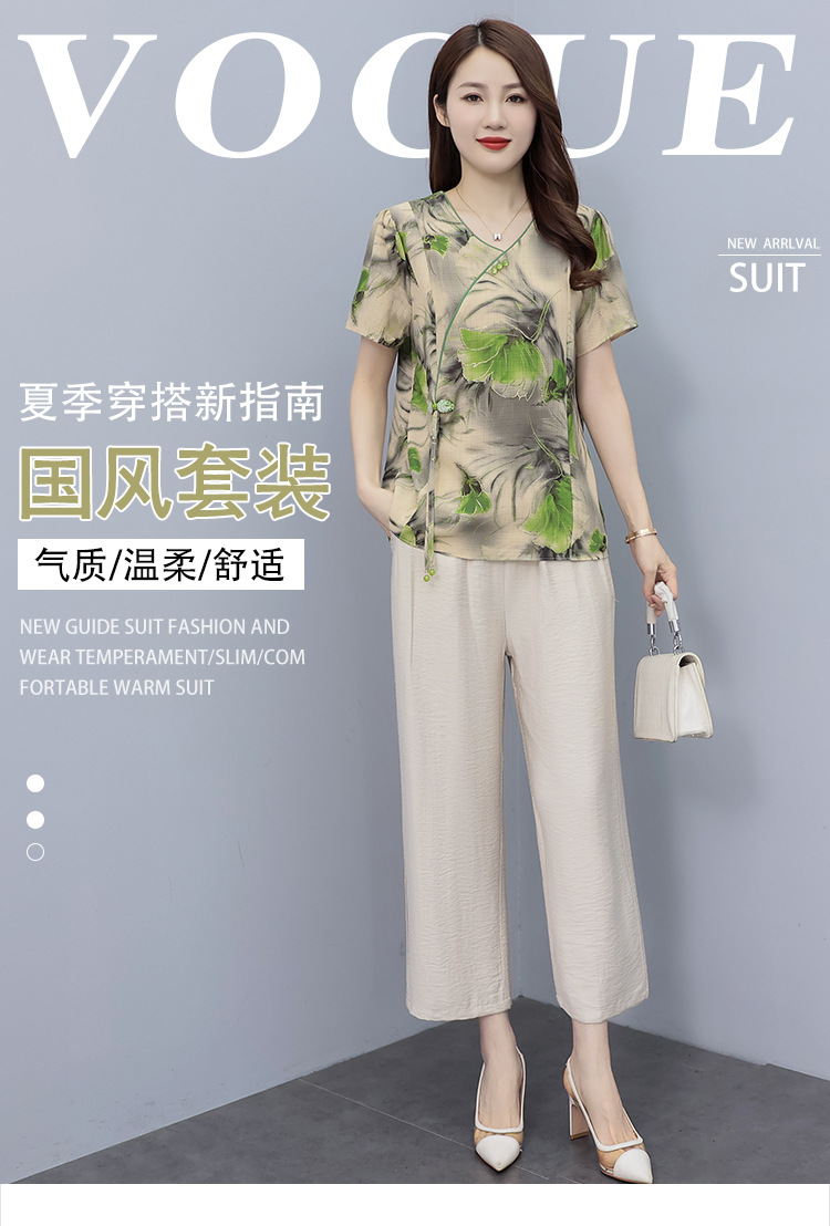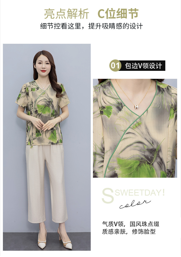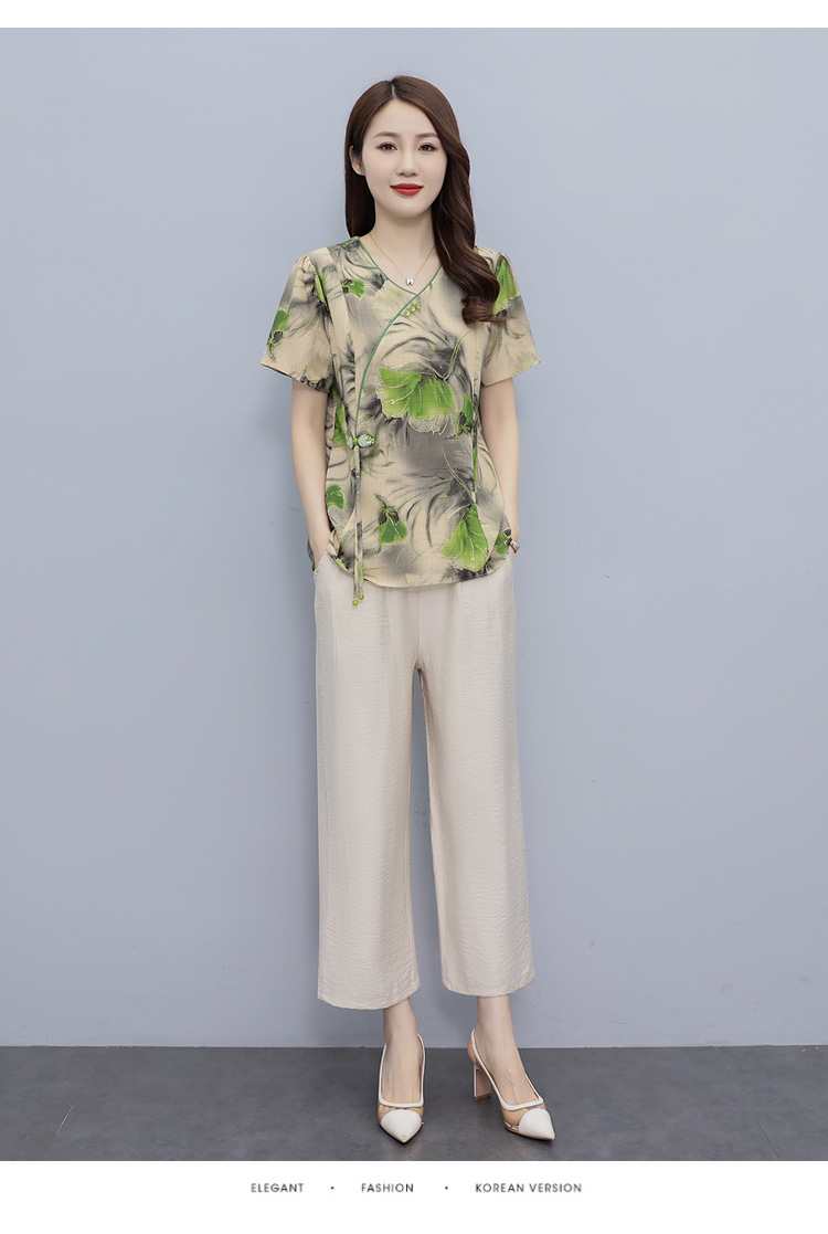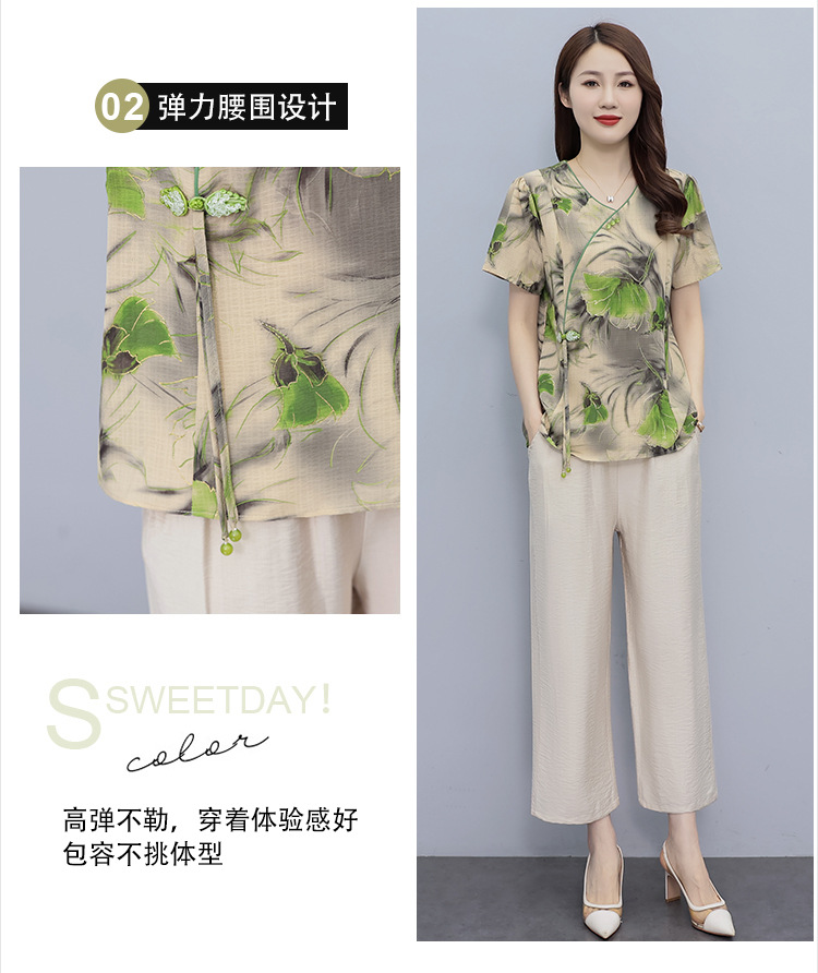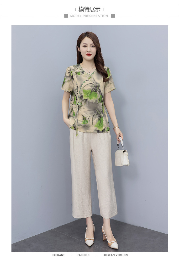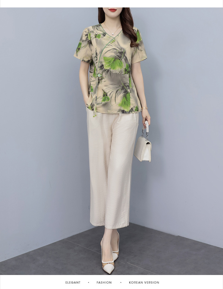 薄款短袖上衣阔腿裤两件套妈妈套装YH
