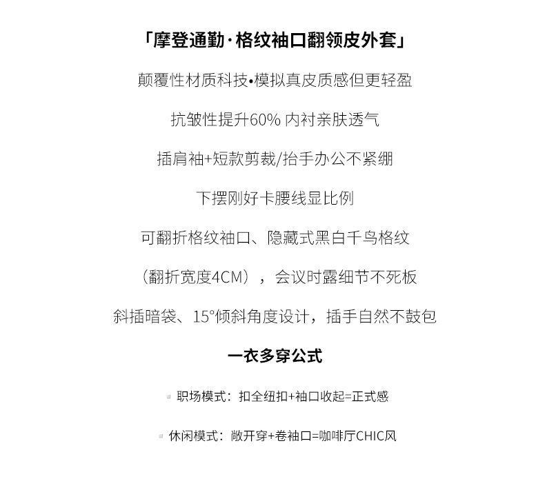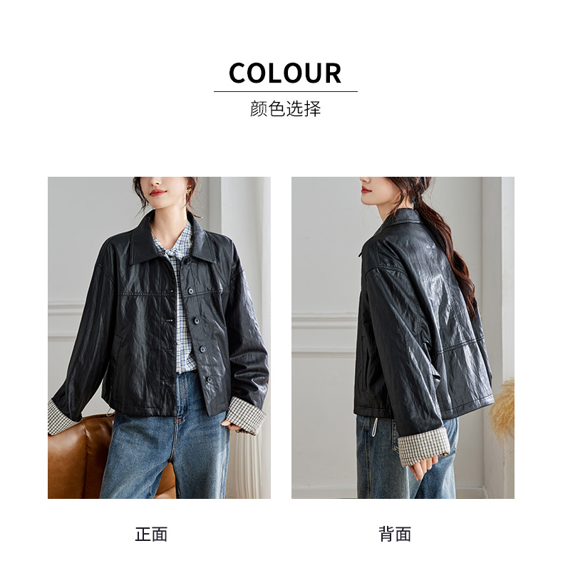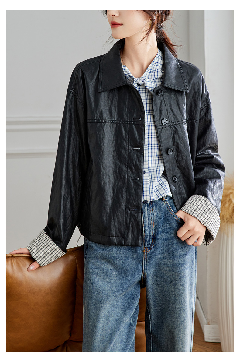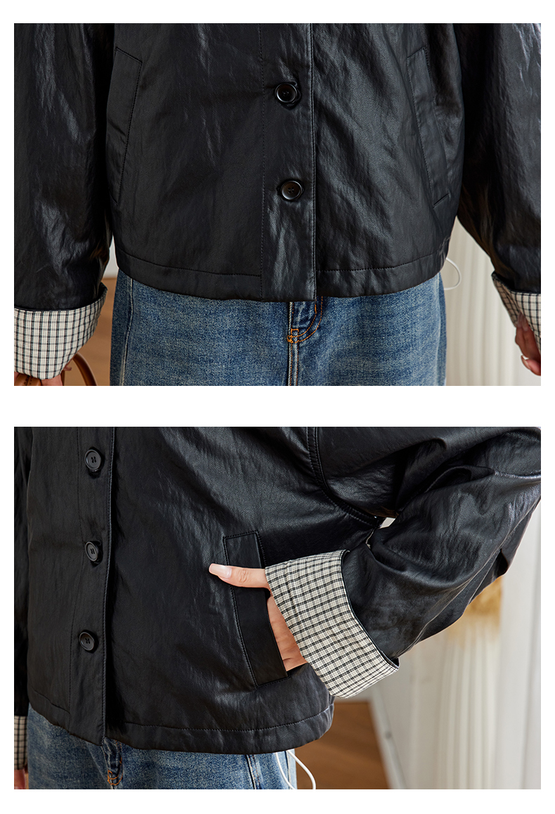馥迦摩登通勤格子袖休闲翻领皮衣外套