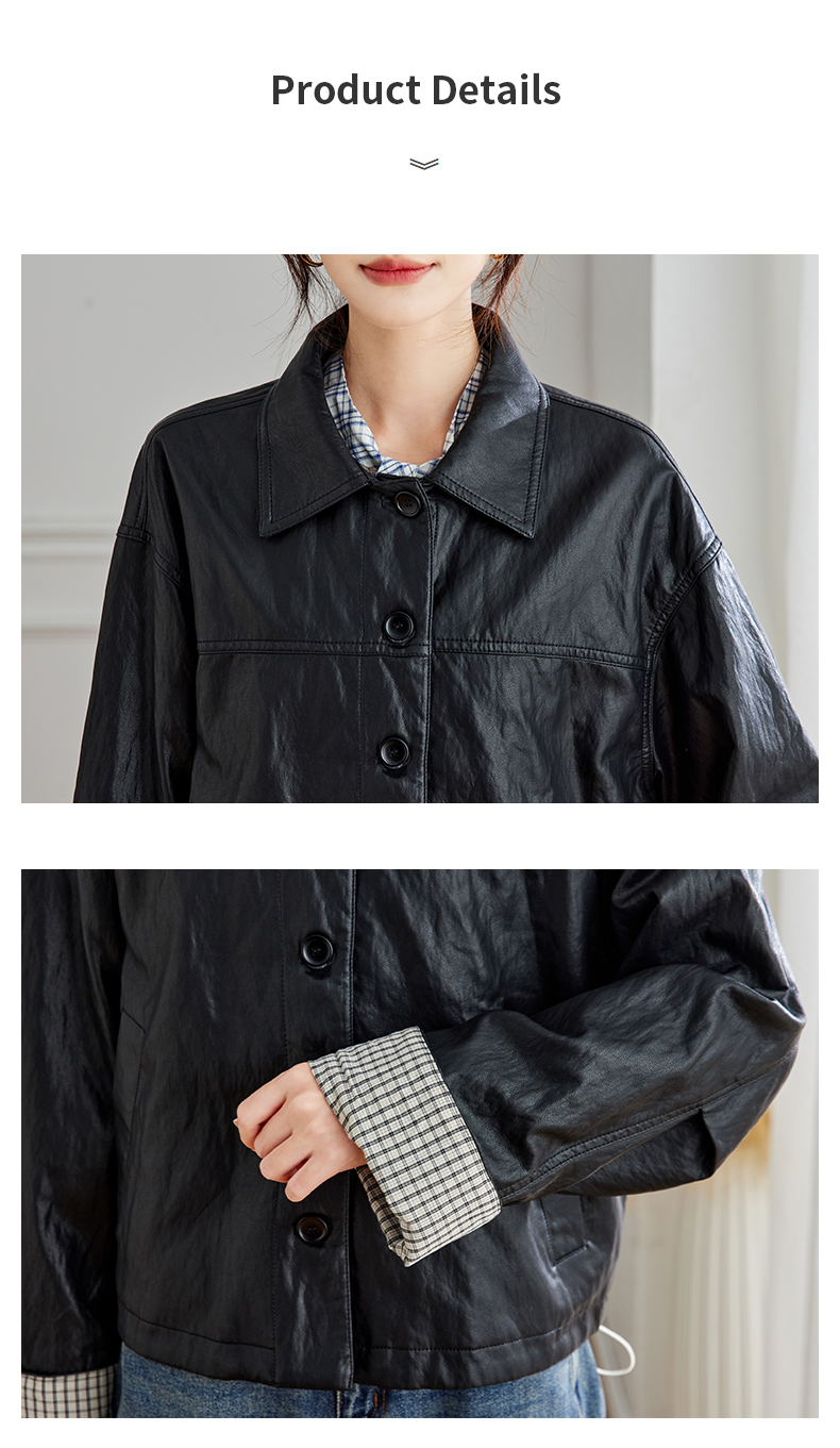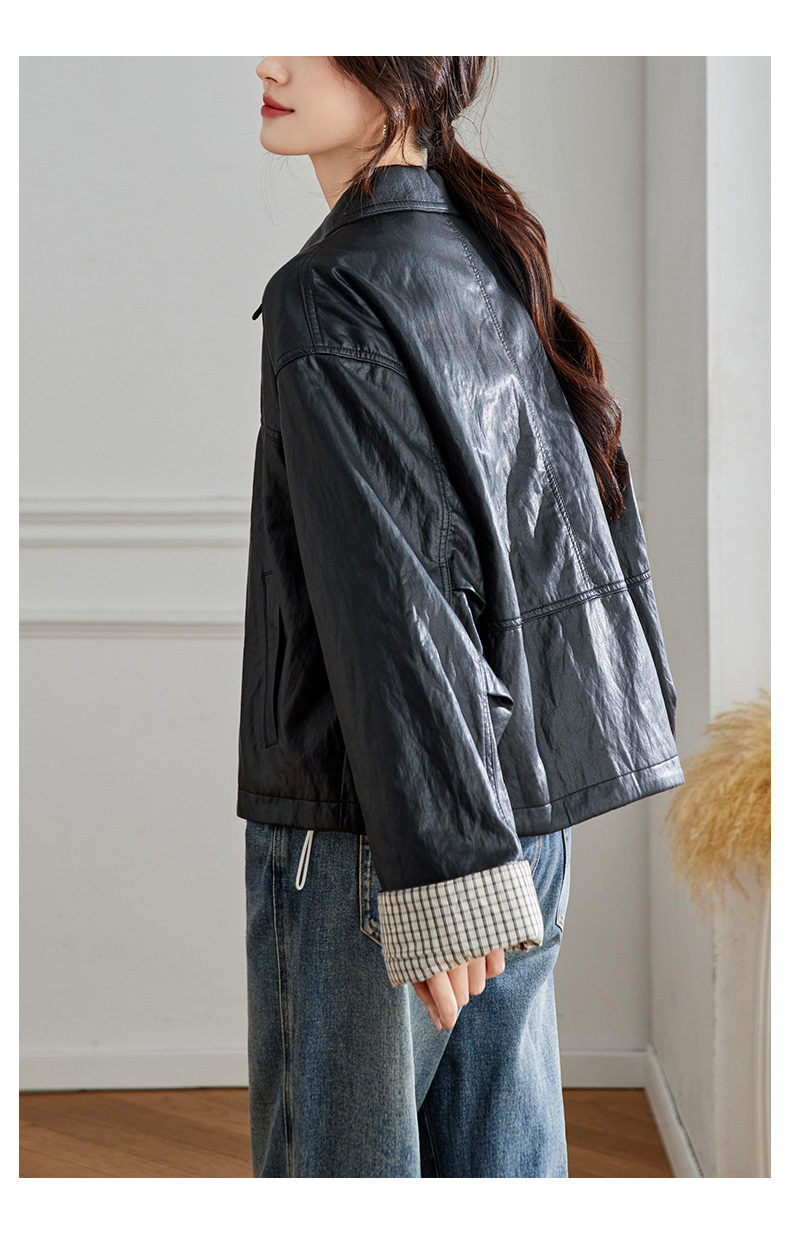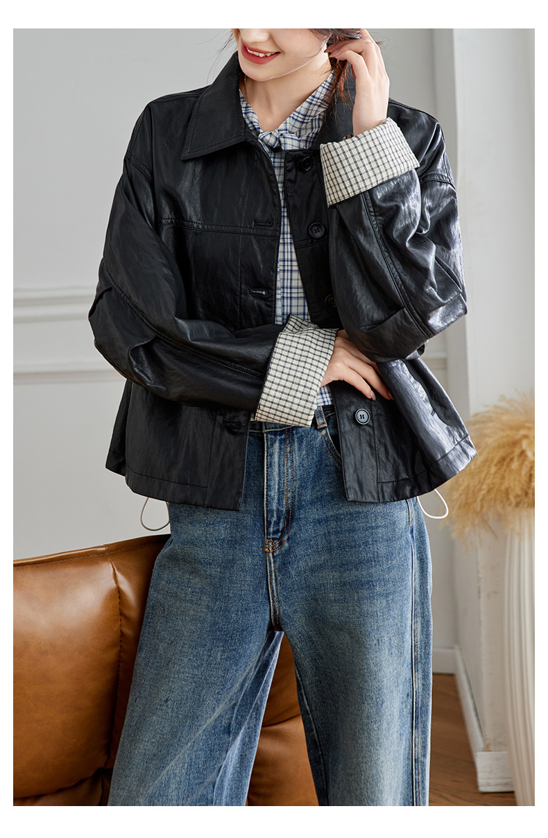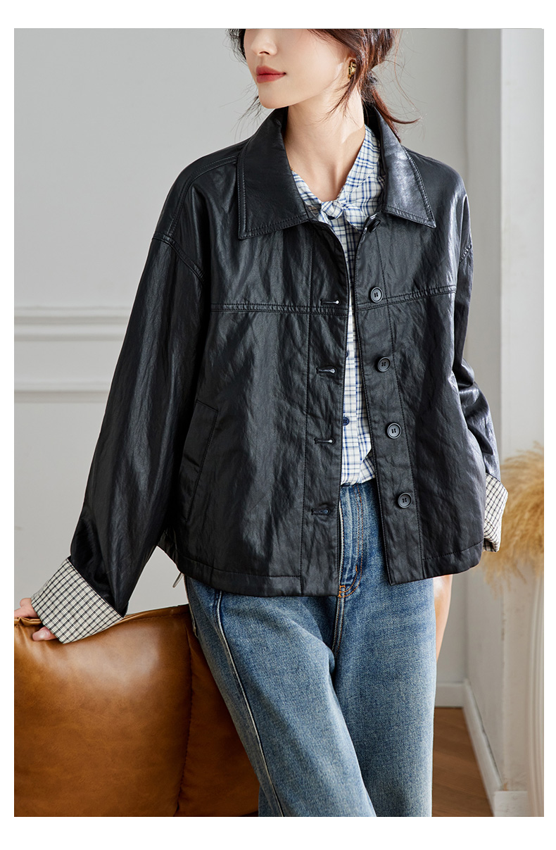 馥迦摩登通勤格子袖休闲翻领皮衣外套