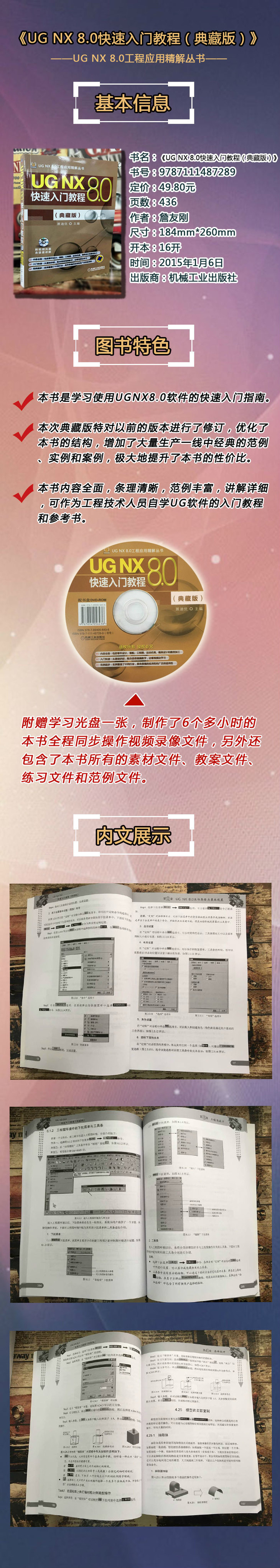 《UG NX 8.0工程应用精解丛书:UG NX 8.0快速入门教程(典藏版)》是学习使用UGNX8.0软件的快速入门指南,内容包括UGNX8.0功能模块和特性概述,软件安装,系统配置与环境设置方法,二维草图的创建,零件设计,曲面设计,装配设计,工程图的制作,运动仿真,模具设计以及数控加工等。本次典藏版特对以前的版本进行了修订,优化了本书的结构,增加了大量生产一线中经典的范例、实例和案例,极大地提升了本书的价值。在内容安排上,为了使读者更快地掌握该软件的基本功能,书中结合大量的范例对UGNX8.0软件中的一些抽象的概念、命令和功能进行讲解;另外,通过范例讲述了一些实际产品的设计过程,能使读者较快地进入设计状态;在主要章节中还安排了习题,便于读者进一步巩固所学的知识。在写作方式上,《UG NX 8.0工程应用精解丛书:UG NX 8.0快速入门教程(典藏版)》紧贴软件的实际操作界面,采用软件中真实的对话框和按钮等进行讲解,使初学者能够直观、准确地操作软件进行学习,从而尽快地上手,提高学习效率。读者在学习本书后,能够迅速地运用UG软件来完成一般产品的设计工作,并为进一步学习高级和专业模块打下坚实的基础。《UG NX 8.0工程应用精解丛书:UG NX 8.0快速入门教程(典藏版)》内容全面,条理清晰,范例丰富,讲解详细,可作为工程技术人员自学UG软件的入门教程和参考书,也可作为大中专院校学生和各类培训学校学员的UG课程上课或上机练习教材。《UG NX 8.0工程应用精解丛书:UG NX 8.0快速入门教程(典藏版)》附视频学习光盘一张,制作了6个多小时的本书全程同步操作视频录像文件,另外还包含了本书所有的素材文件、教案文件、练习文件和范例文件。