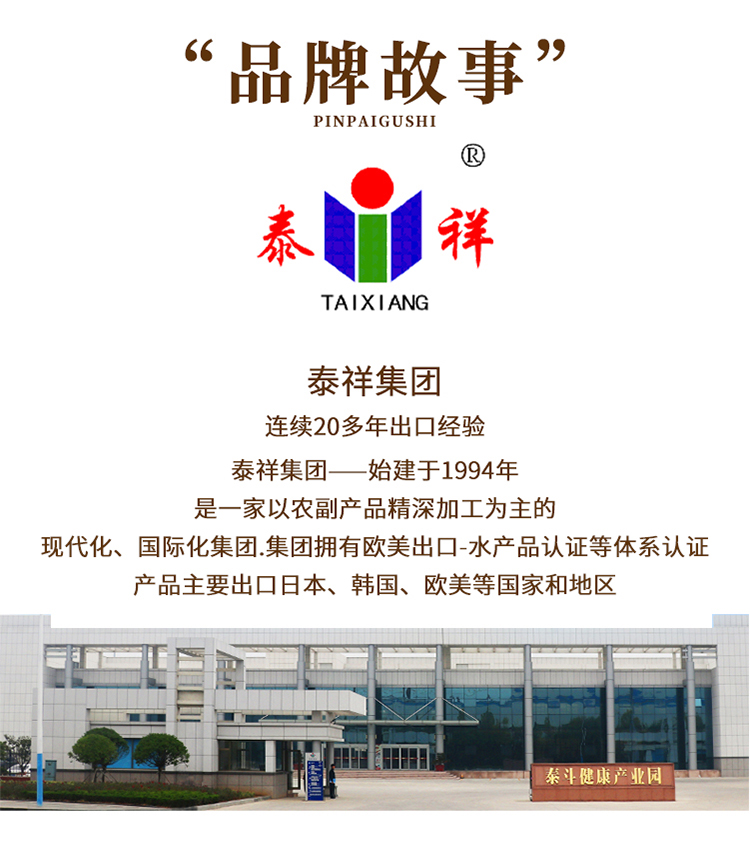 泰祥集团是一家以农副渔产品为原料进行精深加工的企业,经过十几年的发展,集团公司现已拥有居世界领先水平的全封闭式无菌加工车间,具备了先进的生产设备和位居行业前列的生产技术,形成了一定的生产规模。