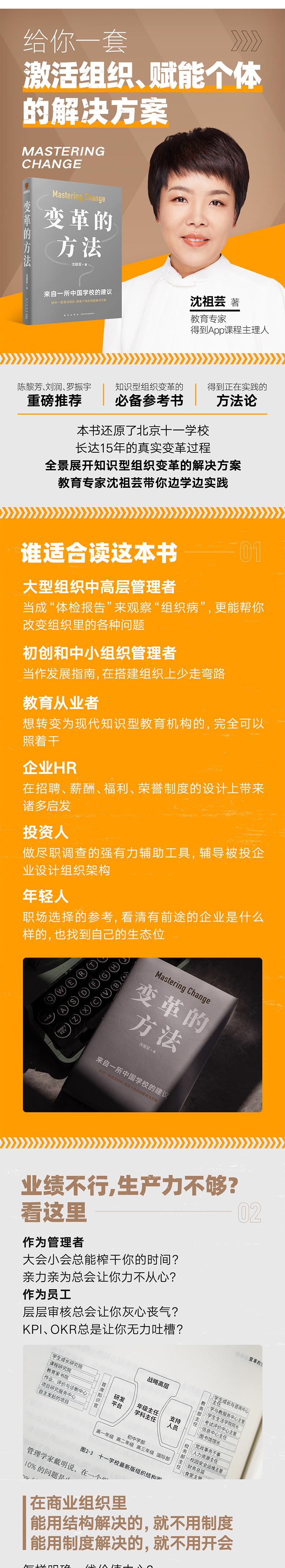 无论什么类型的组织,在发展过程中都可能会遇到各种问题,比如员工动力不足、合作不畅、责任心不强、执行力不够等。更重要的是,如今我们已经进入知识经济时代,每个组织都面临着靠前的挑战,那就是如何让组织更具多样性和创新性,以及如何激活个体、创造更多可能性。面对这一切,变革就成了组织绕不过去的实践行动。而在变革方面,北京市十一学校的经验极具借鉴意义。十一学校是一所有近70年历史的传统公办学校。2007年,在资源有限的情况下,李希贵校长带领全校5000多名师生展开了一场组织变革,完成了育人模式转型和组织创新,并荣获国务院颁发的首届教学果特等奖。在这本书中,沈祖芸以亲历者的角度,梳理了北京市十一学校长达14年的变革过程,剖析组织转型时面临的各种痛点、难点,拆解实现变革目标所必经的各个步骤,将其总结为一套系统完整的方法论。组织变革不单凭经验、不只靠经历,它是一个有规律可循、有步骤可走、有误区可避的系统演进......