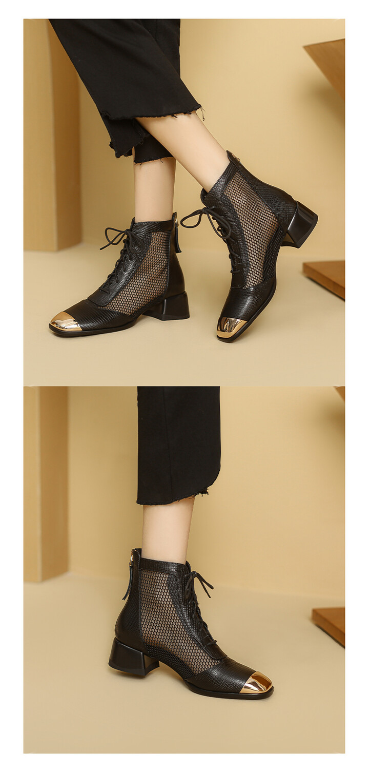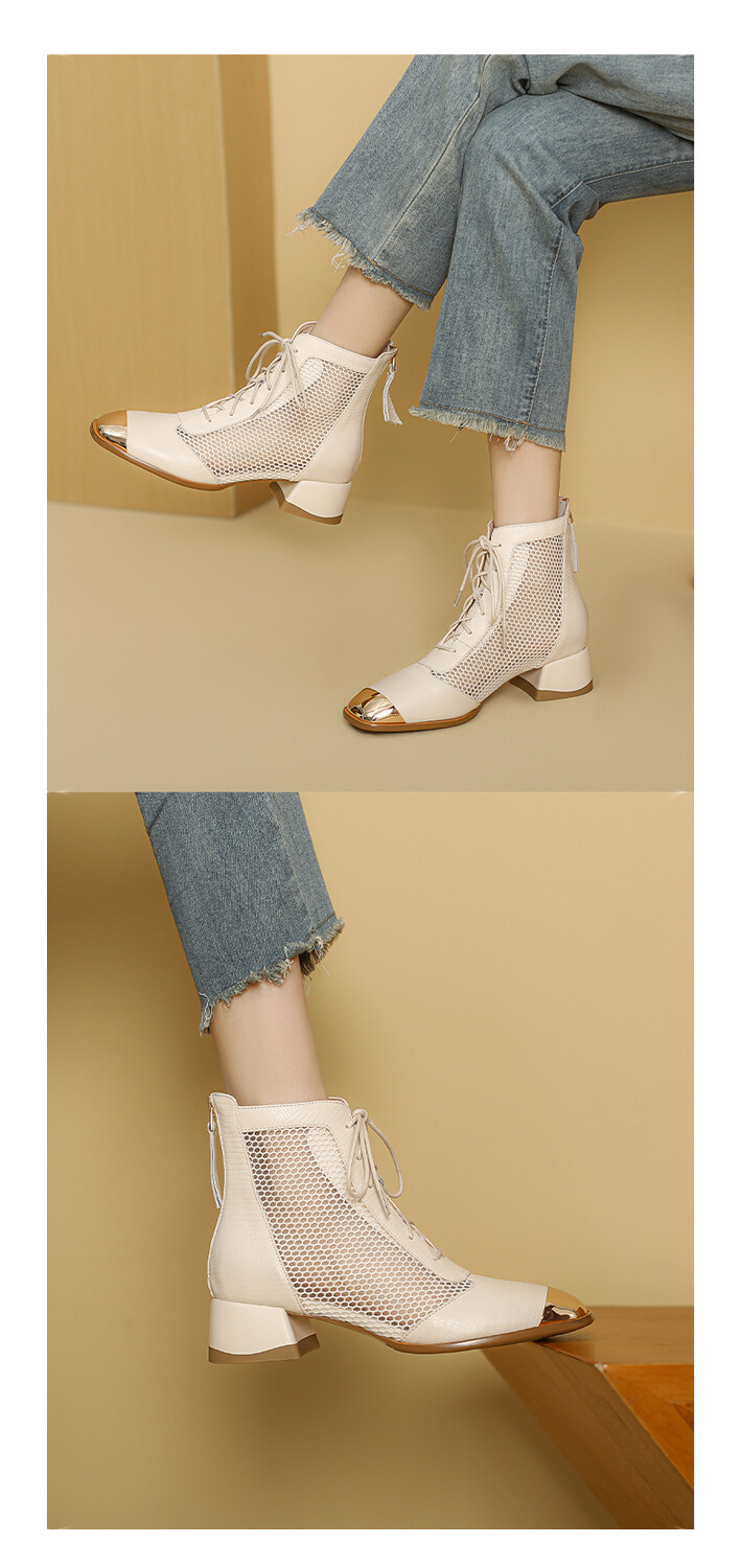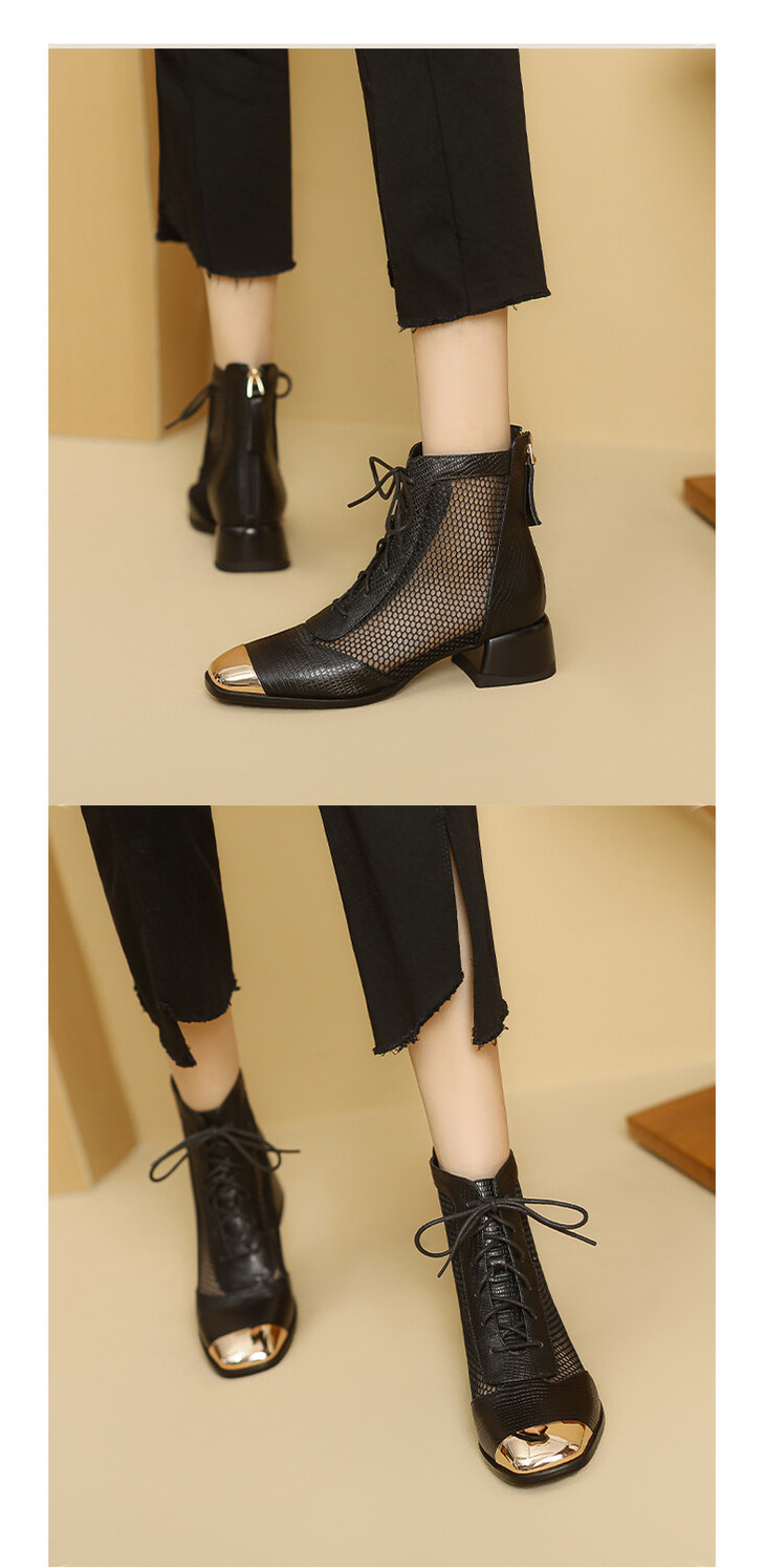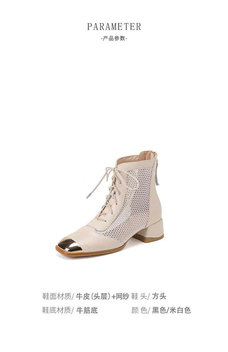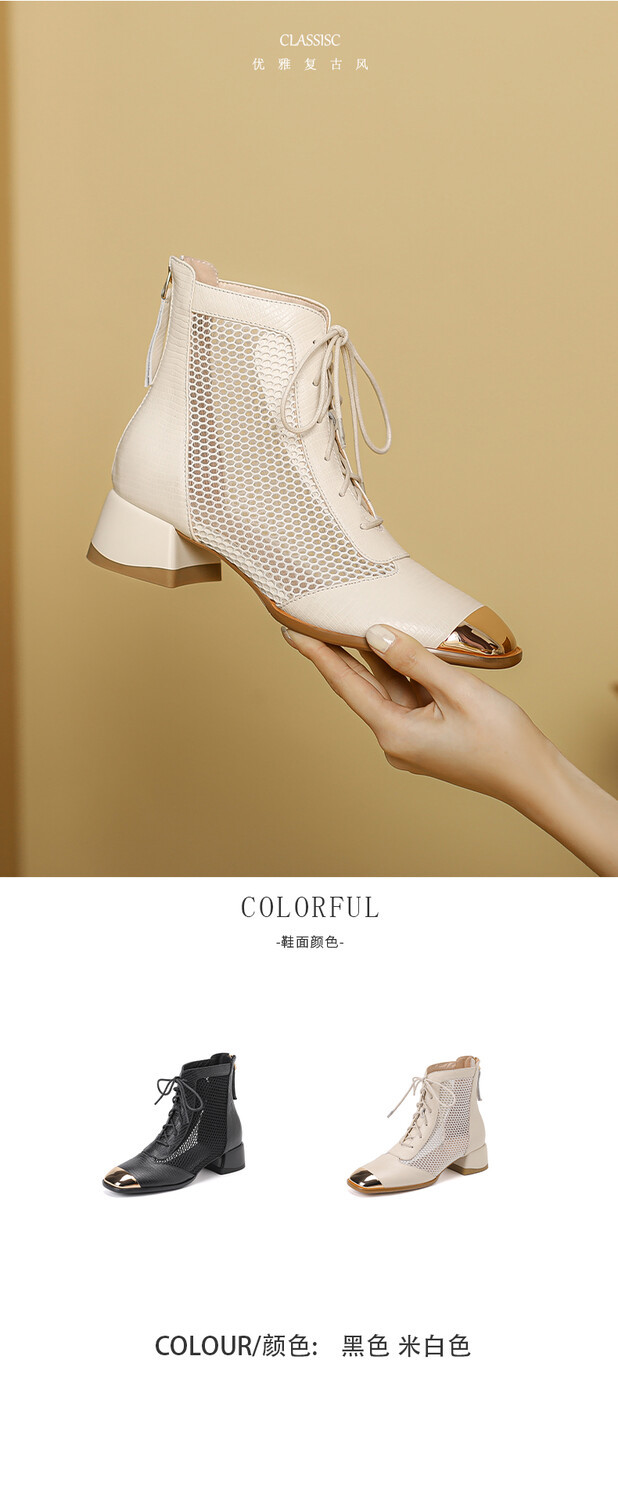 【预售5天】金属鞋头真皮镂空网靴短靴女春秋季粗跟系带凉靴PLGZ&D122-5