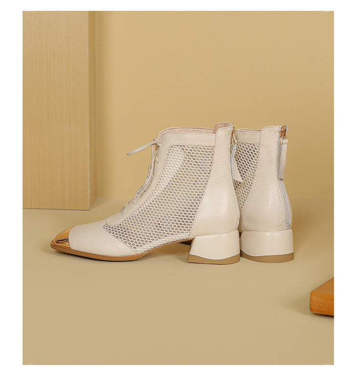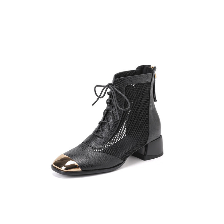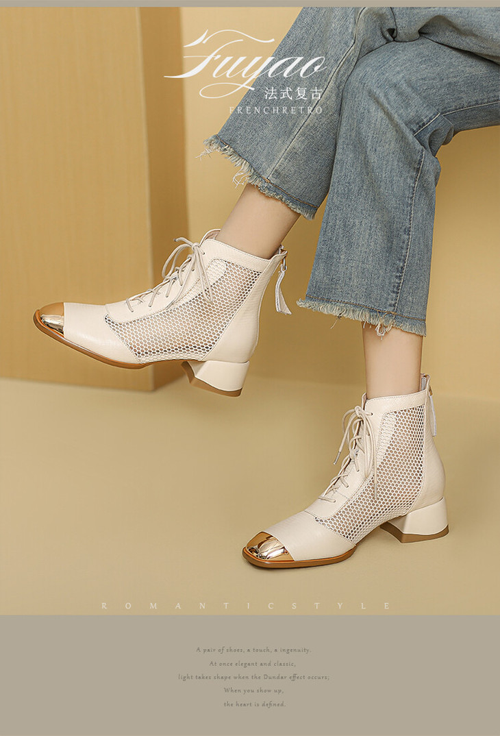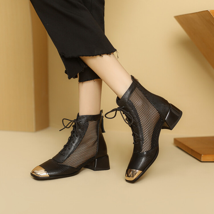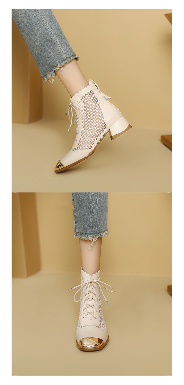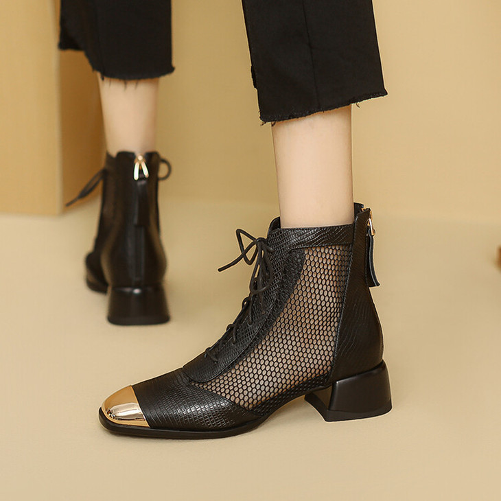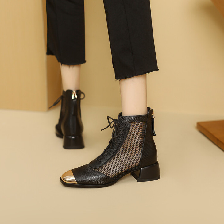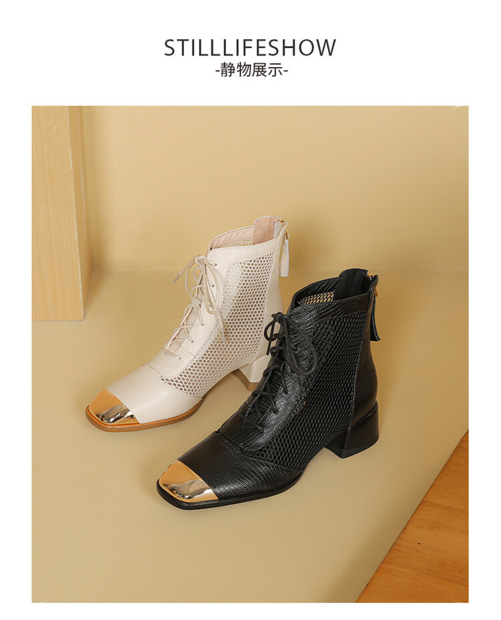 【预售5天】金属鞋头真皮镂空网靴短靴女春秋季粗跟系带凉靴PLGZ&D122-5