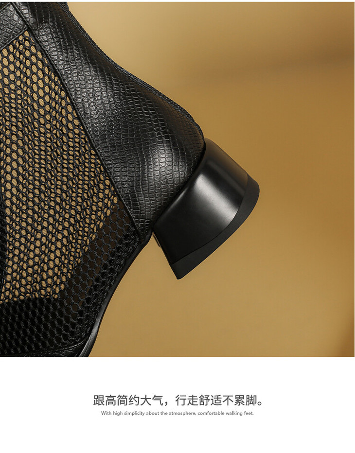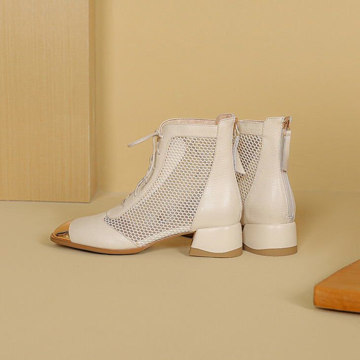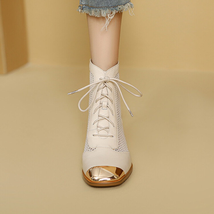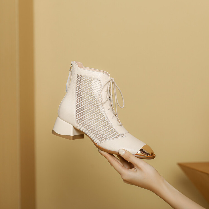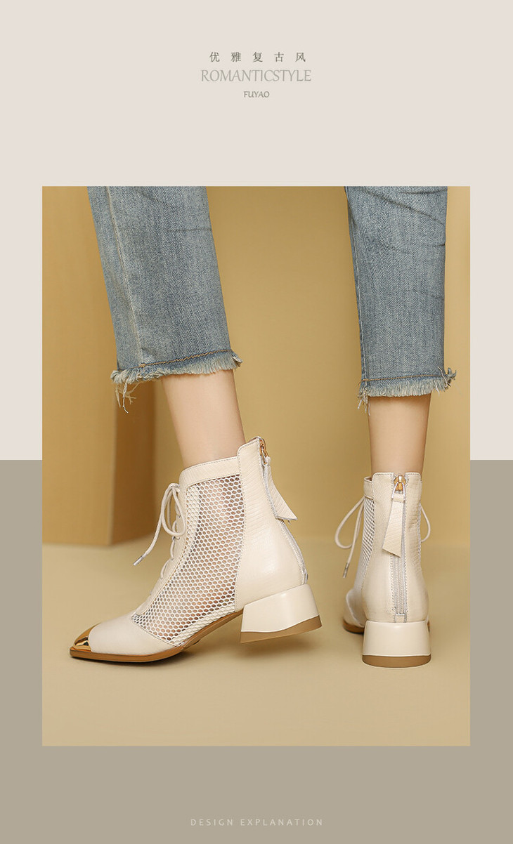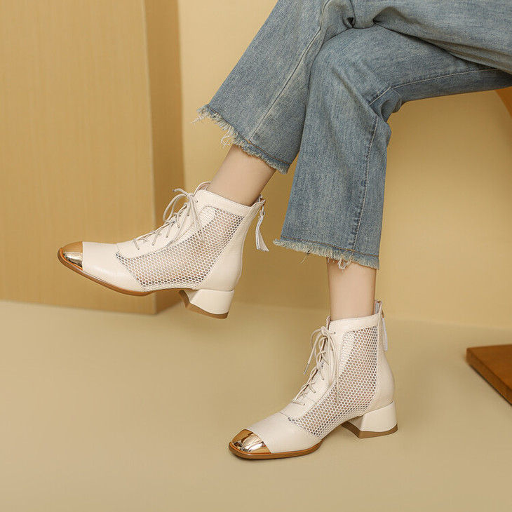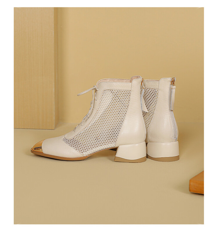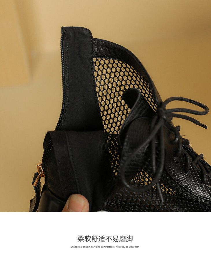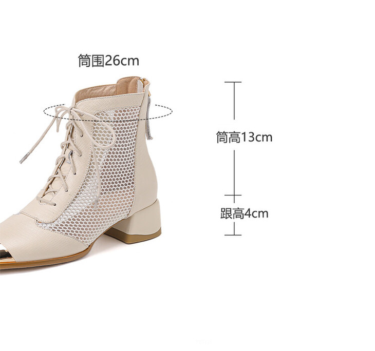 【预售5天】金属鞋头真皮镂空网靴短靴女春秋季粗跟系带凉靴PLGZ&D122-5