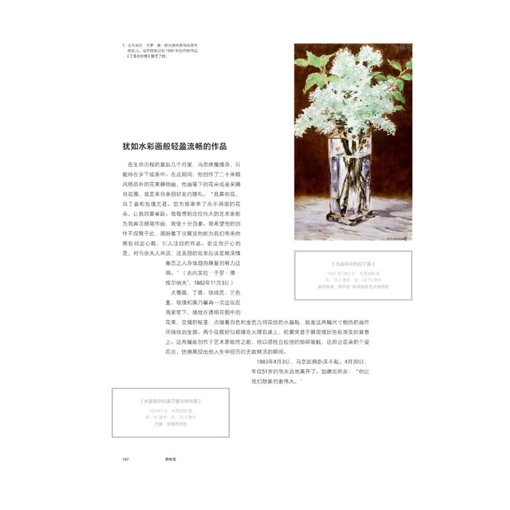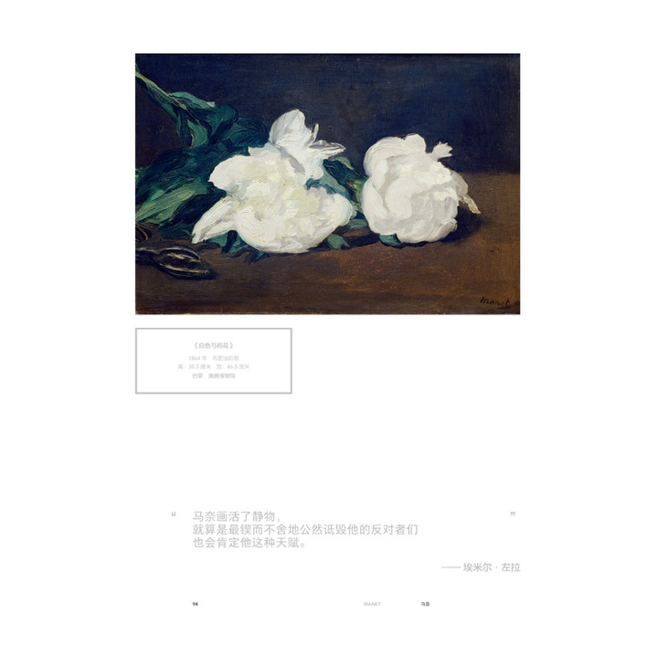本书是“纸上美术馆”系列图书之一。马奈,法国画家,1832年出生于巴黎,是19世纪印象派的奠基人之一。他在创作中将古典主义技法与现代题材相结合,同时吸收了西班牙绘画和日本浮世绘的元素。他深具革新精神的艺术创作态度,深深影响了莫奈、塞尚、梵高等画家,进而将绘画带入现代主义的道路上。代表作品有《草地上的午餐》《奥林匹亚》《吹短笛的男孩》等。