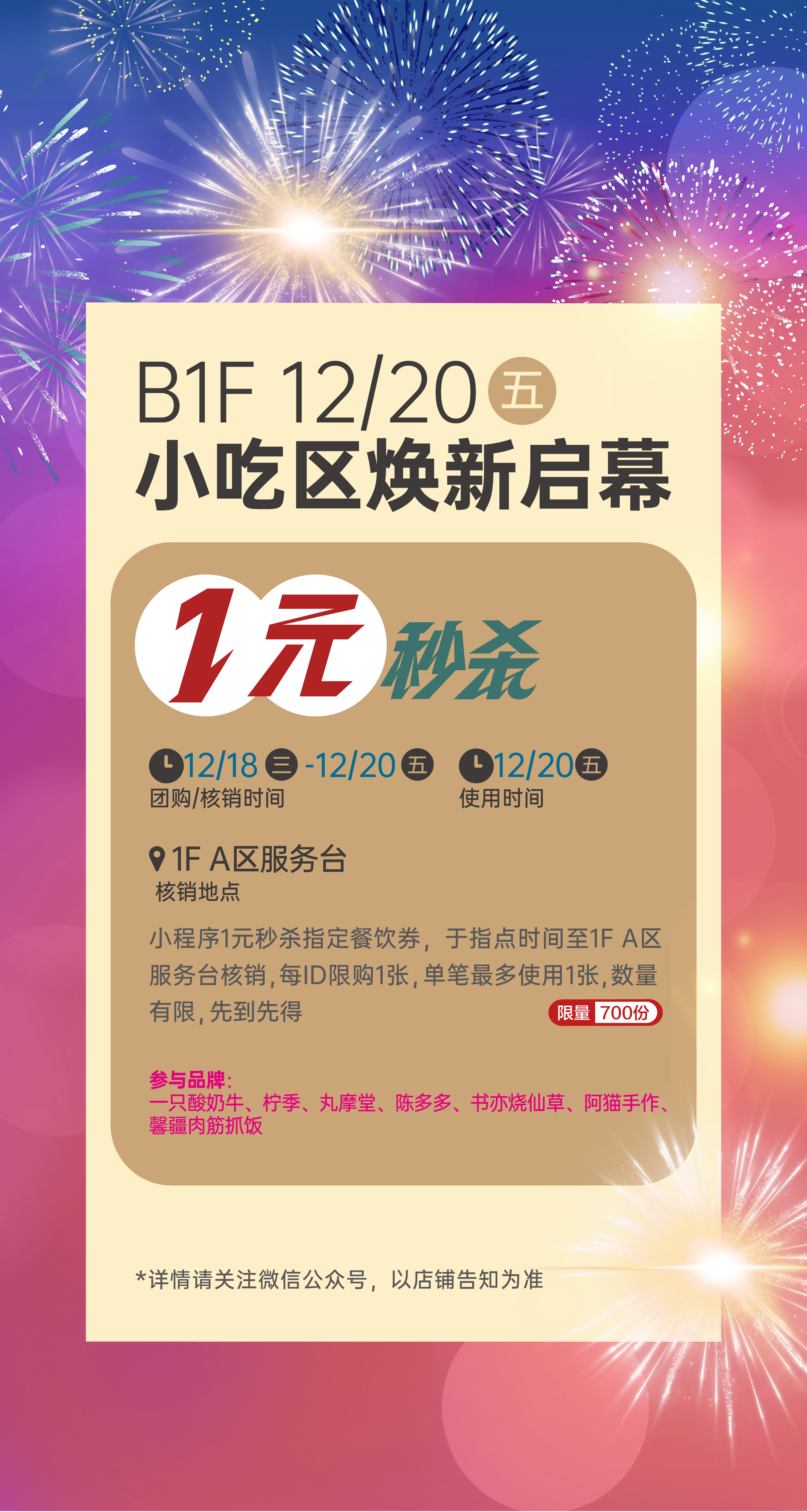 3.本券消费部分不开具发票,使用时间仅限活动日12/20(五)营业时间内使用。核销即消费,不找零、不兑现、逾期作废;