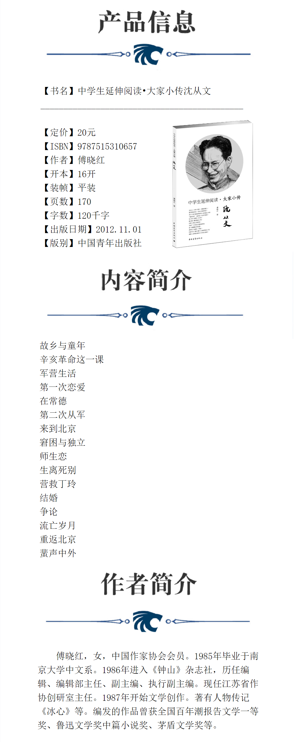 中学生延伸阅读•大家小传沈从文 傅晓红著 中国青年出版社