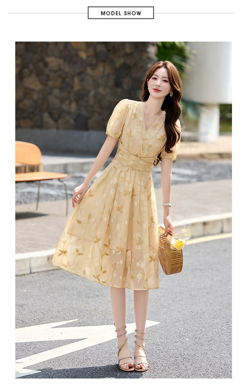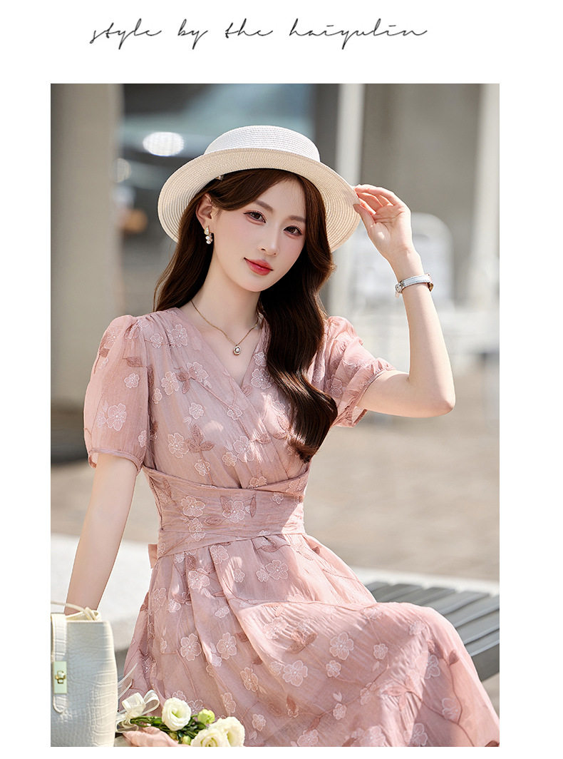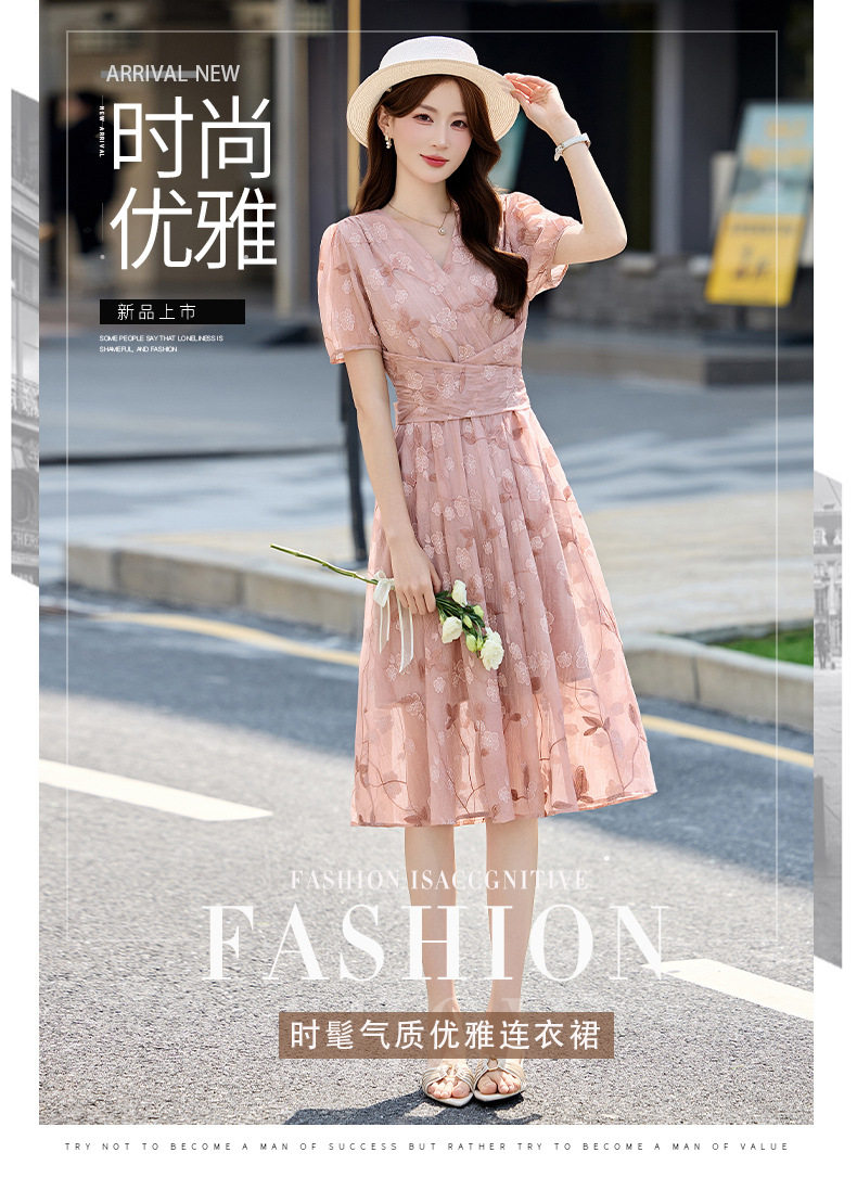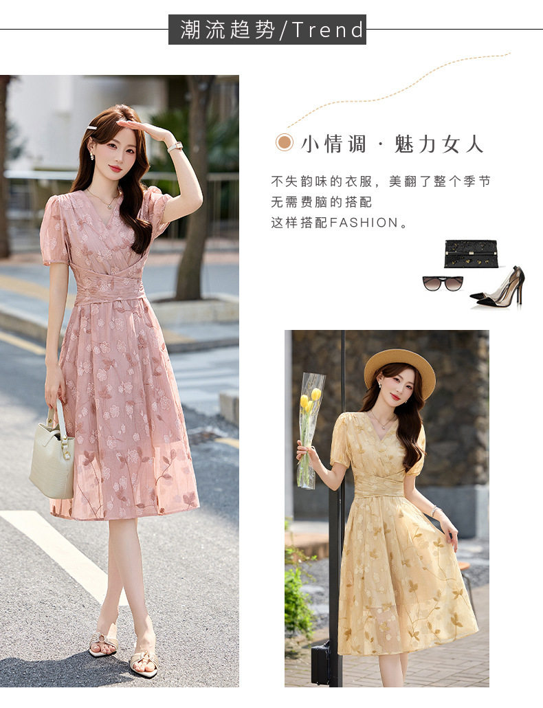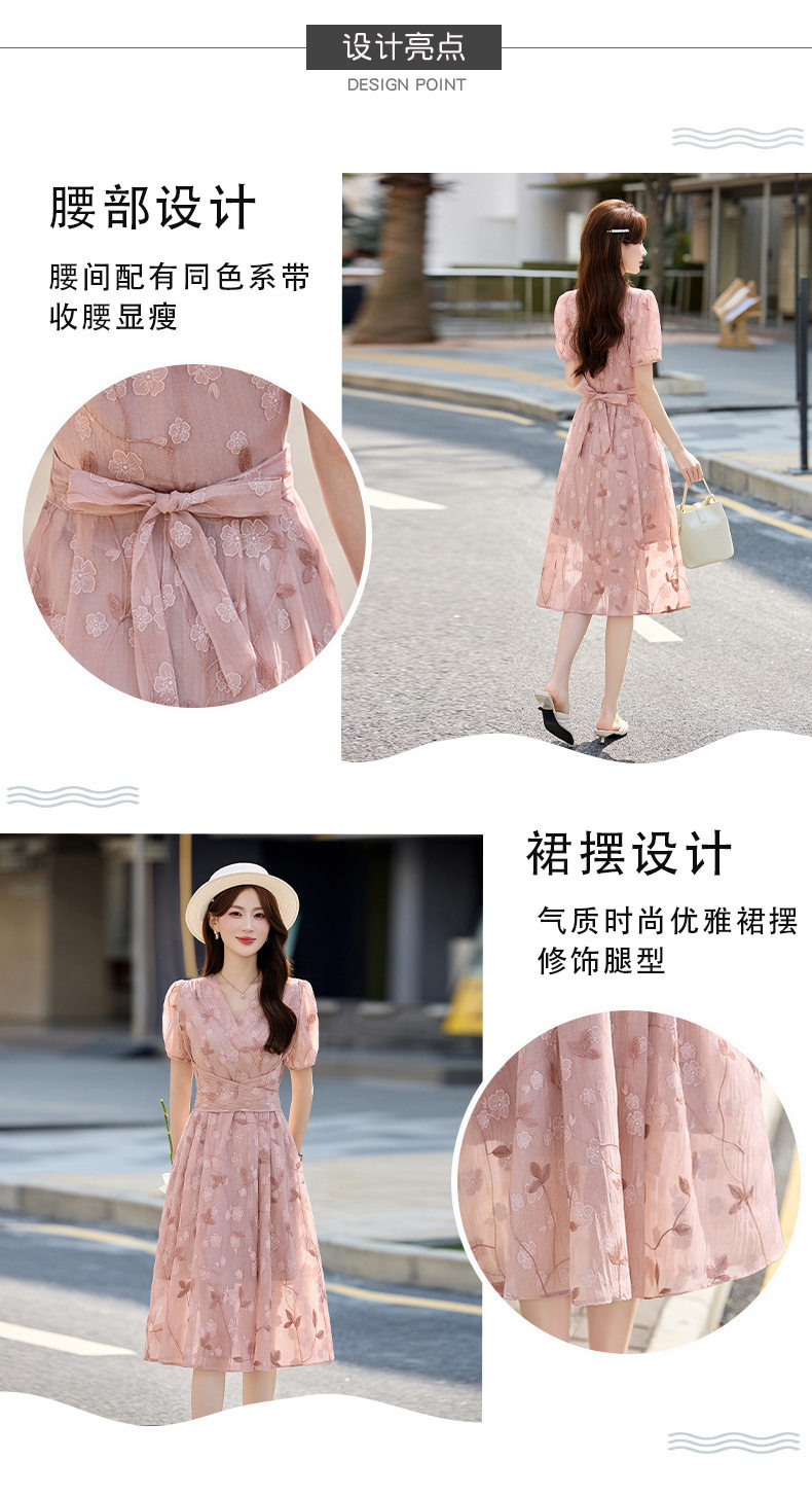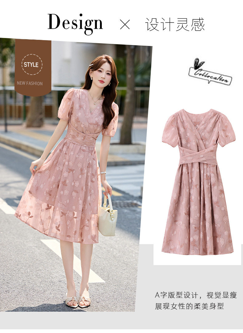 「自」全新升级【铂金会员257/天猫339/差价82】(15103)洛诗琳气质立体刺绣提花连衣裙女2026夏季新款V领收腰茶歇裙