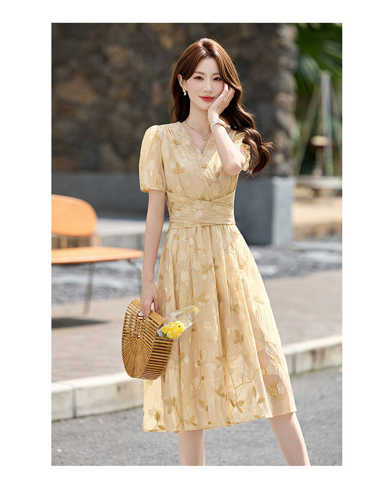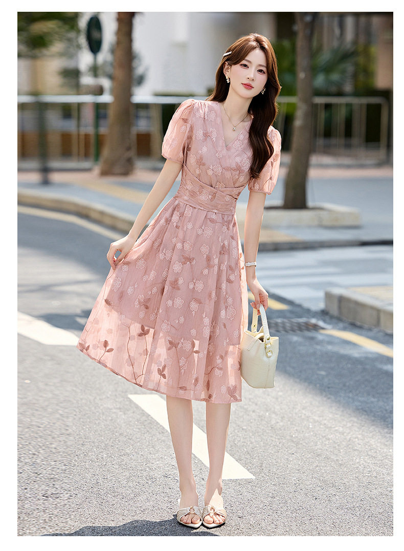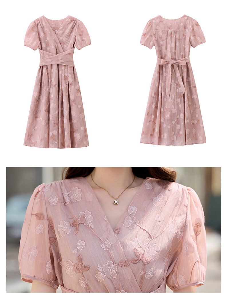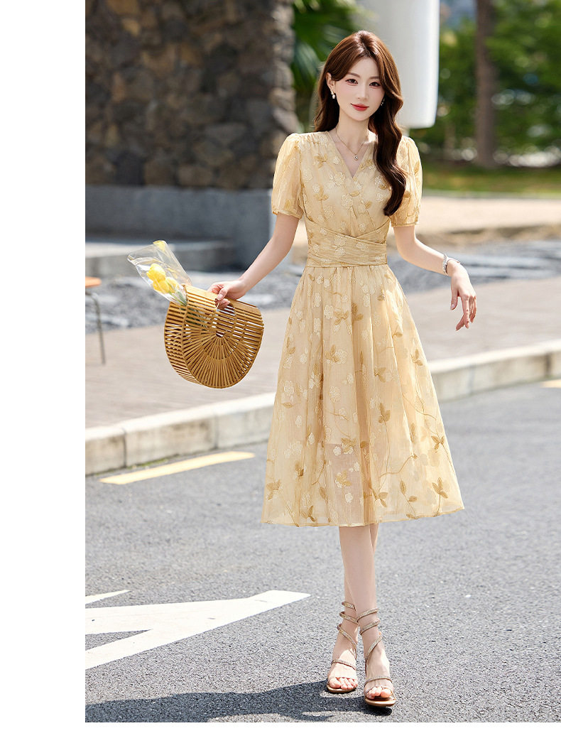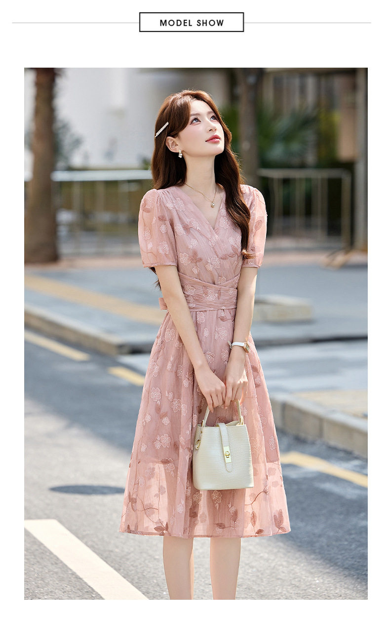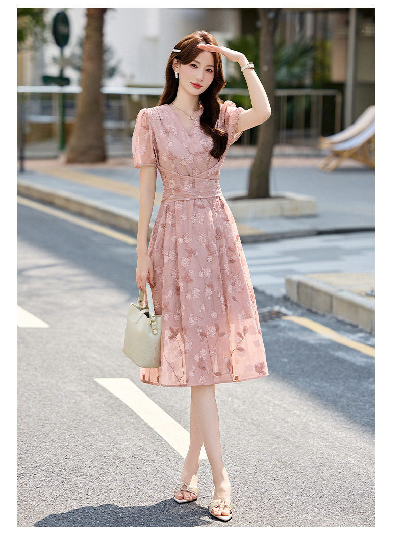 「自」全新升级【铂金会员257/天猫339/差价82】(15103)洛诗琳气质立体刺绣提花连衣裙女2026夏季新款V领收腰茶歇裙