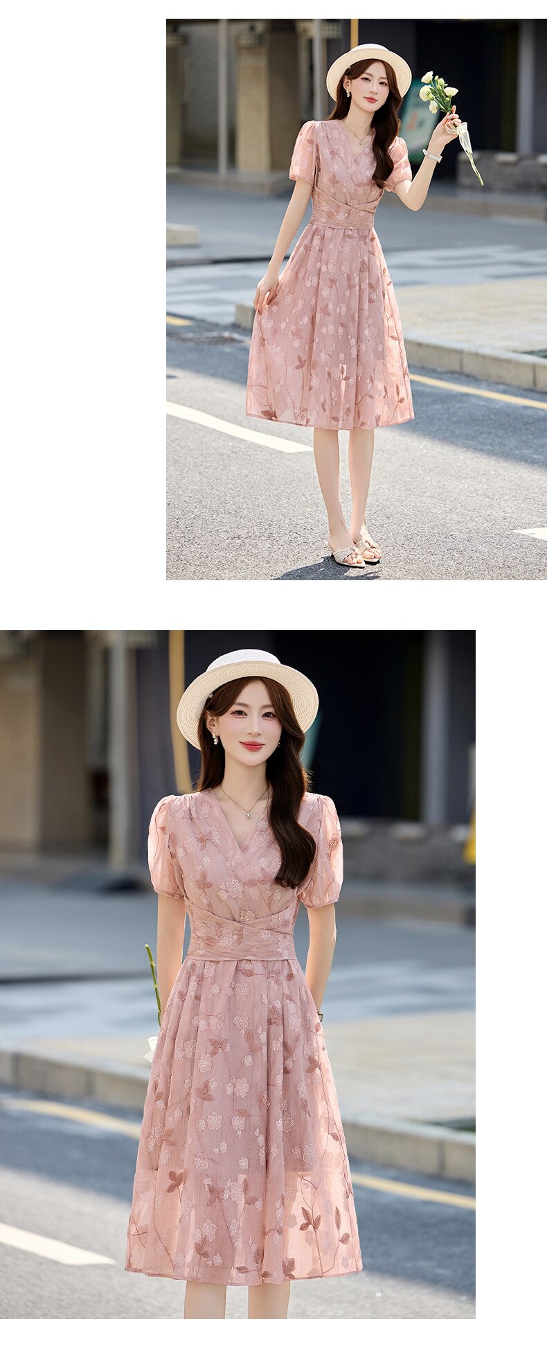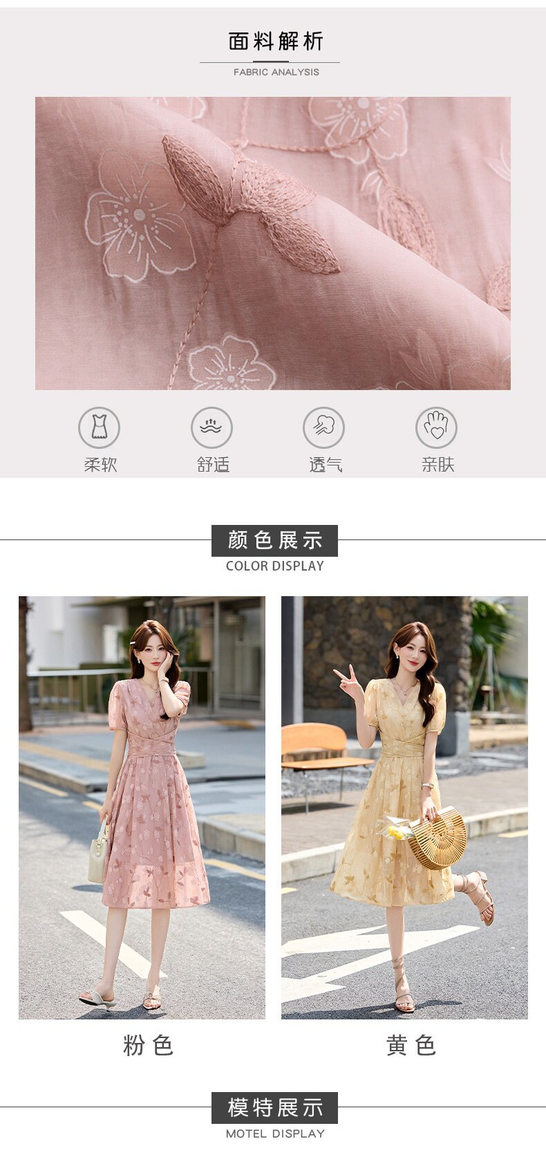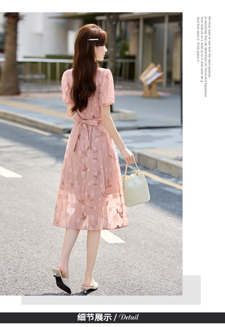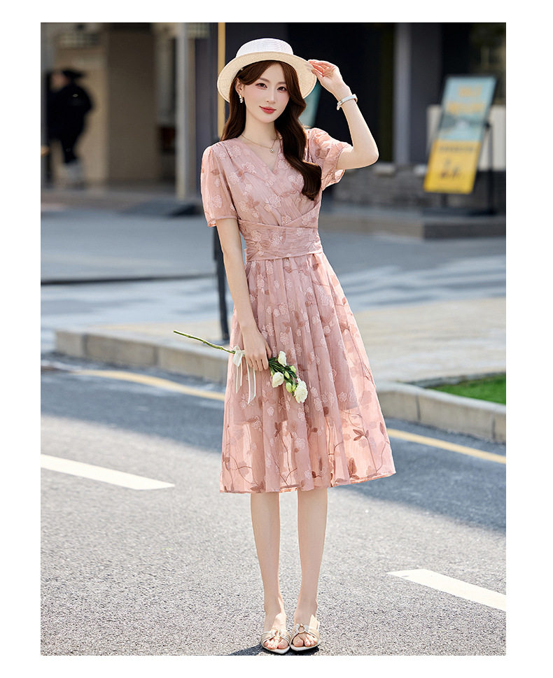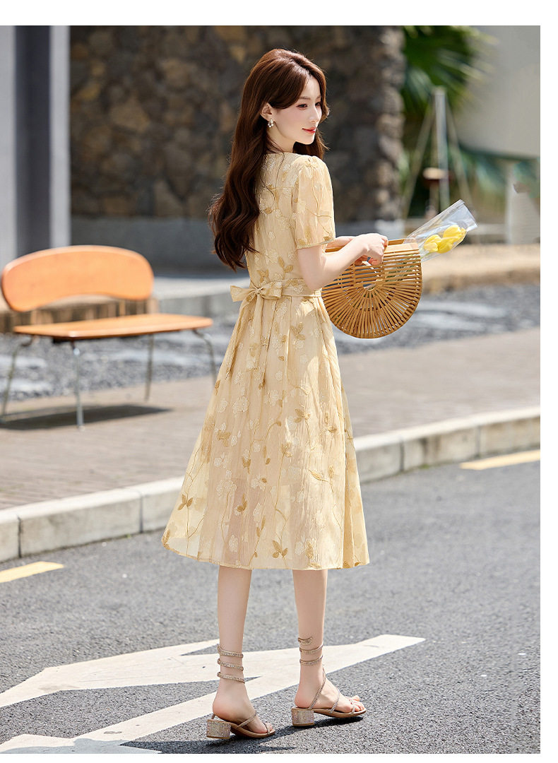 「自」全新升级【铂金会员257/天猫339/差价82】(15103)洛诗琳气质立体刺绣提花连衣裙女2026夏季新款V领收腰茶歇裙