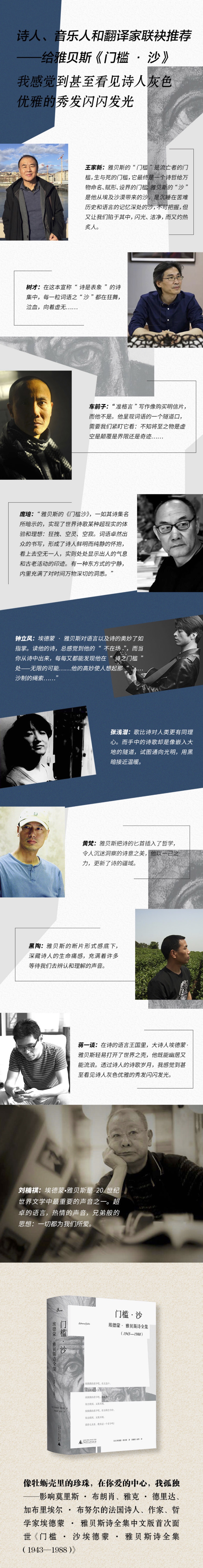 埃德蒙•雅贝斯(Edmond Jabès,1912-1991),法国当代著名诗人、作家、哲学家,犹太人,生于开罗,卒于巴黎,是二战后法国最著名的文学思想人物之一。雅贝斯1943年开始写诗,1959年出版第一部诗集《我构筑我的家园》,1967年成为在蒙特利尔世界博览会上展示其作品的四位法国作家之一(另三位是萨特、加缪和列维-斯特劳斯)。