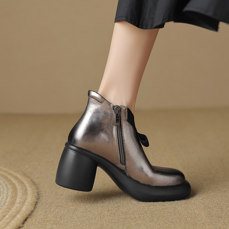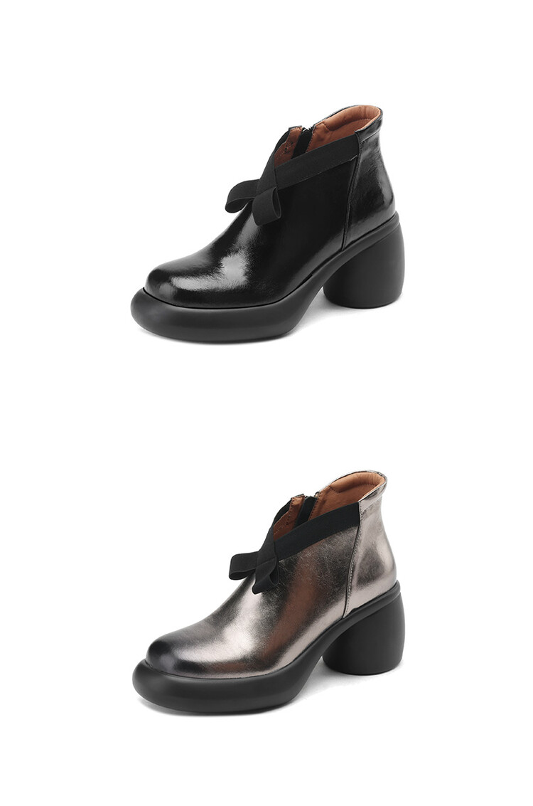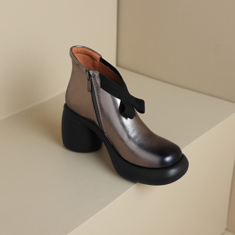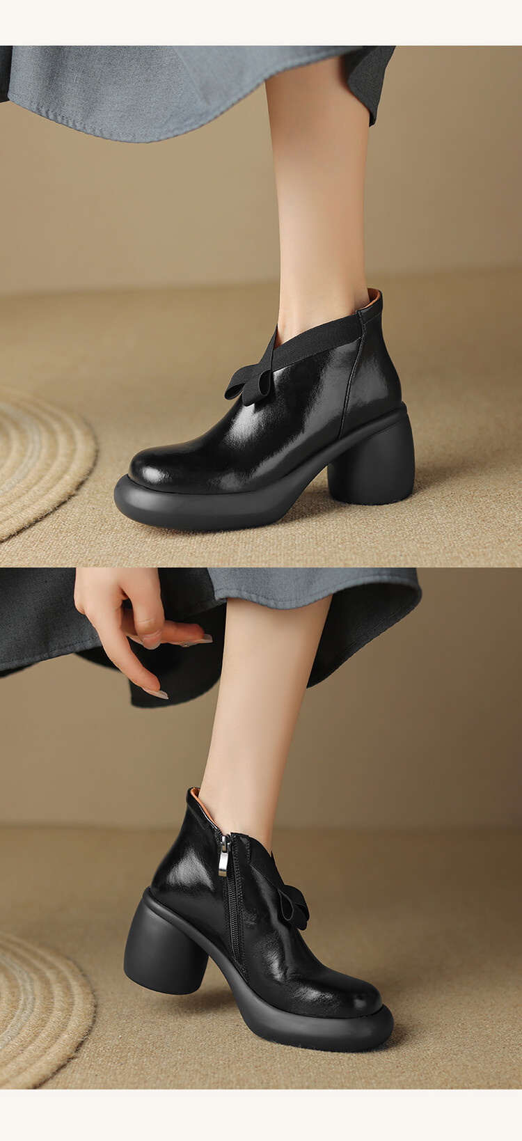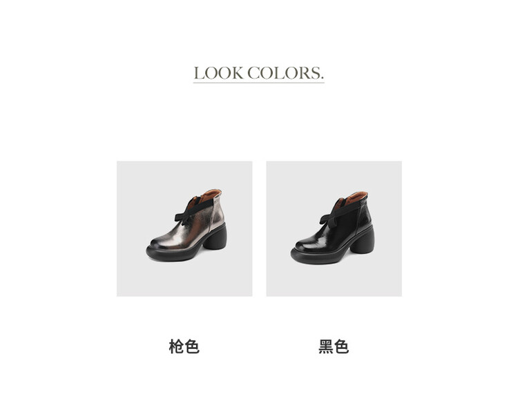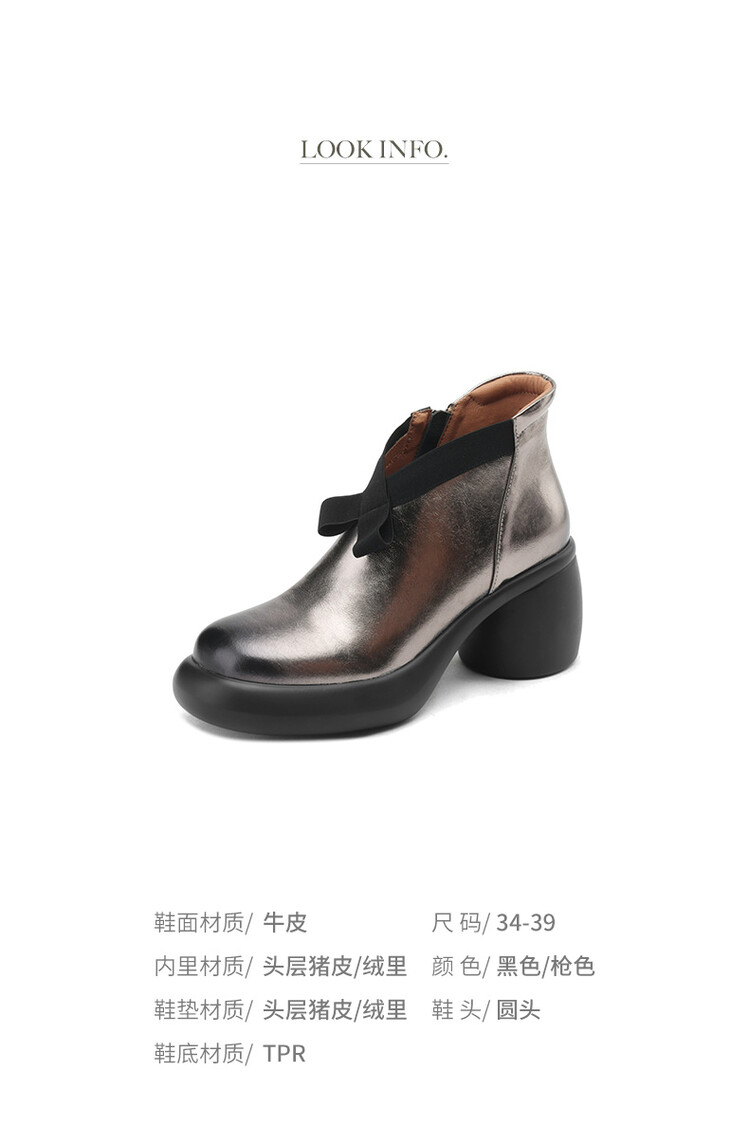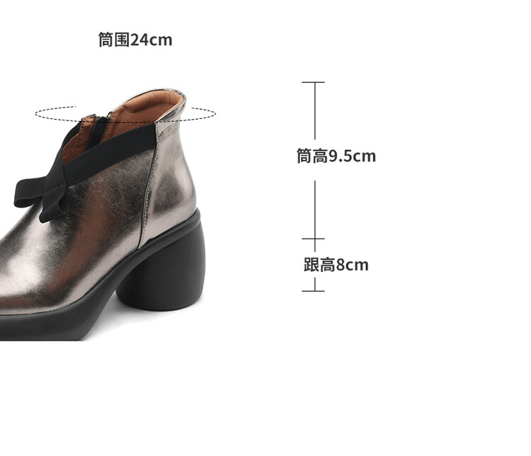 【预售5天】轻巧舒适圆头厚底蝴蝶结瘦瘦靴,真皮气质枪色粗跟高跟鞋短靴MDY&M508-3
