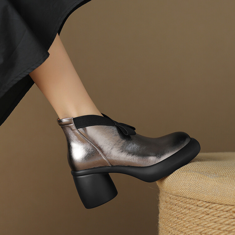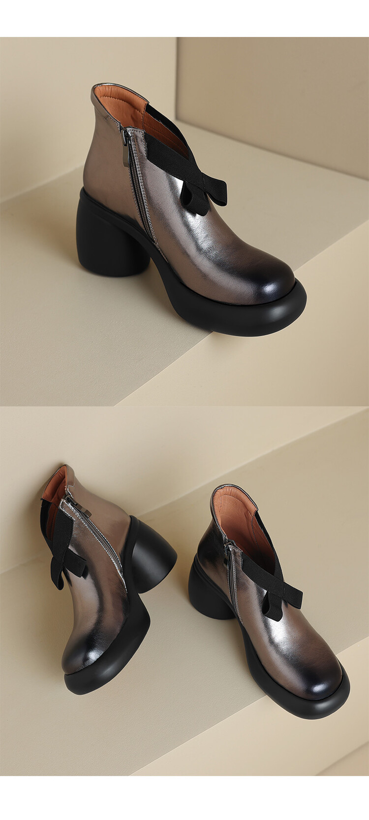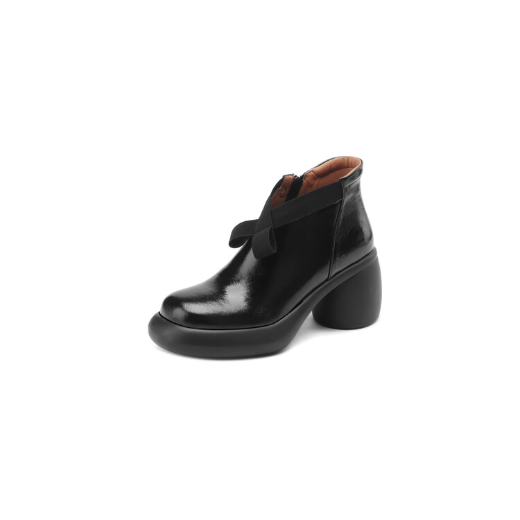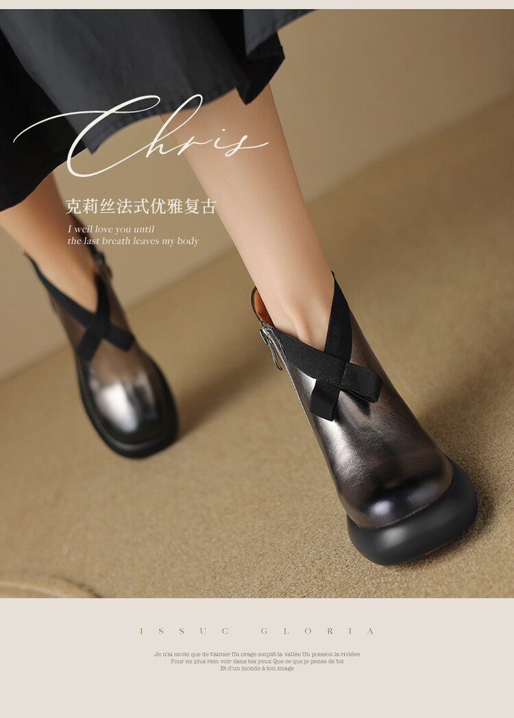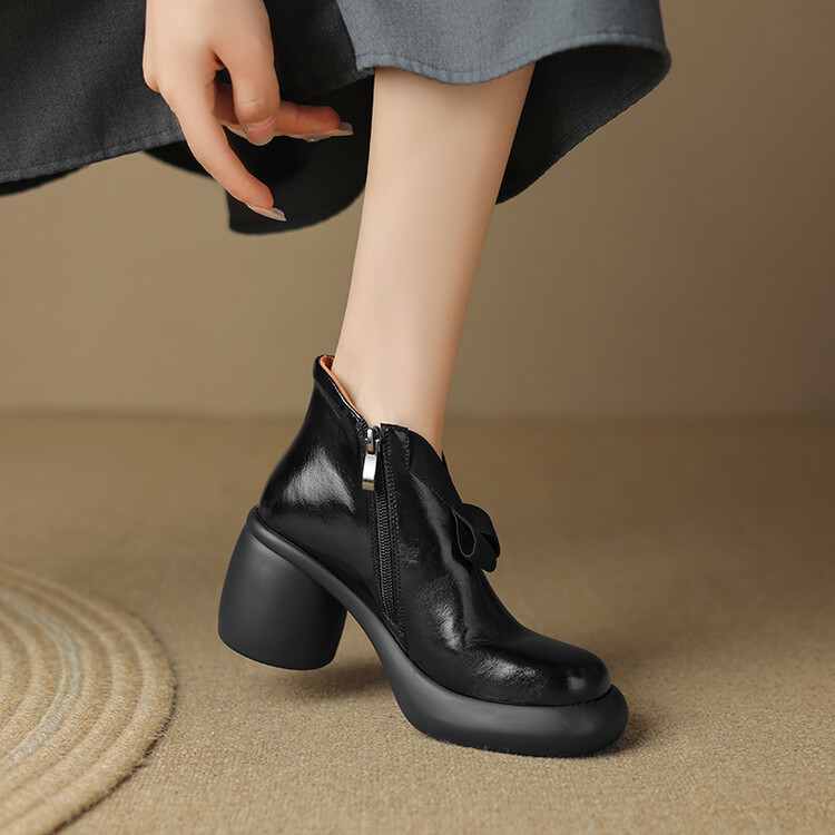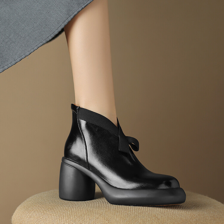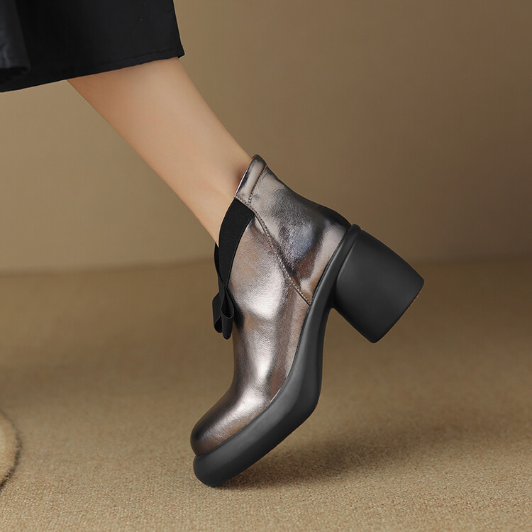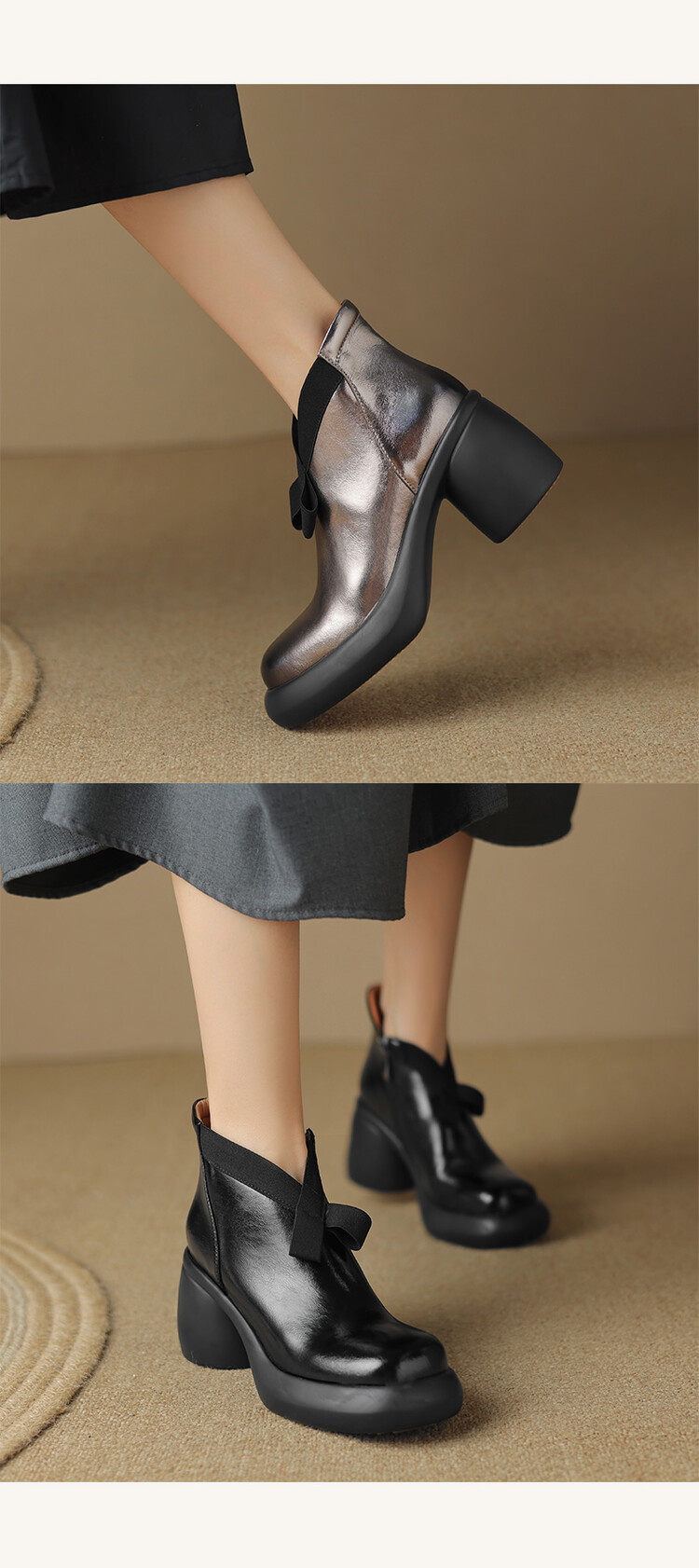 【预售5天】轻巧舒适圆头厚底蝴蝶结瘦瘦靴,真皮气质枪色粗跟高跟鞋短靴MDY&M508-3