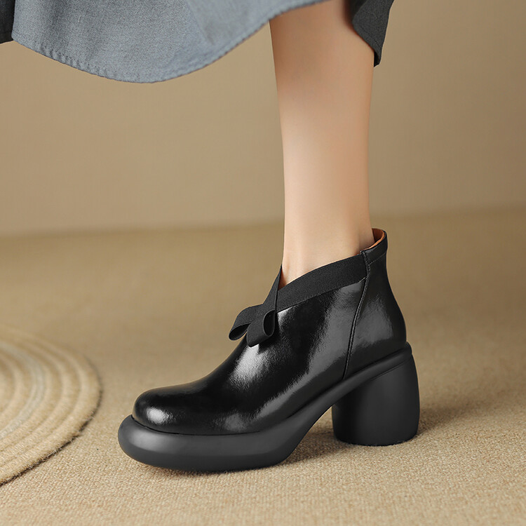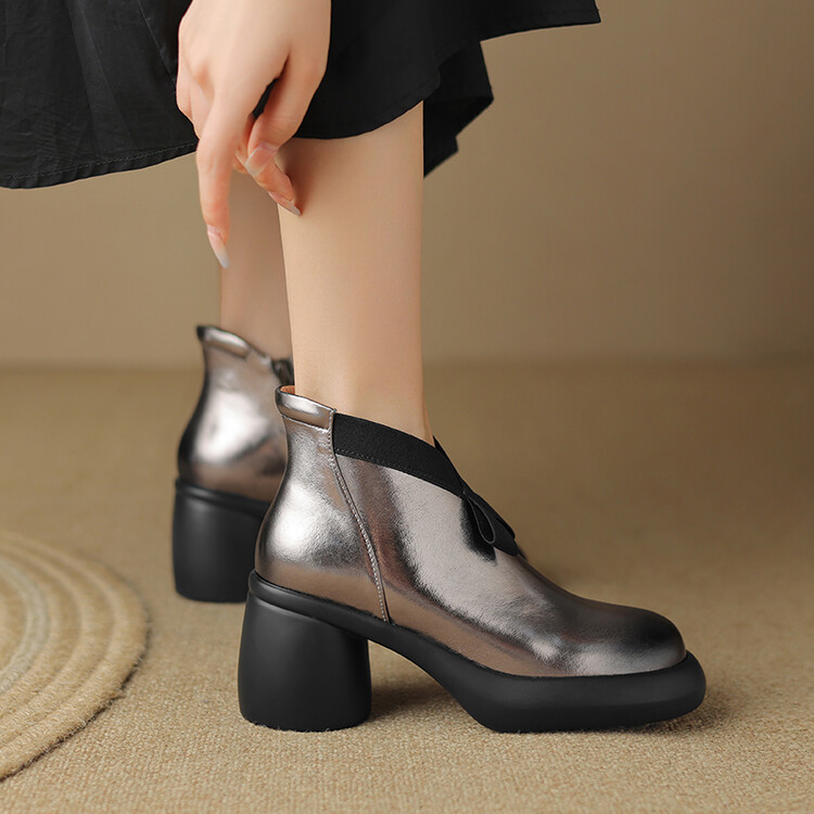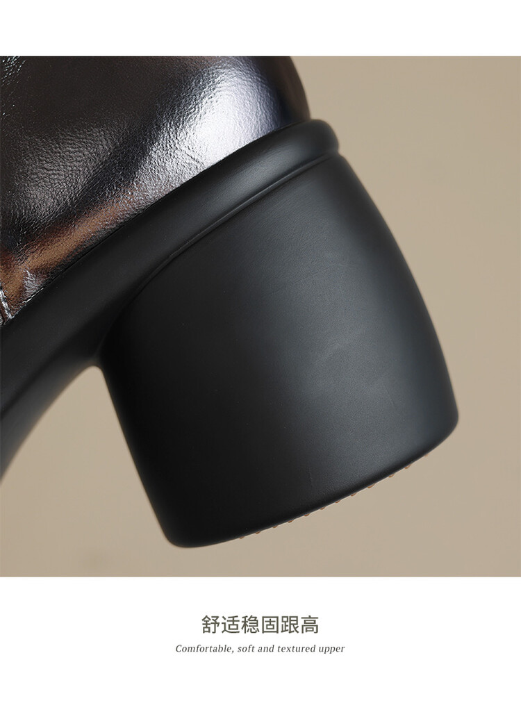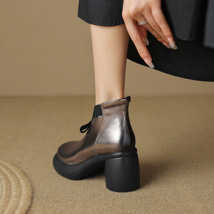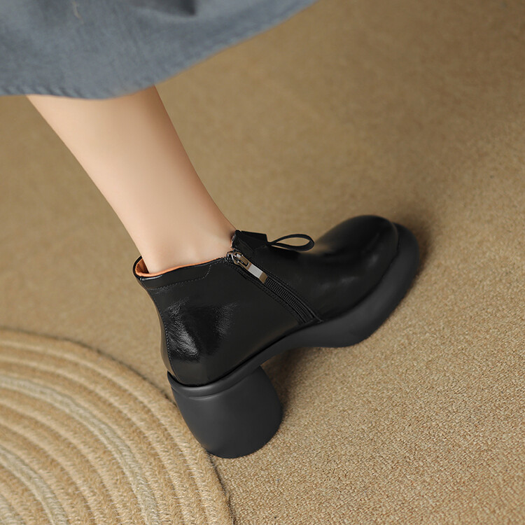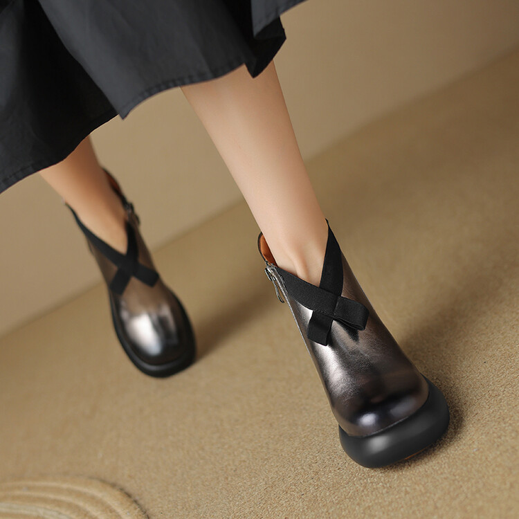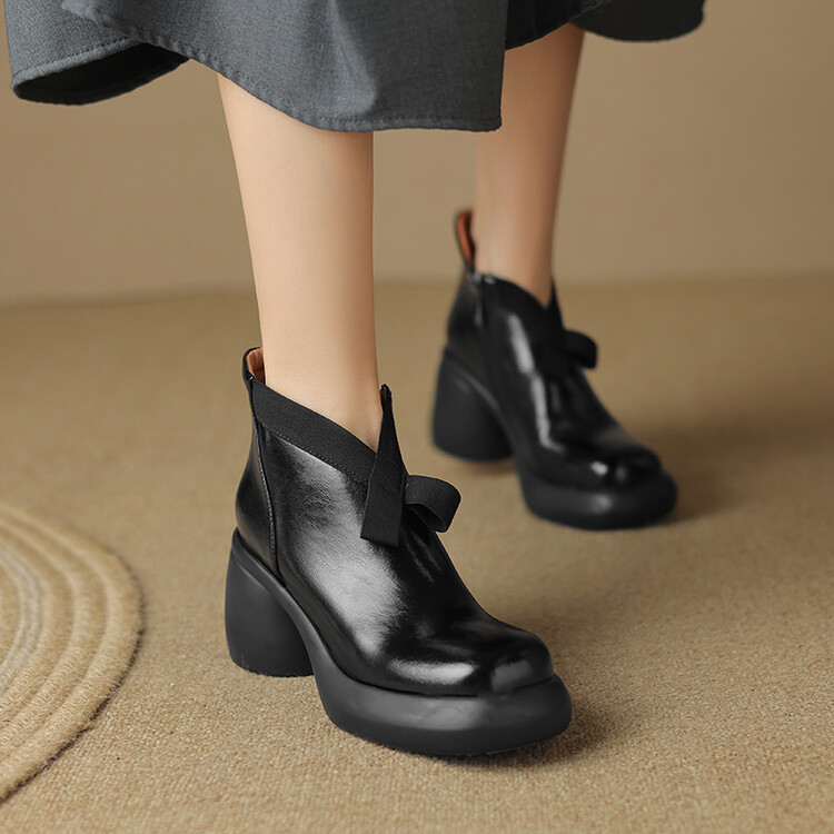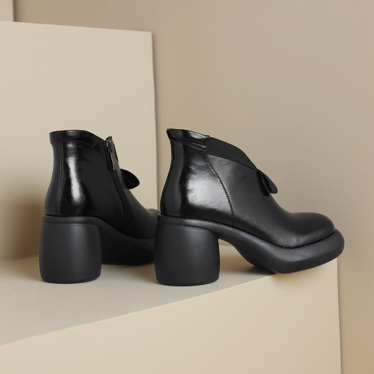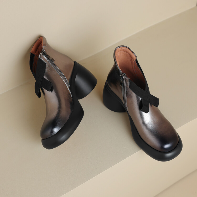 【预售5天】轻巧舒适圆头厚底蝴蝶结瘦瘦靴,真皮气质枪色粗跟高跟鞋短靴MDY&M508-3