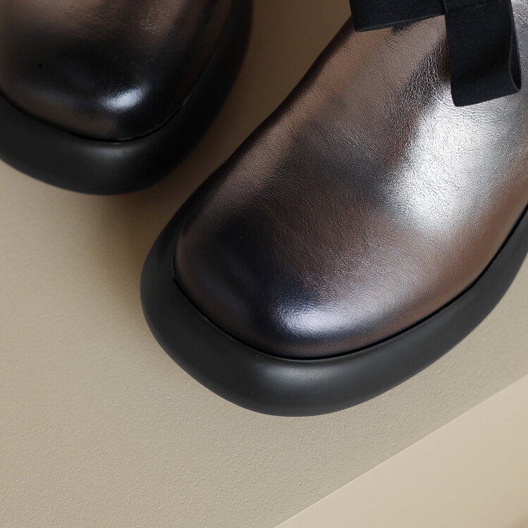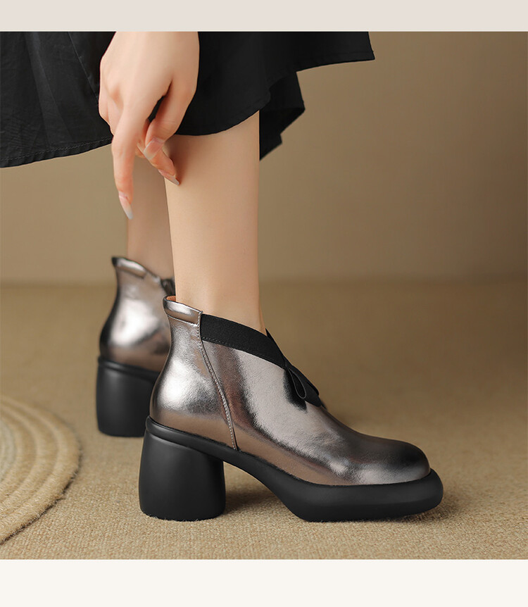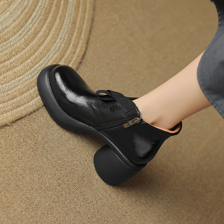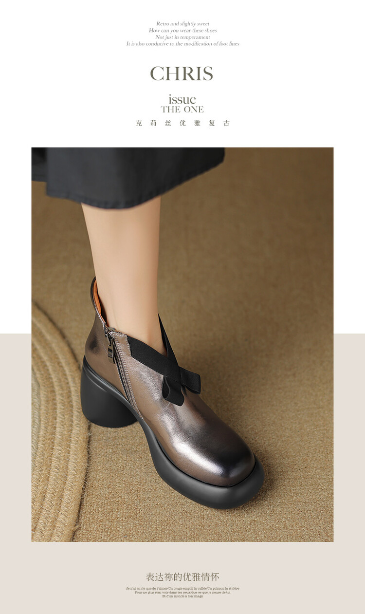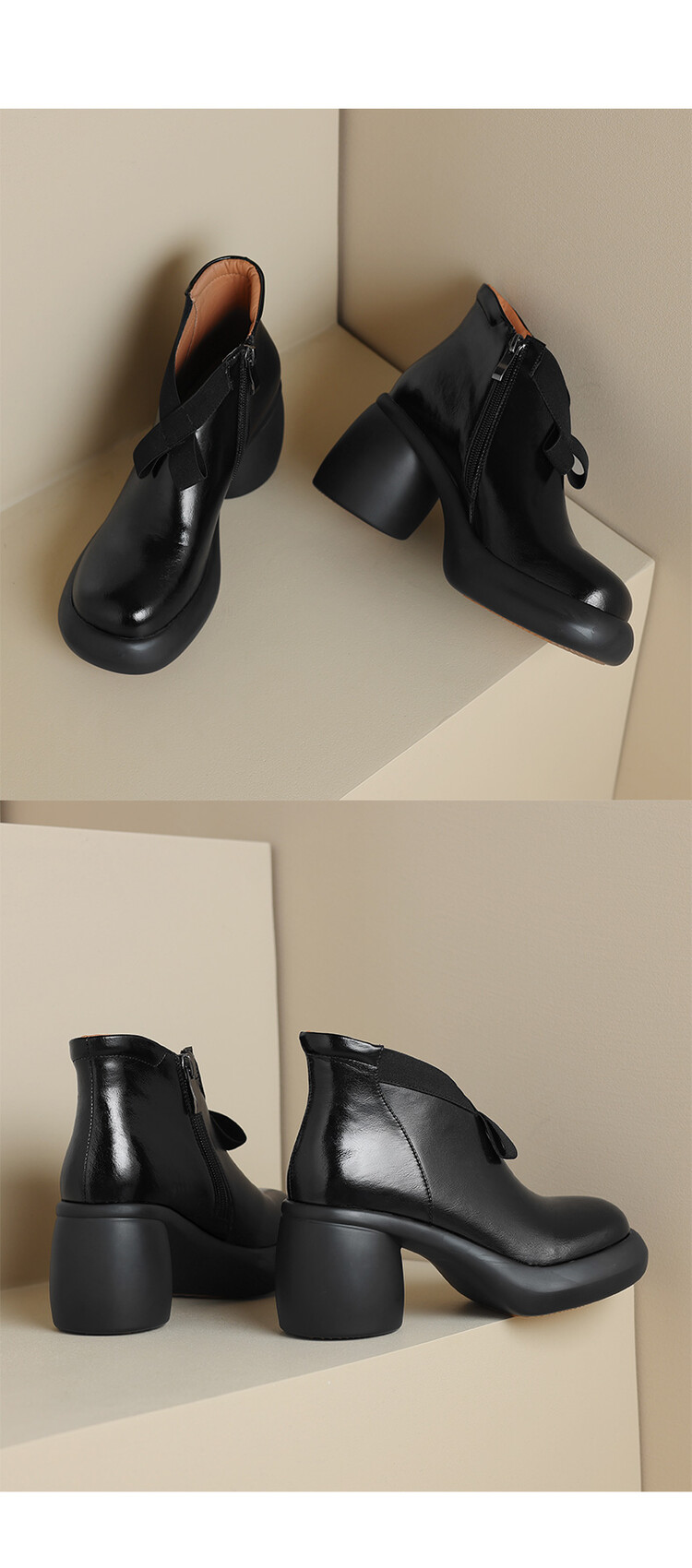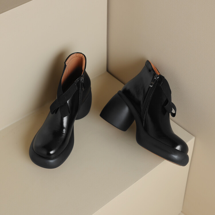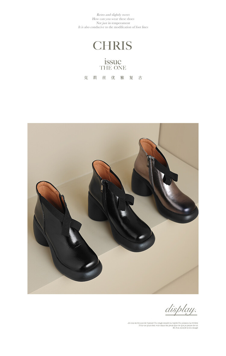 【预售5天】轻巧舒适圆头厚底蝴蝶结瘦瘦靴,真皮气质枪色粗跟高跟鞋短靴MDY&M508-3