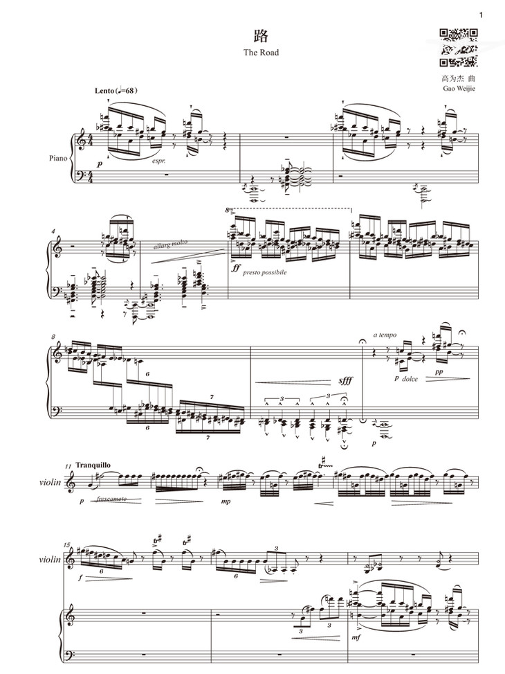 本书为“中国当代作曲家曲库”丛书之一,是中国当代著名作曲家高为杰专门为小提琴与钢琴创作的新作品。《路》原是为琵琶与钢琴而作,完成于1996年初,同年5月首演于日本东京,后改为小提琴与钢琴的版本在韩国岭南国际现代音乐节上首演。《路》以自由的奏鸣曲式写成。在这部作品中,作曲家在音高体系设计上作了颇为大胆的尝试,采用了其独创的“非八度循环”周期人工音阶。所谓“非八度循环”即完全跳出以12个半音为一个模式进行循环的自然音阶的法则,不以通常的八度为周期重复关系。作曲家在这首乐曲采用的是以 11 个半音为模式的人工音阶。本书附加有音频二维码,可以让读者在研读乐谱的同时,直接感受作品的音响魅力。该书可以用于音乐院校的音乐学系、作曲系师生研究当代作曲家新作品使用,也可以作为中国当代作曲家曲库的典藏作品。