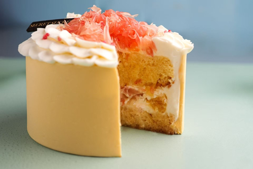 蛋糕中间香缇奶油夹层部分也放入了大量的新鲜果肉:泰国红宝石柚子和新奇士橙肉,加了一点澳大利亚手指柠檬提味。