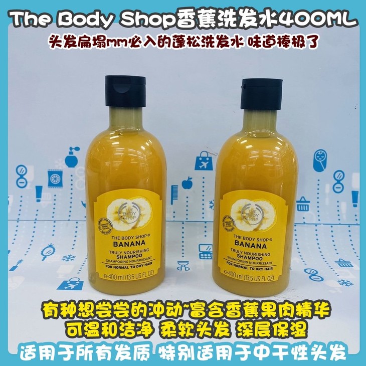 The Body Shop香蕉洗发水400ML👍头发扁塌mm必入的蓬松洗发水🉐。味道棒极了,有种想尝尝的冲动~富含香蕉果肉精华🍌,可温和洁净、柔软头发,深层保湿💦,洗完后使头发表面柔亮、滑顺。其泡沫柔细可保护秀发☁,避免再次受到损害。有效彻底清洁头发,搭配护发素更佳哦👏!适用于所有发质,特别适用于中干性头发,孕妇可用✅。