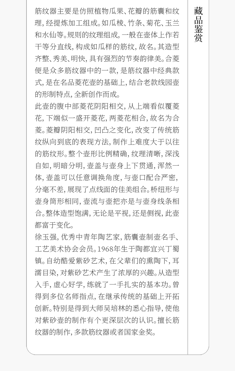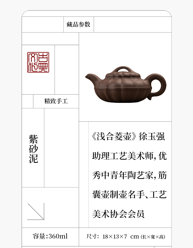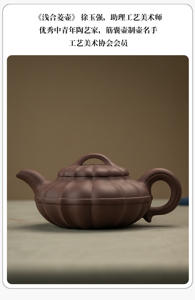 《浅合菱壶》 徐玉强,助理工艺美术师,优秀中青年陶艺家,筋囊壶制壶名手、工艺美术协会会员