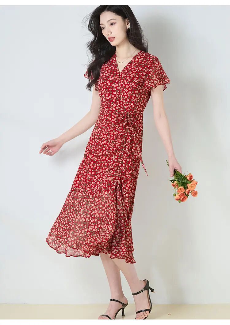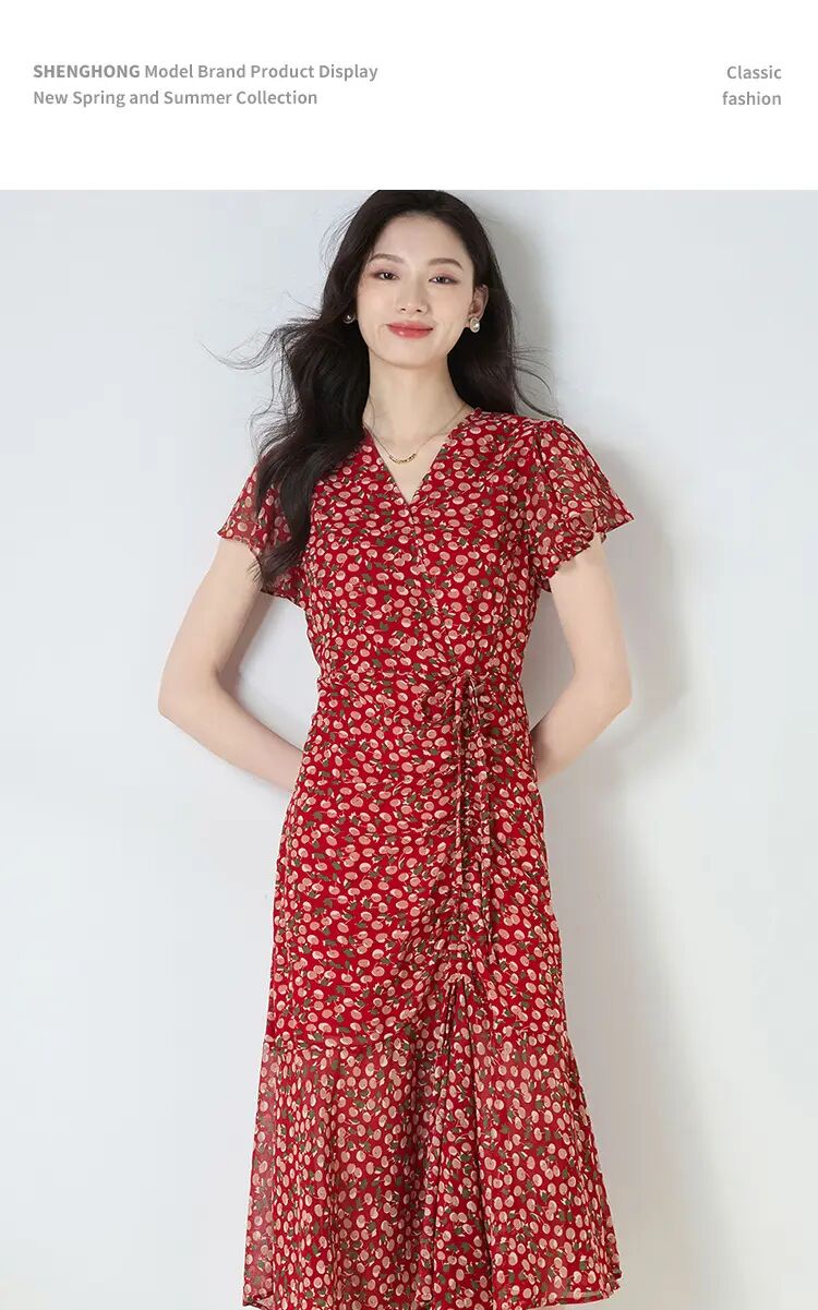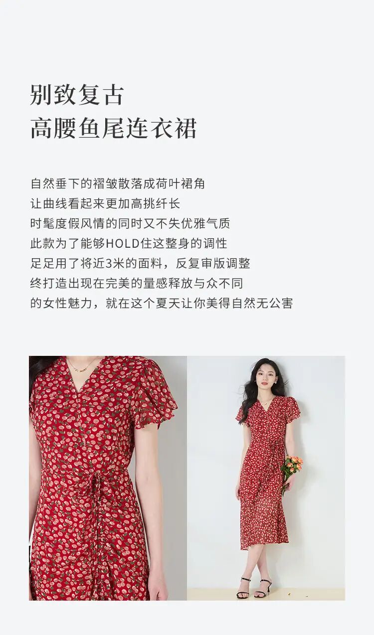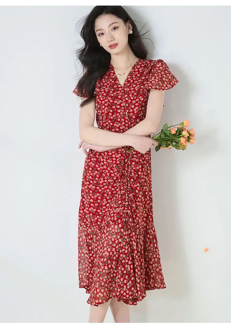 「高货sh」全新升级【铂金会员266/天猫359/差价93】(01859)洛诗琳夏季新款法式清新抽褶鱼尾碎花V领显瘦中长款连衣裙01859