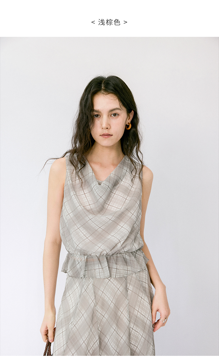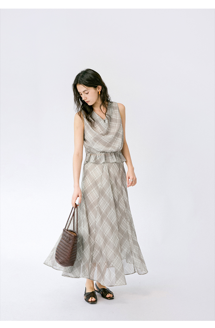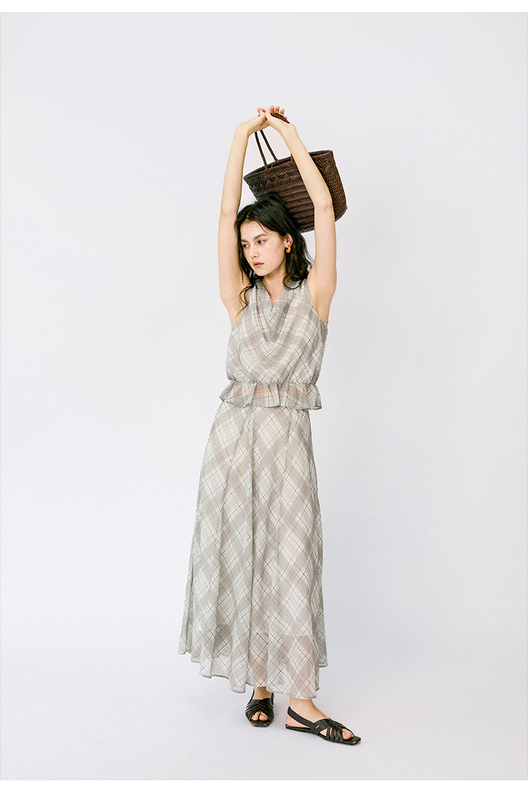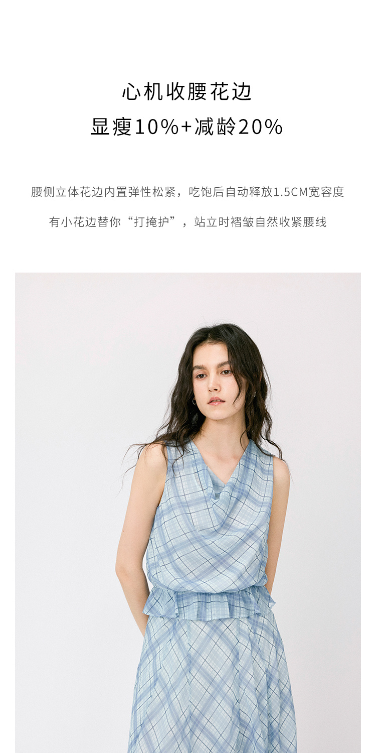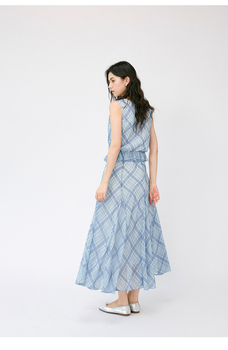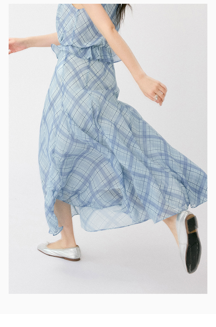 (小眠专属)HeyDress法式格纹气质套装女夏季荡领花边上衣高腰立体斜裁半身裙