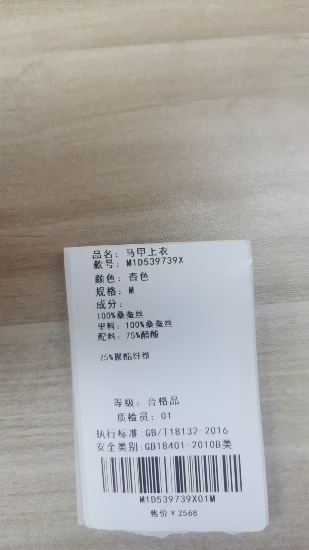 面料:100%桑蚕丝 里料:100%桑蚕丝 配料:75%醋酸 25%聚酯纤维