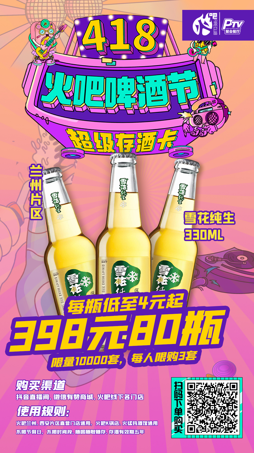 兰州片区-4月18日火吧啤酒节—超值存酒卡来了—398元80瓶雪花纯生啤酒