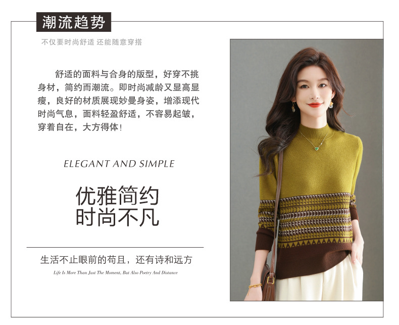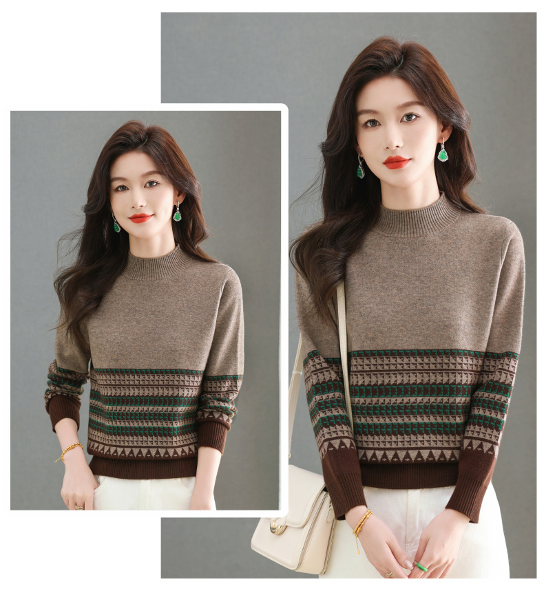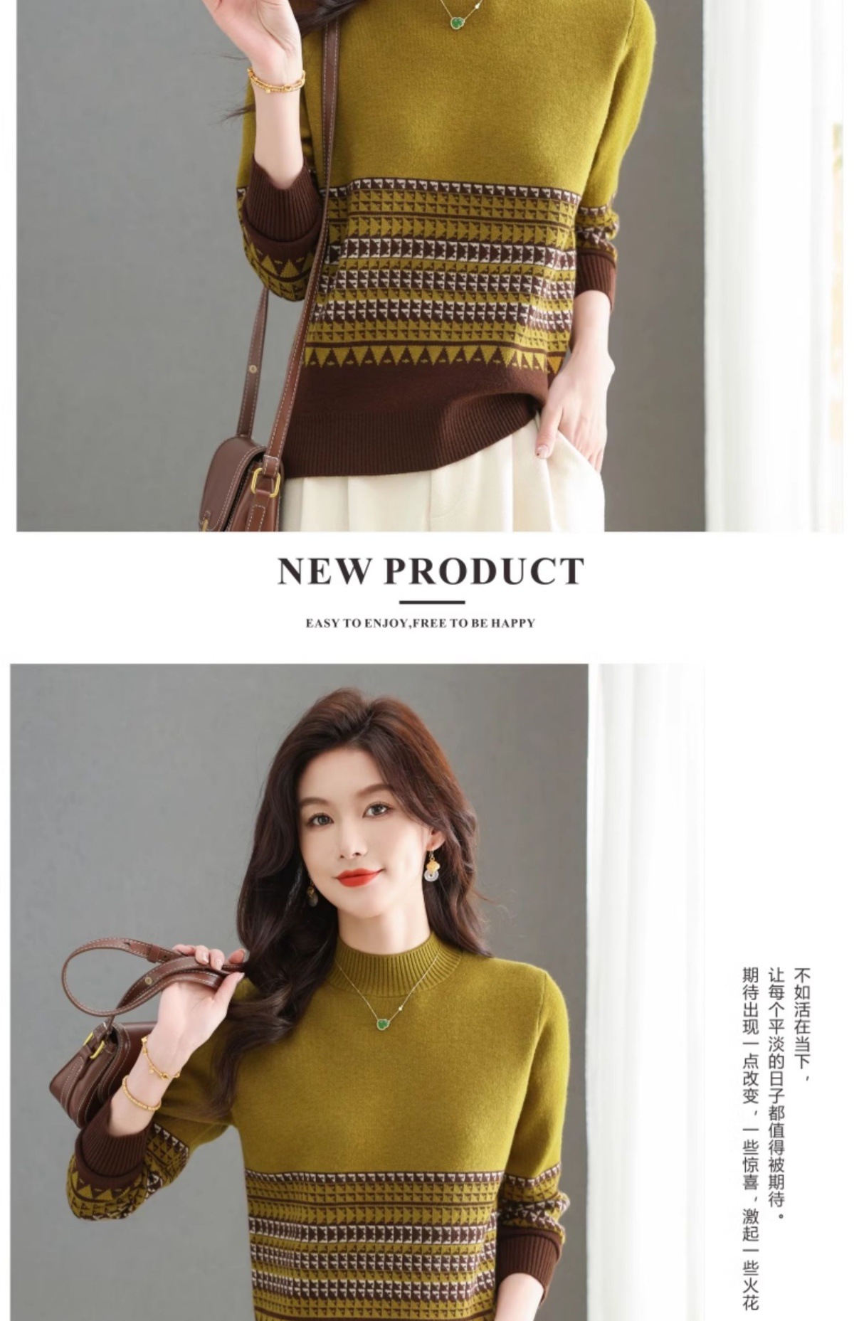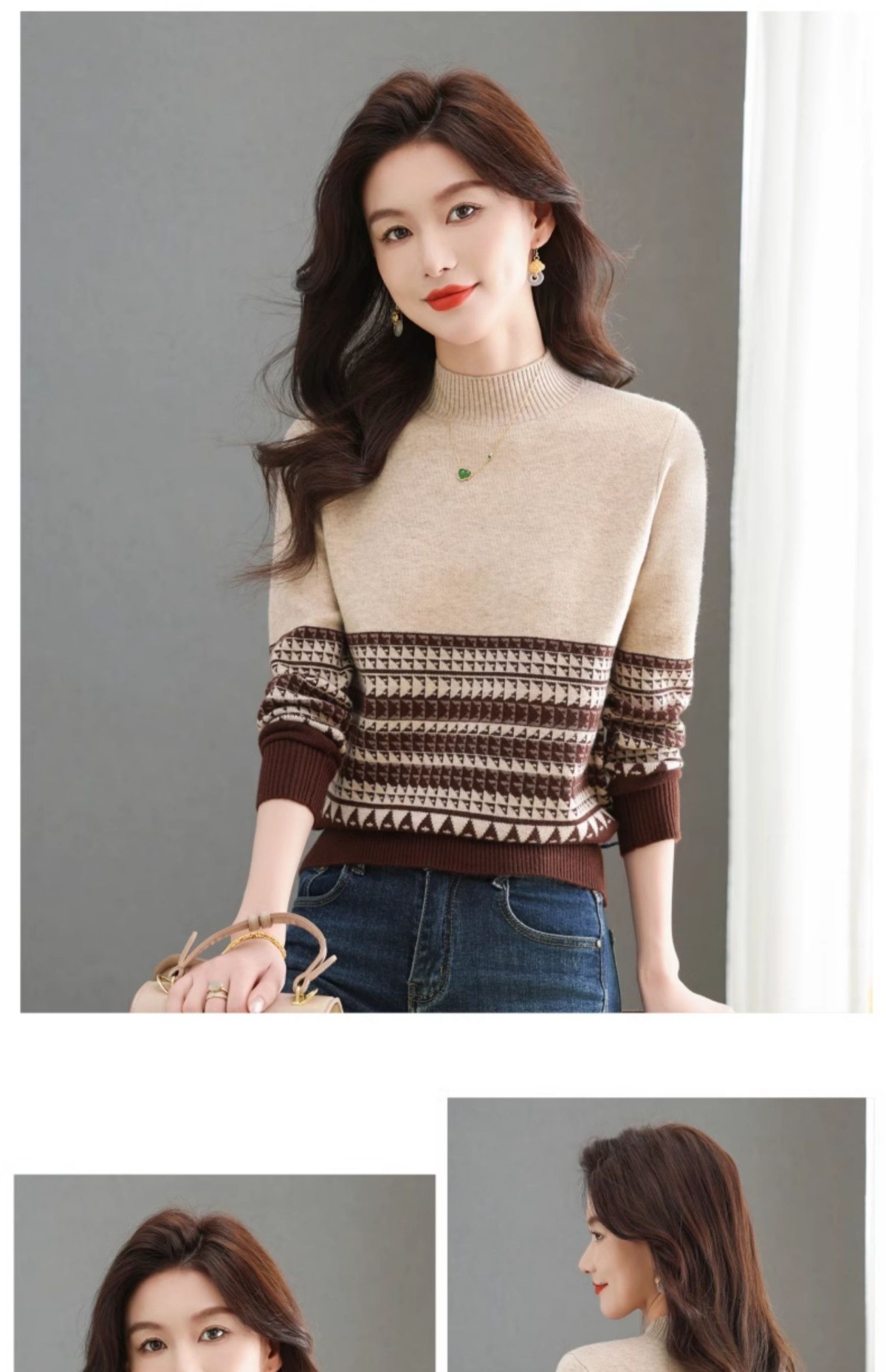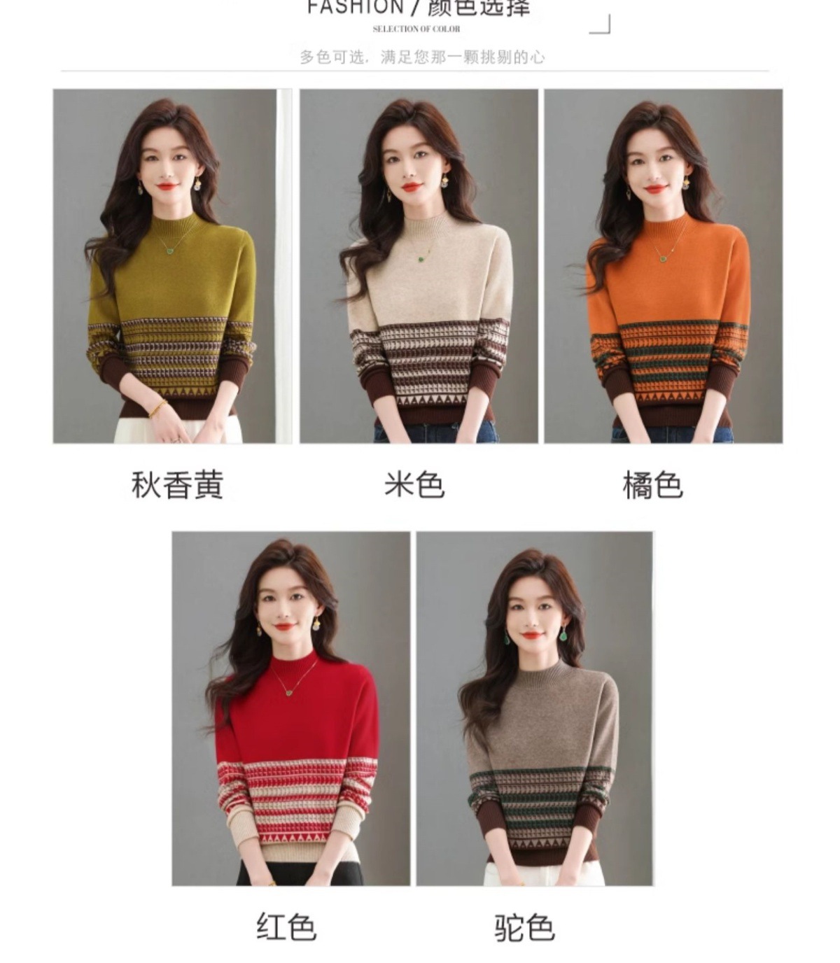 CC-101-98966半高领女士毛衣秋冬季新款拼色慵懒风上衣条纹软糯内搭针织打底衫