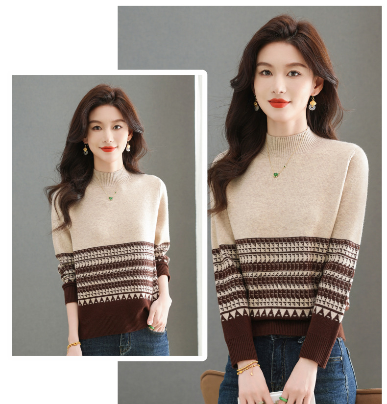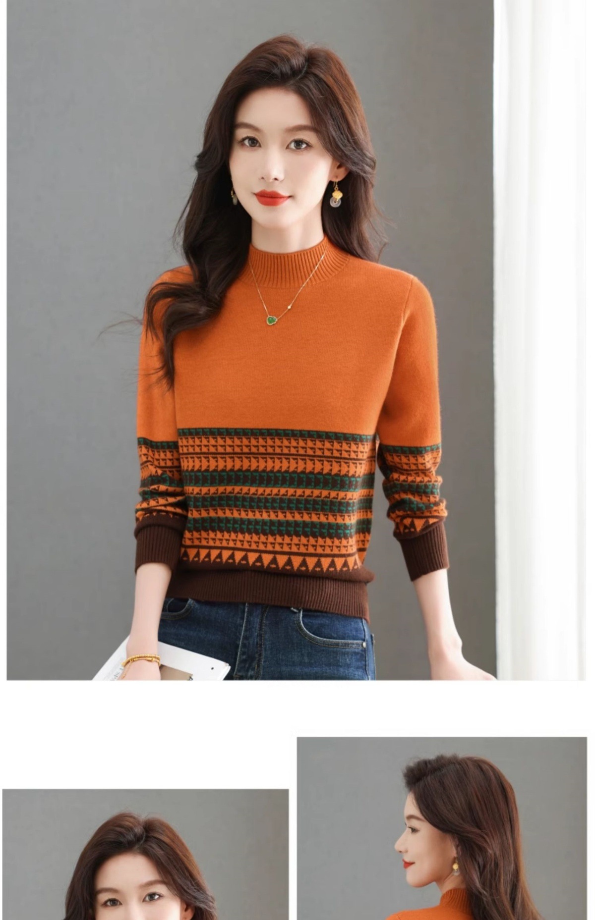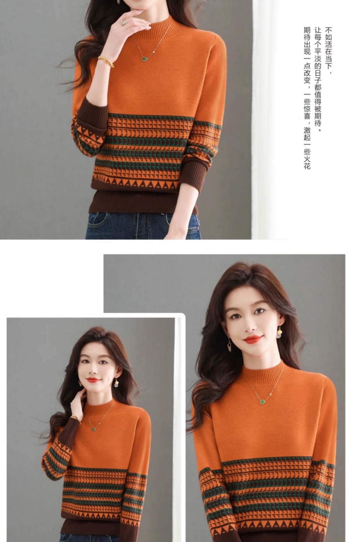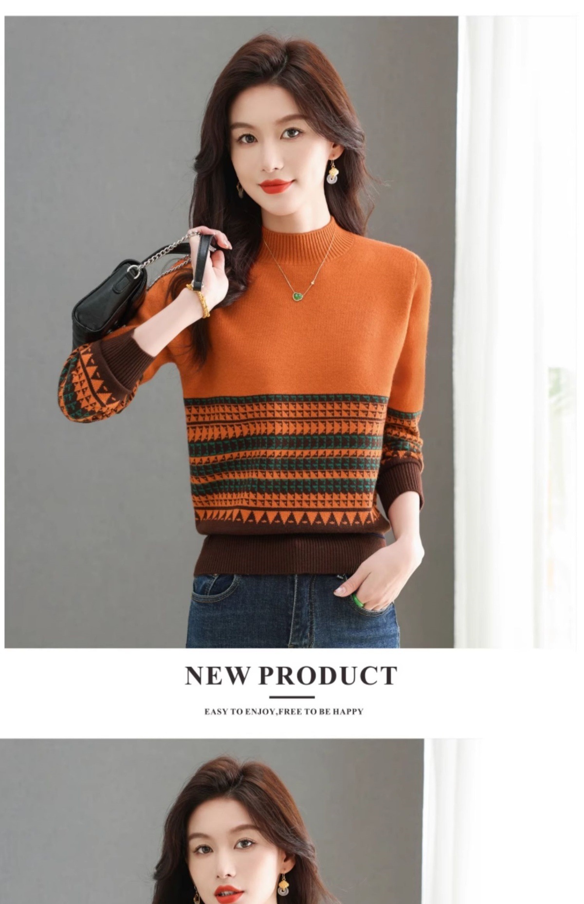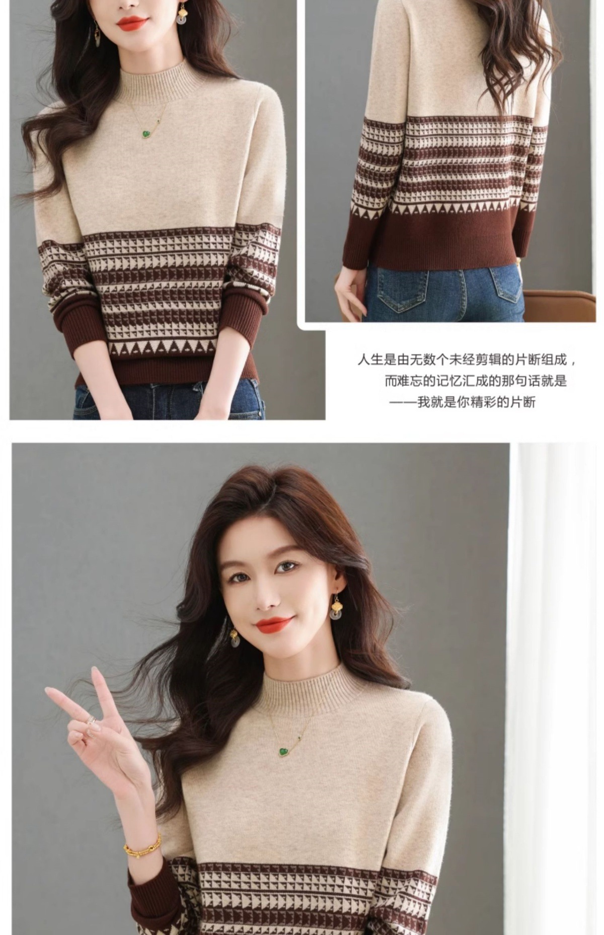 CC-101-98966半高领女士毛衣秋冬季新款拼色慵懒风上衣条纹软糯内搭针织打底衫
