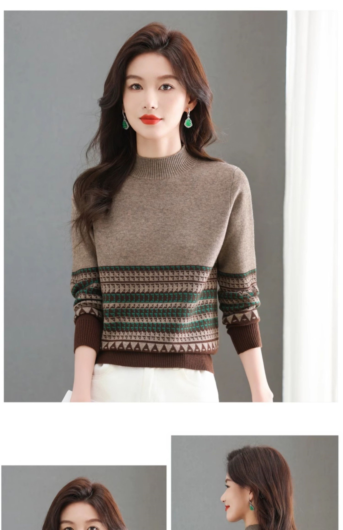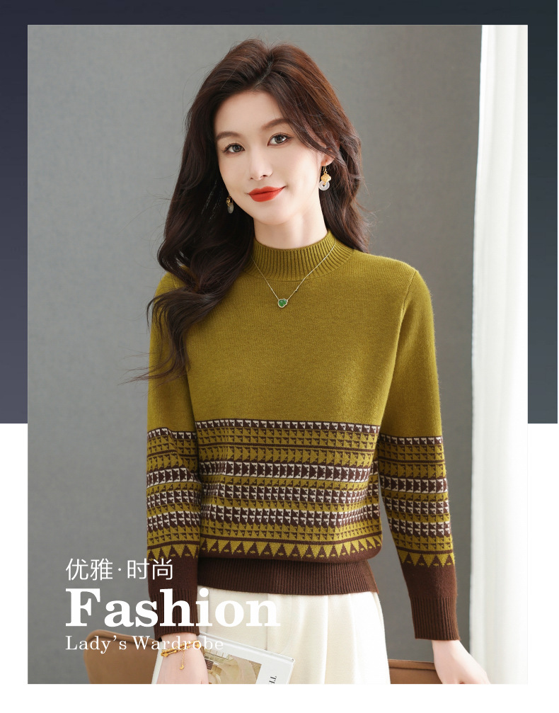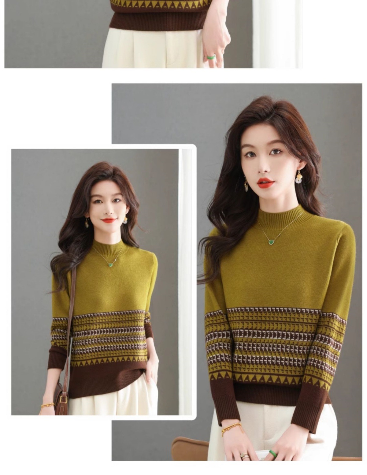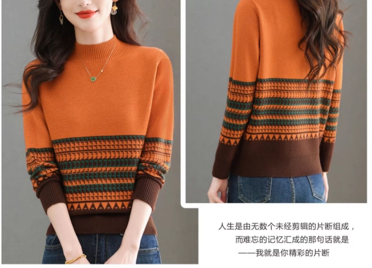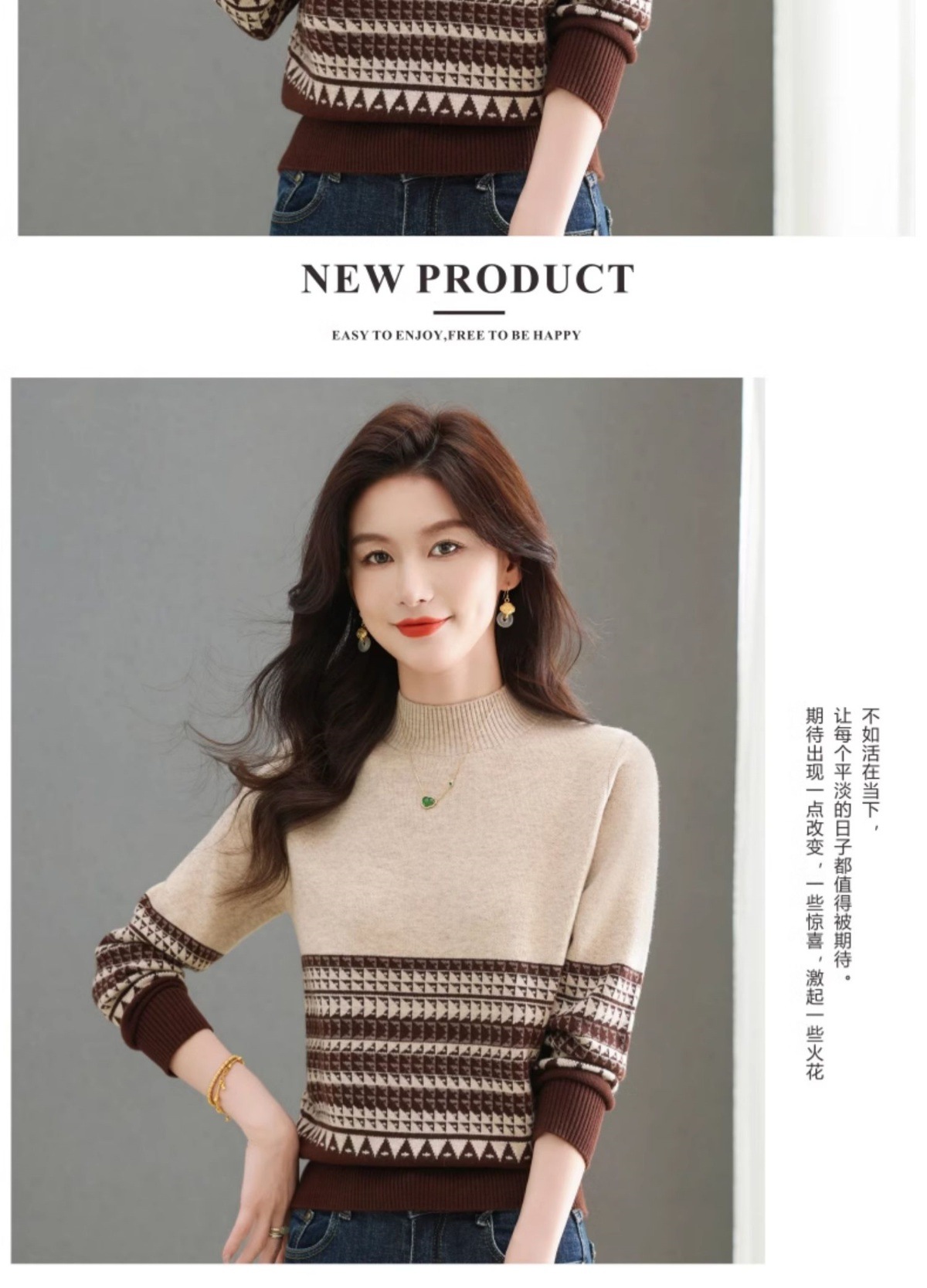CC-101-98966半高领女士毛衣秋冬季新款拼色慵懒风上衣条纹软糯内搭针织打底衫