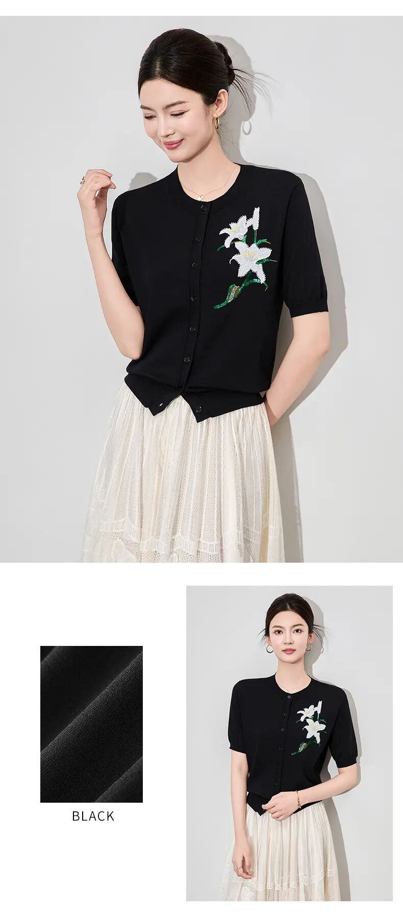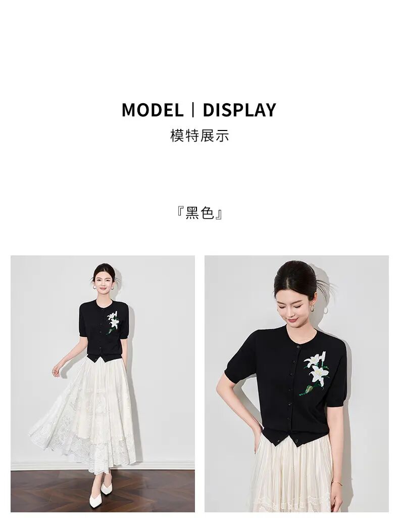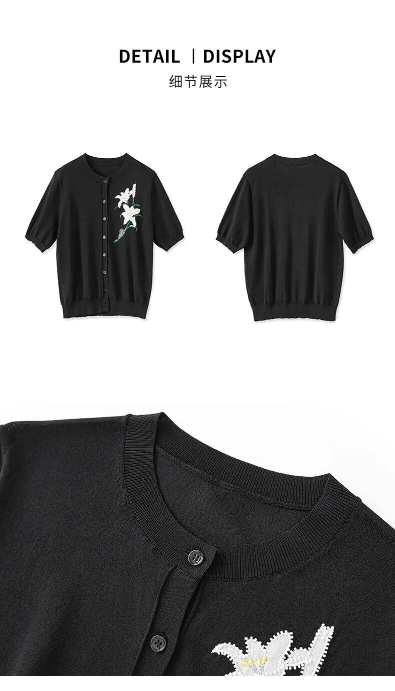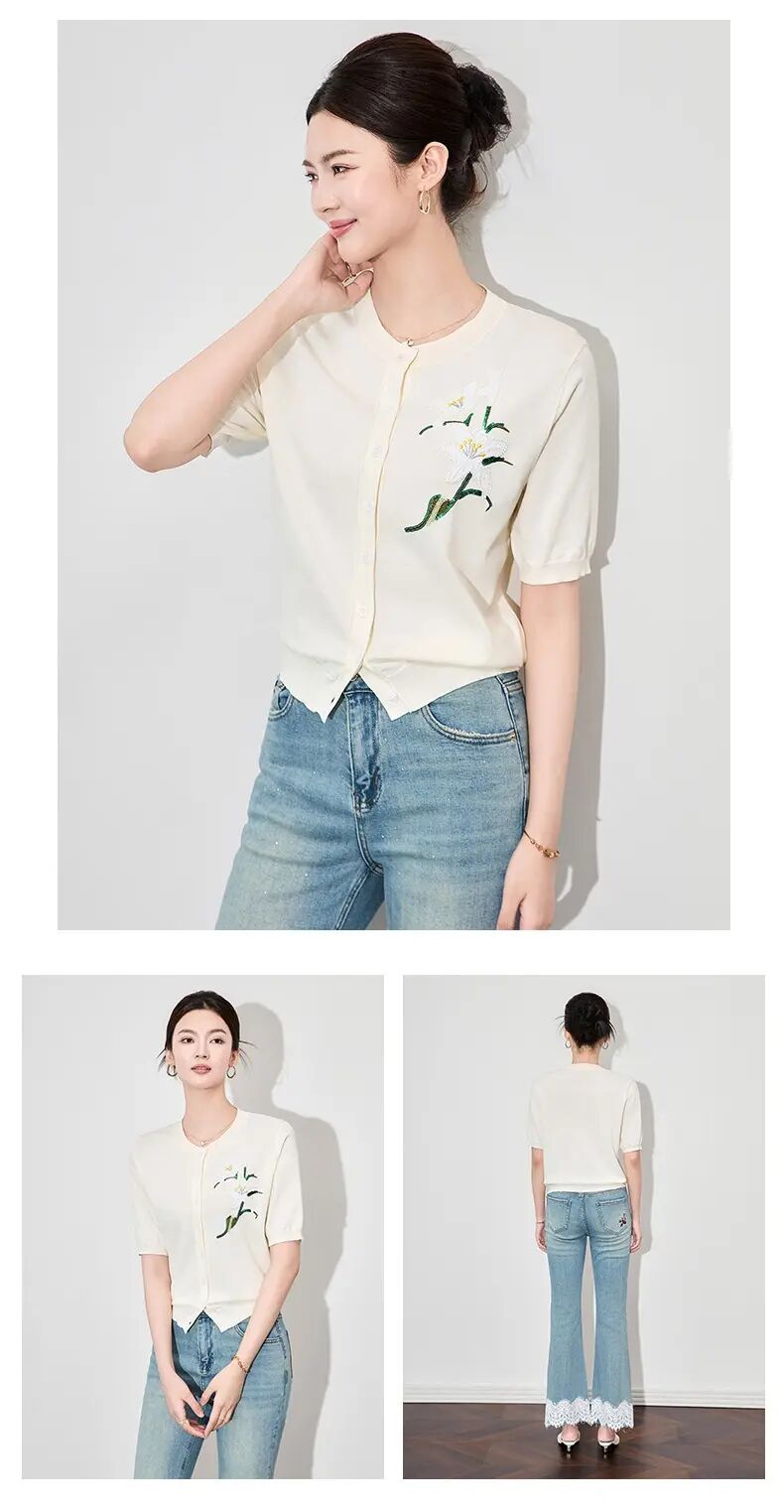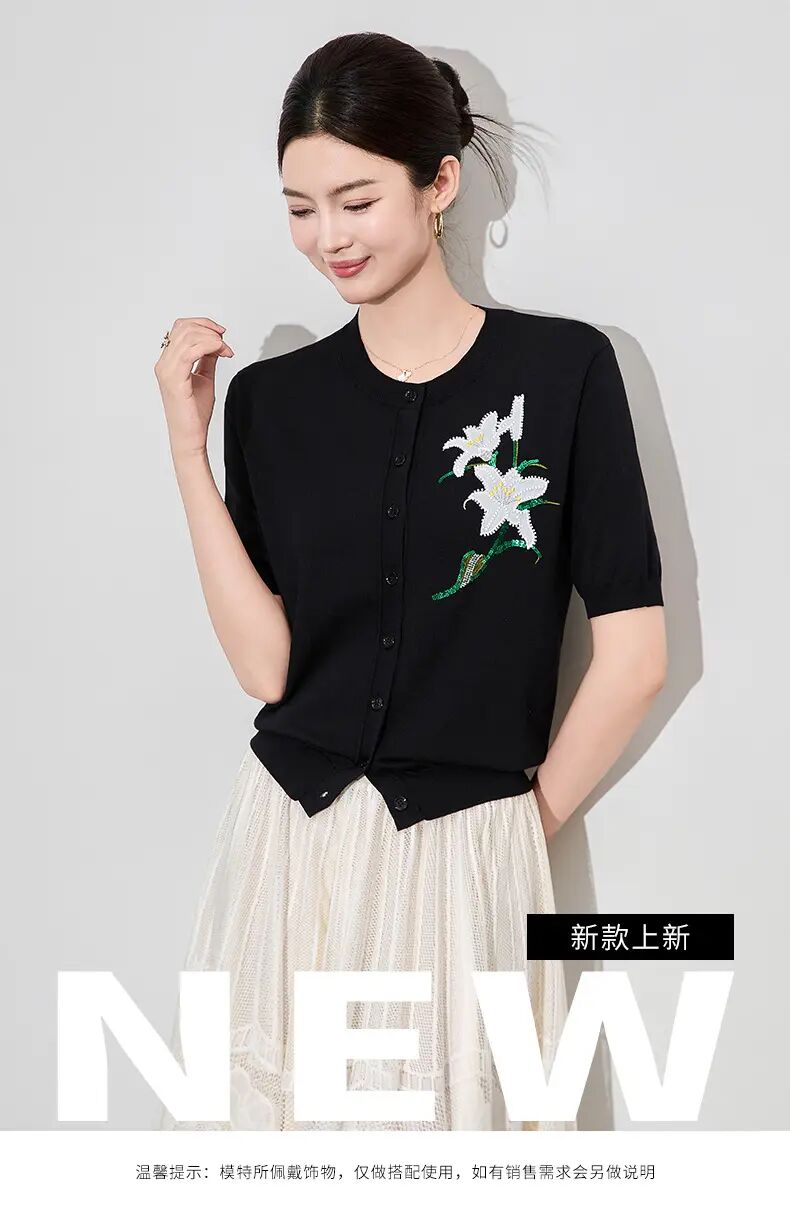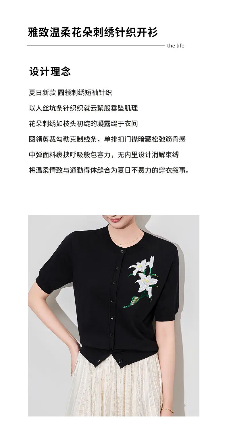 【高货wl】全新升级【铂金会员220/天猫289/差价69】(11341) 洛诗琳雅致温柔花朵刺绣圆领针织开衫休闲通勤短袖上衣女