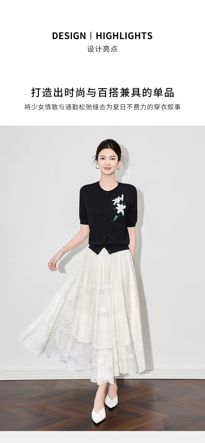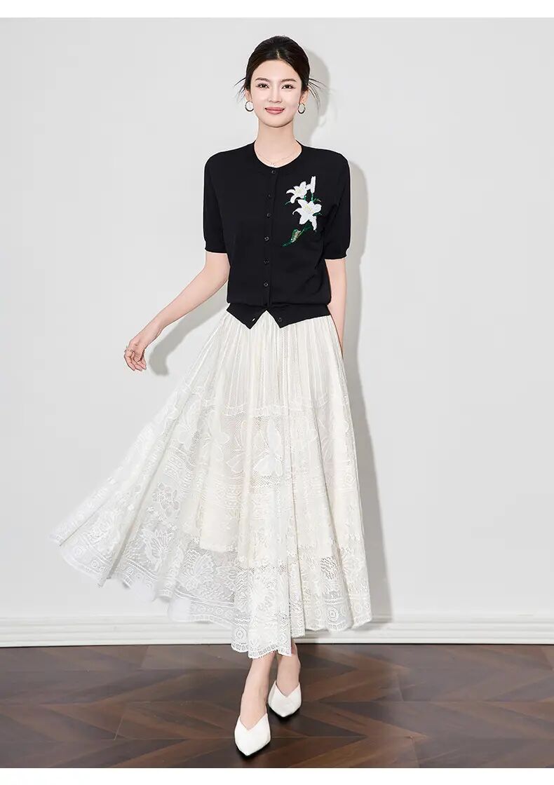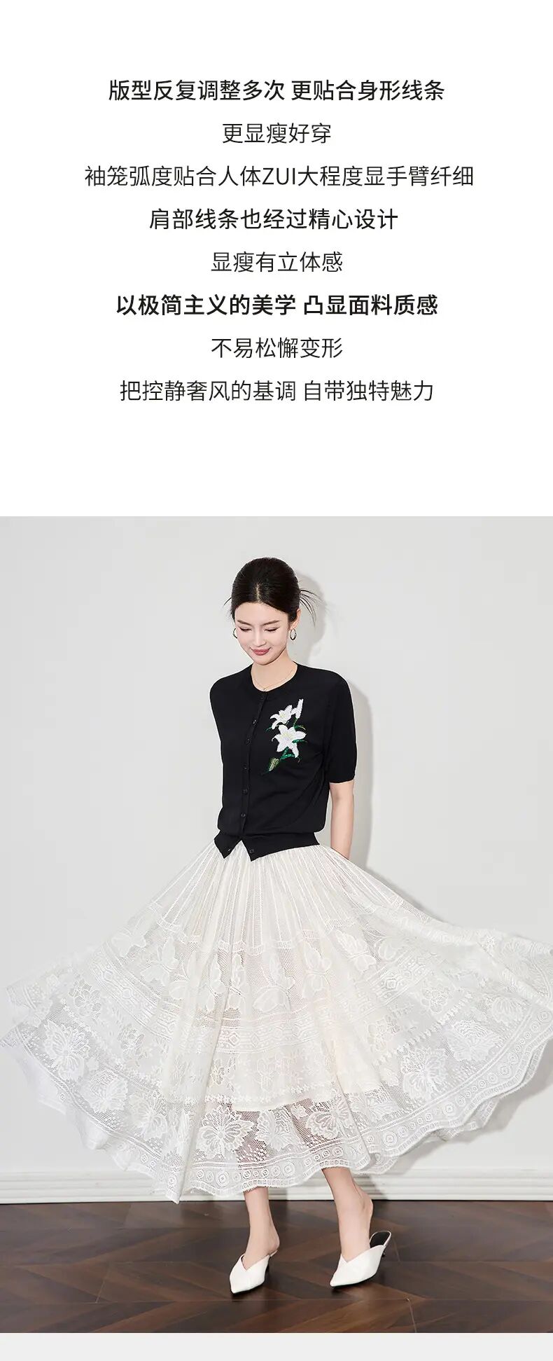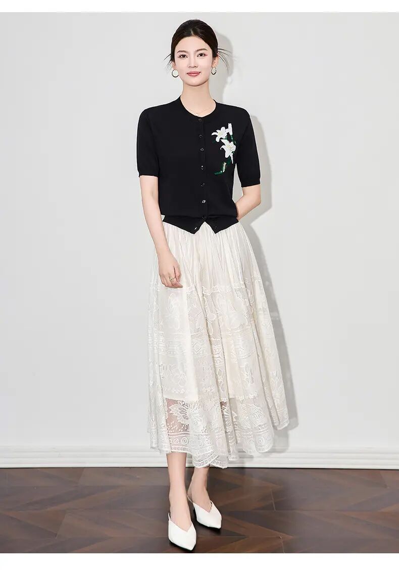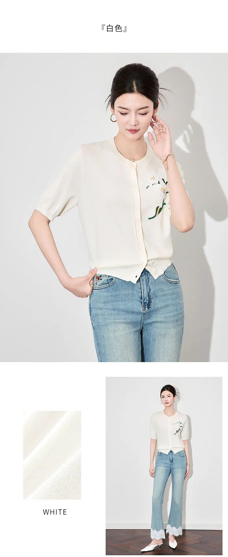 【高货wl】全新升级【铂金会员220/天猫289/差价69】(11341) 洛诗琳雅致温柔花朵刺绣圆领针织开衫休闲通勤短袖上衣女