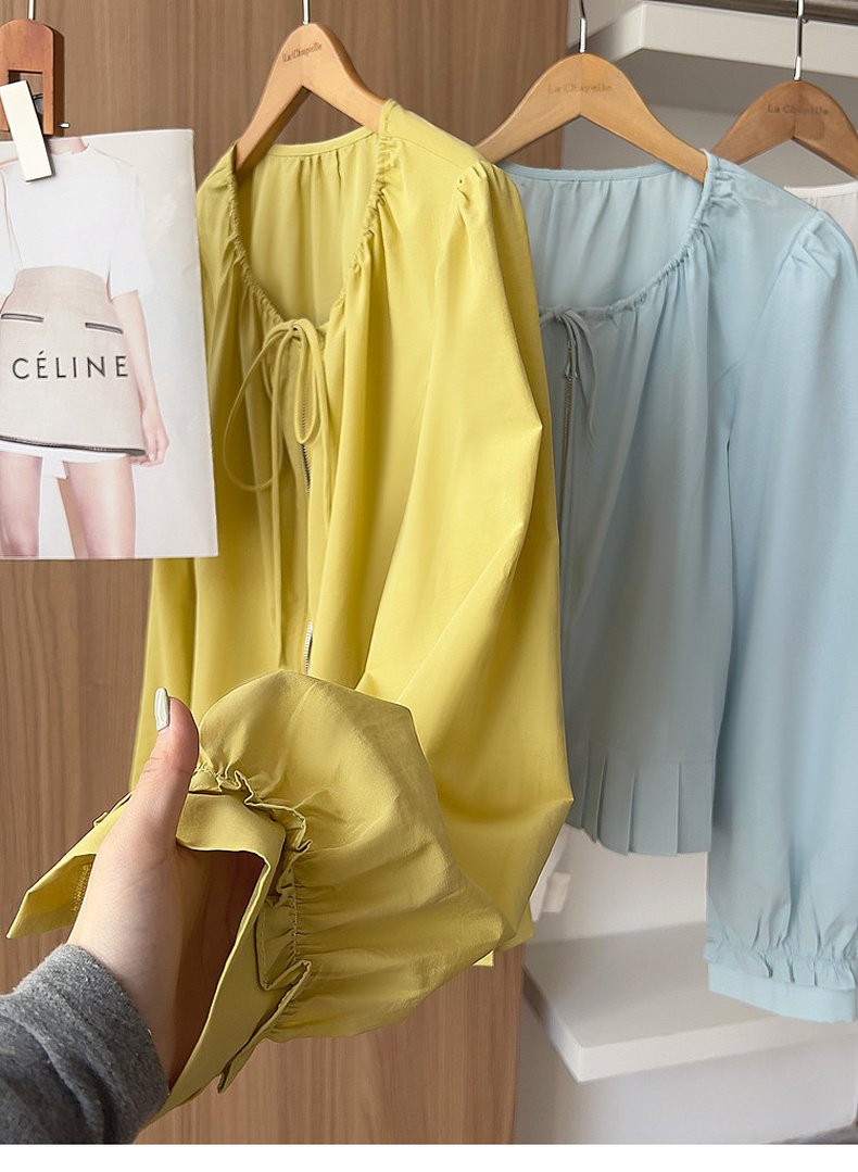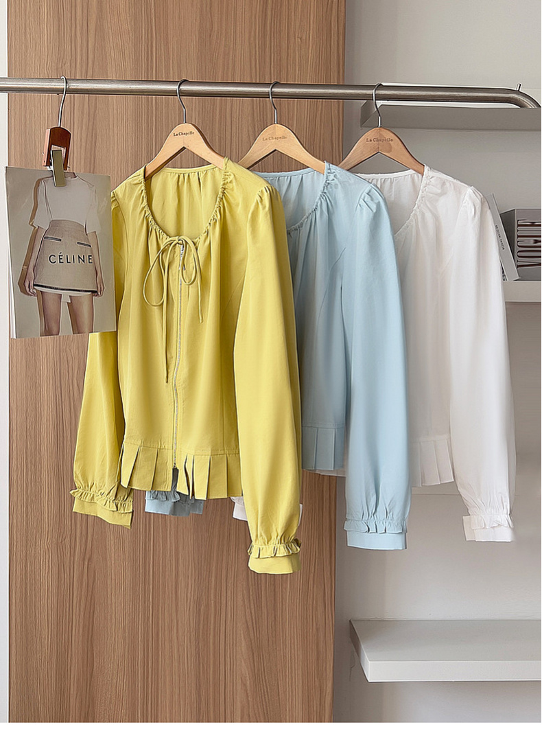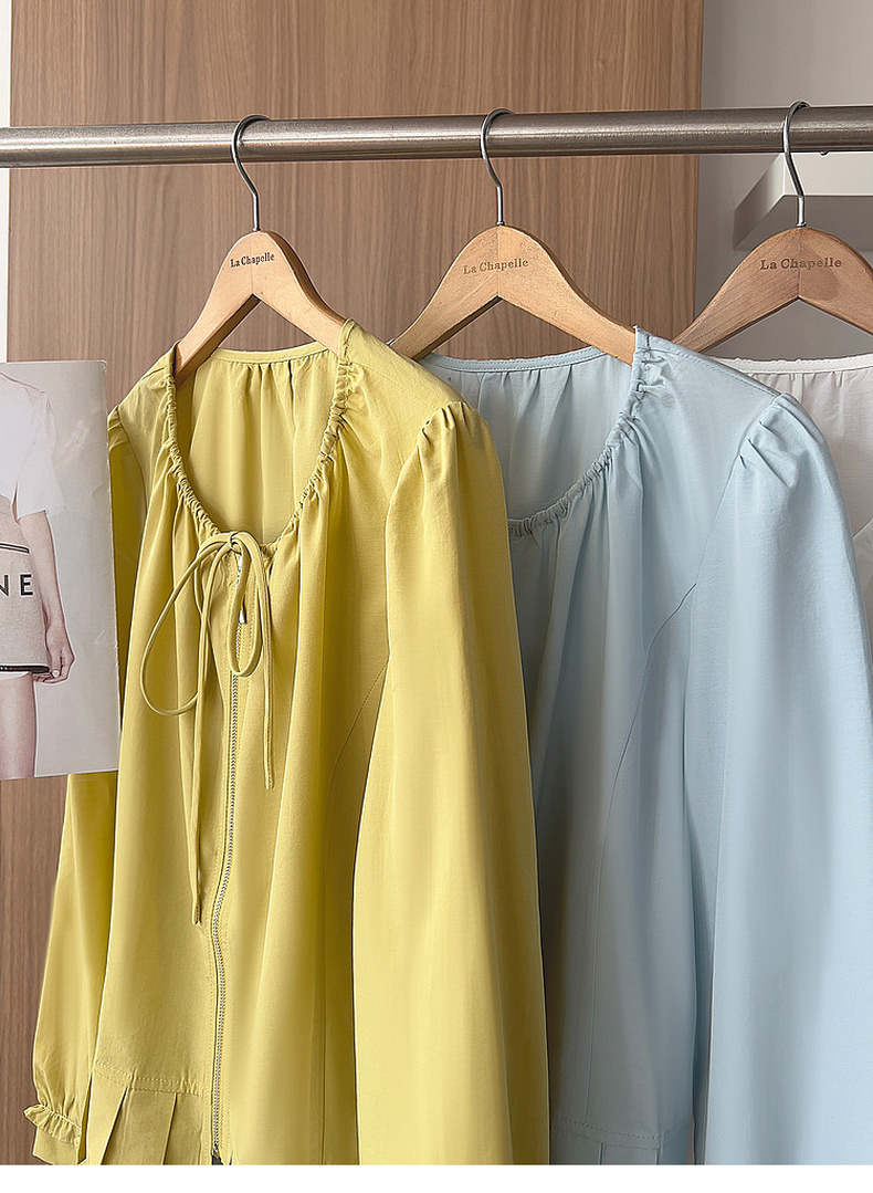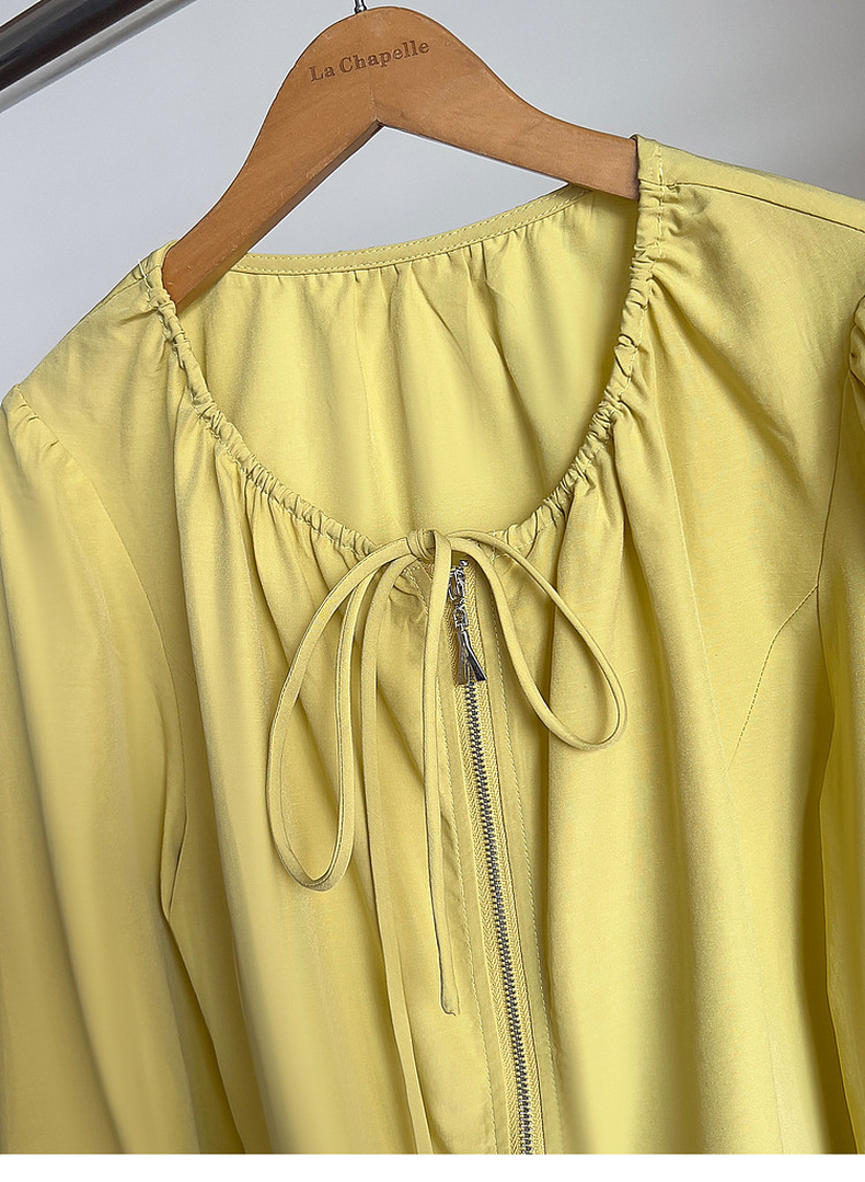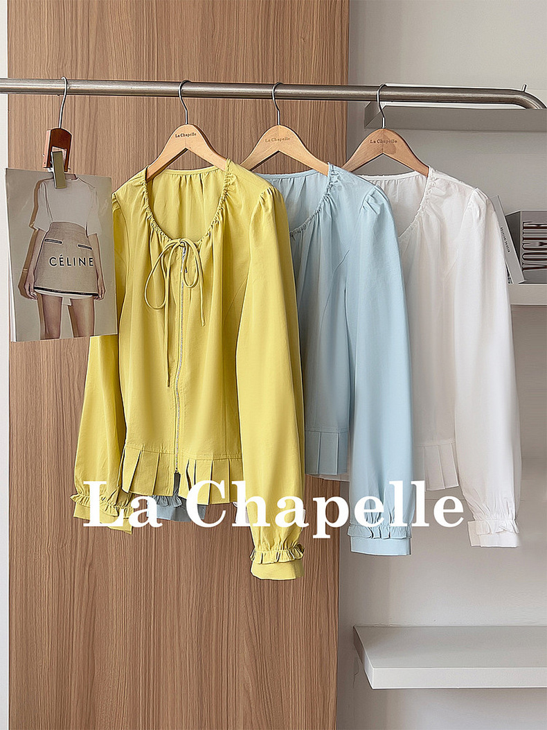 专柜实拍【莱赛尔+麻】拉夏贝尔/La Chapelle圆领系带拉链压褶花边设计长袖上衣百搭甜美风衬衣