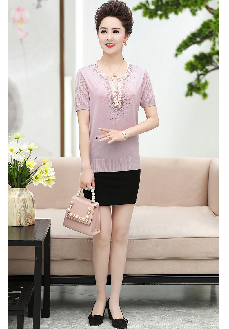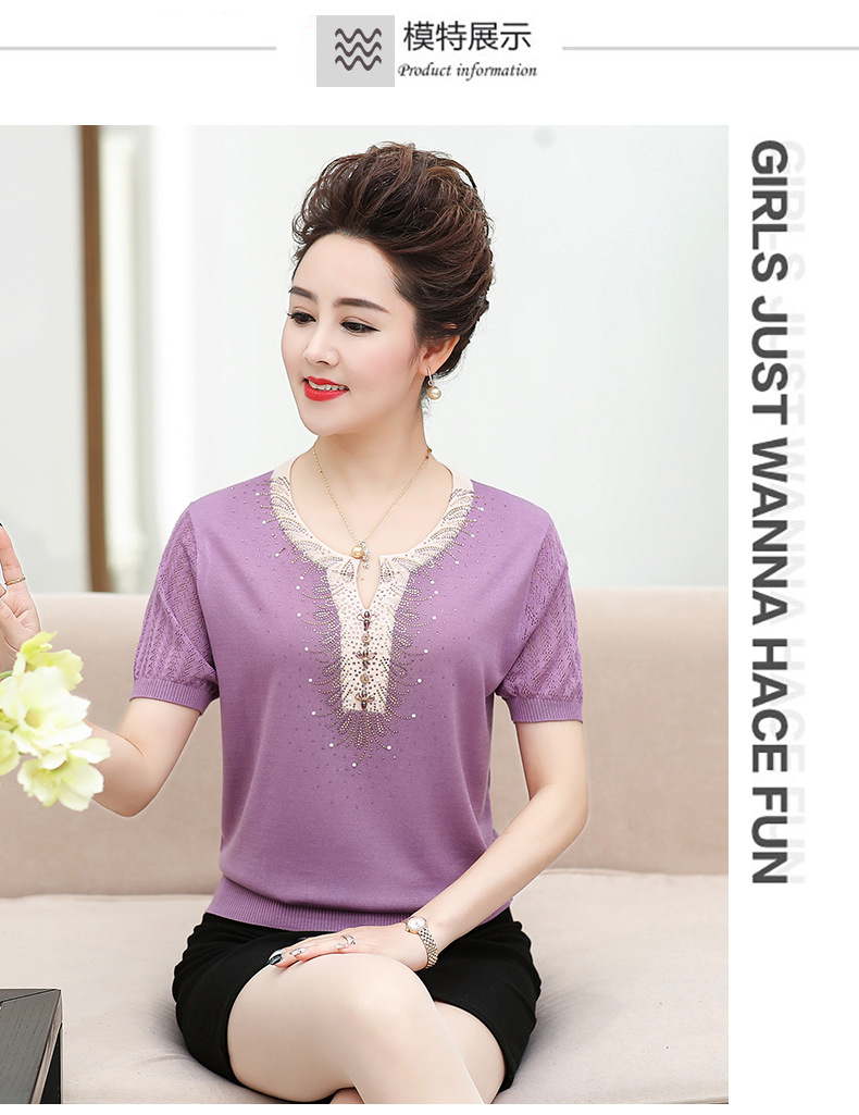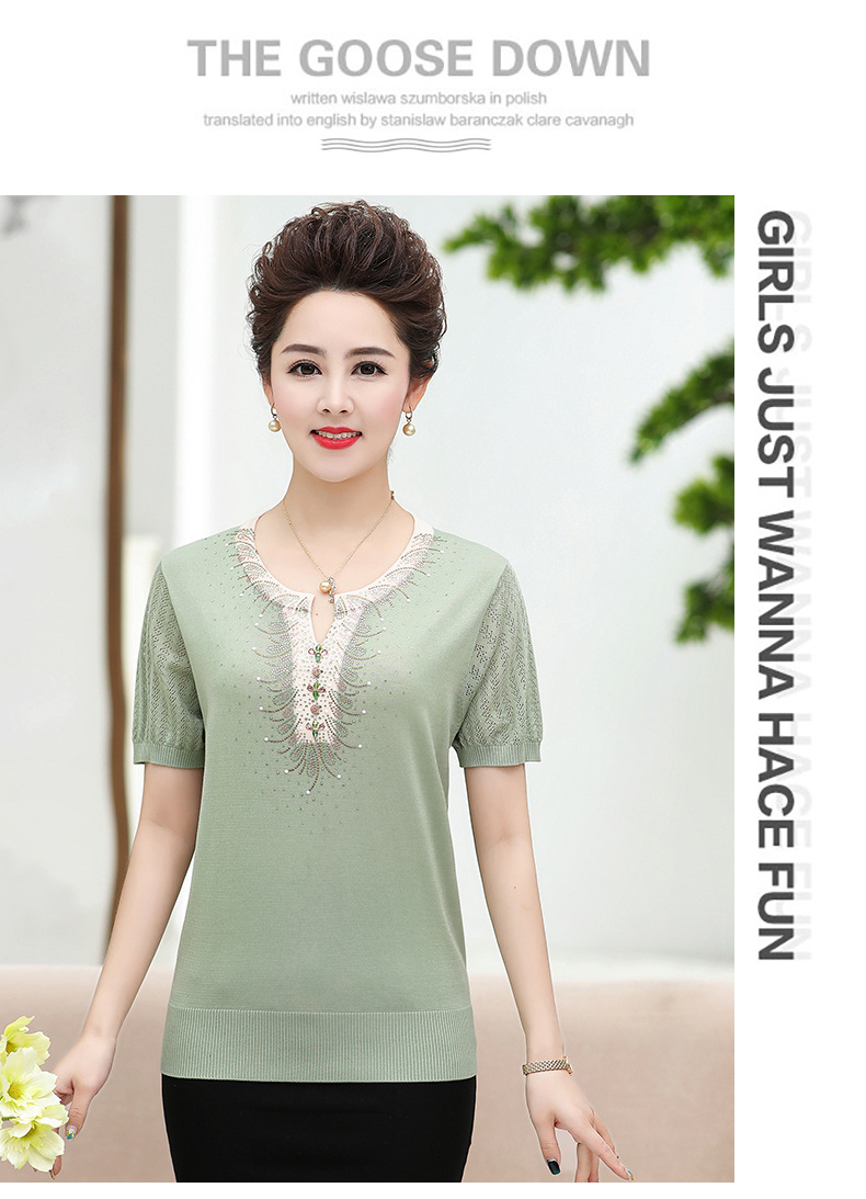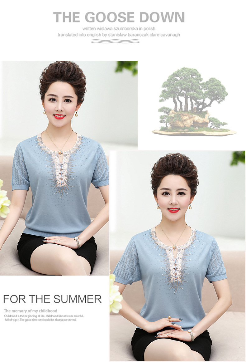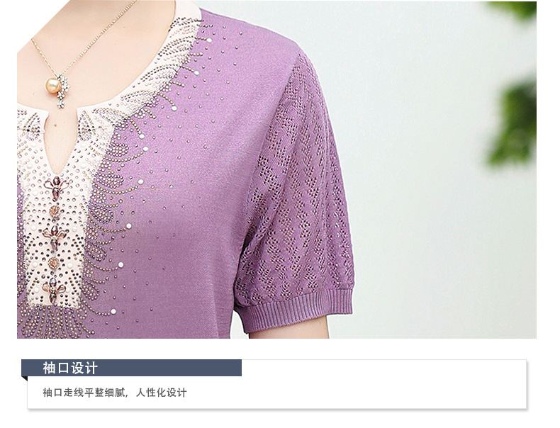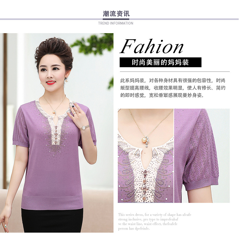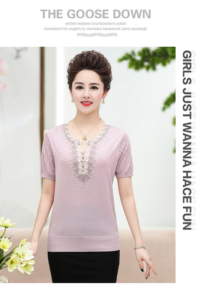 QYY-xx1901时尚妈妈装大码宽松镶钻冰丝短袖针织衫
