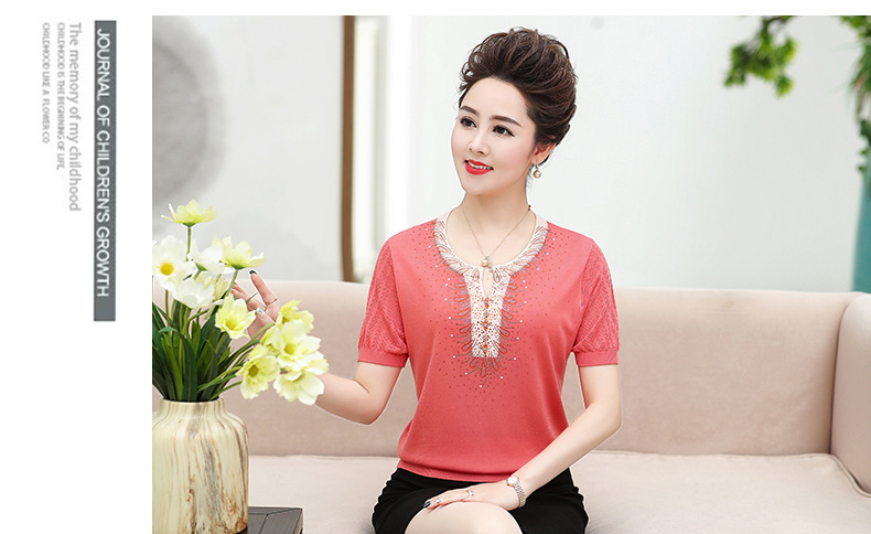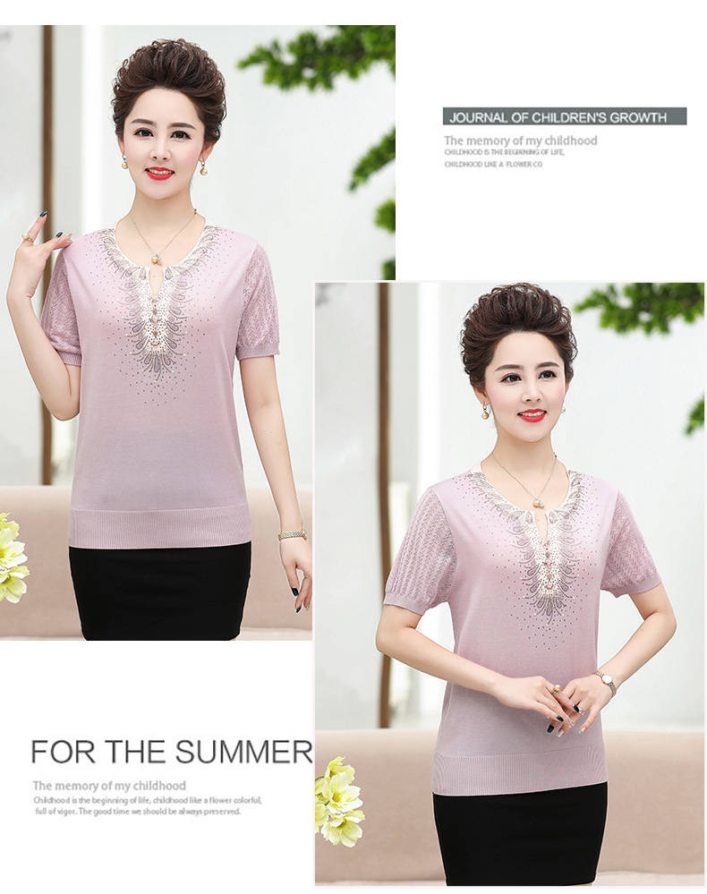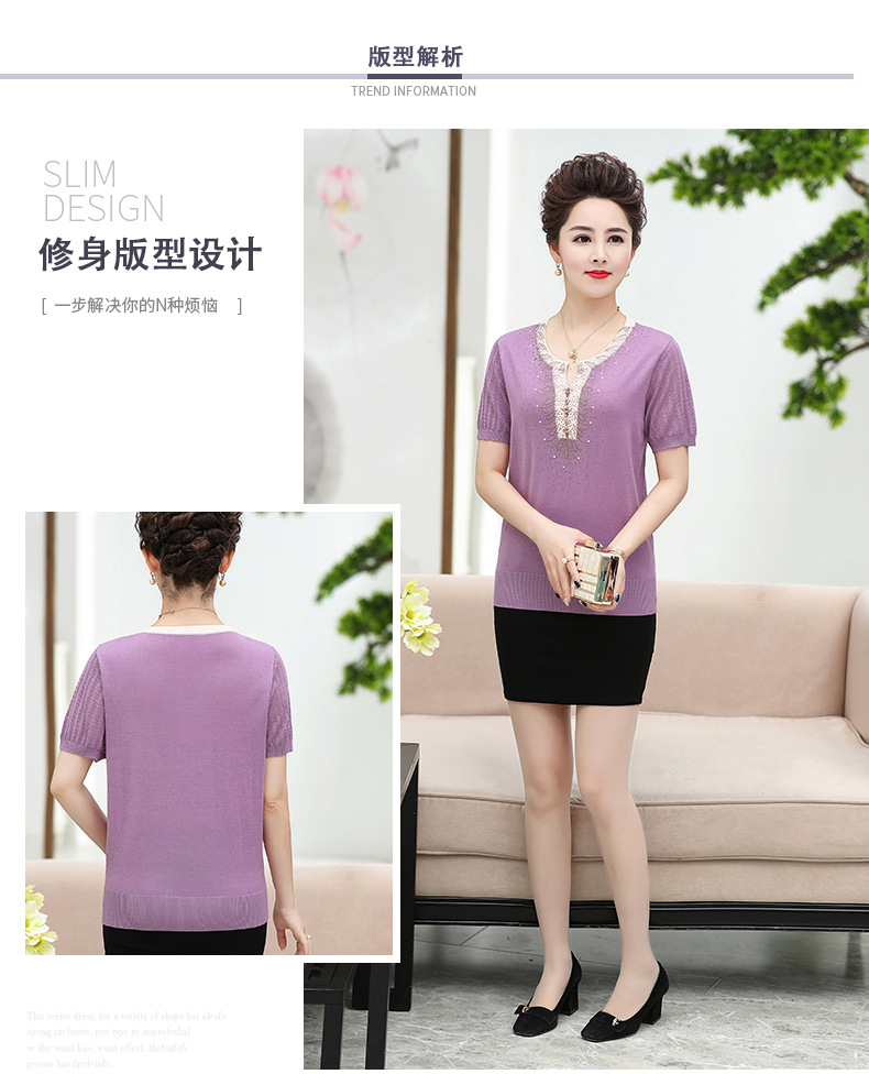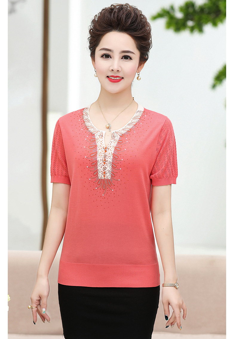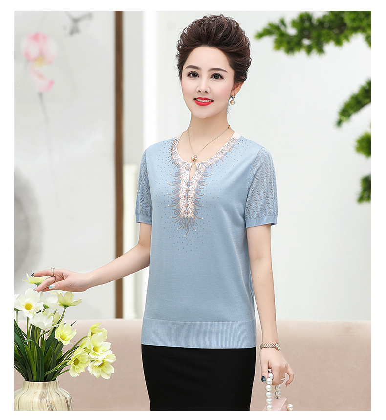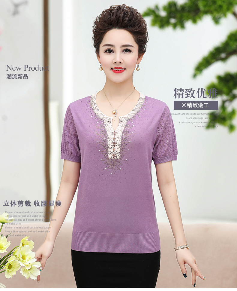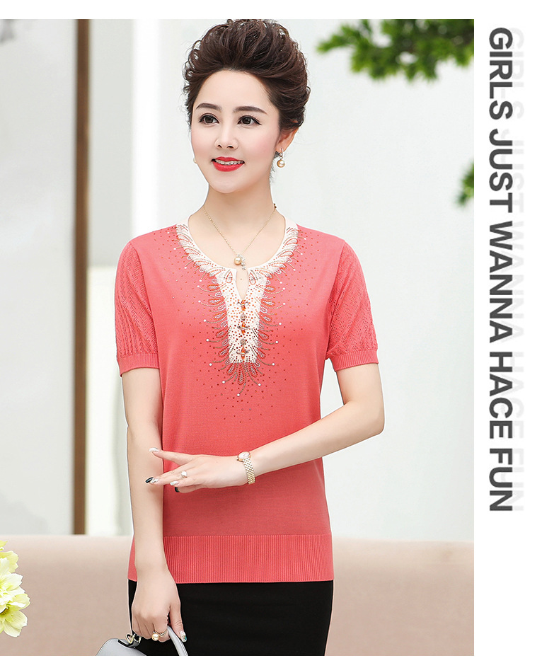 QYY-xx1901时尚妈妈装大码宽松镶钻冰丝短袖针织衫