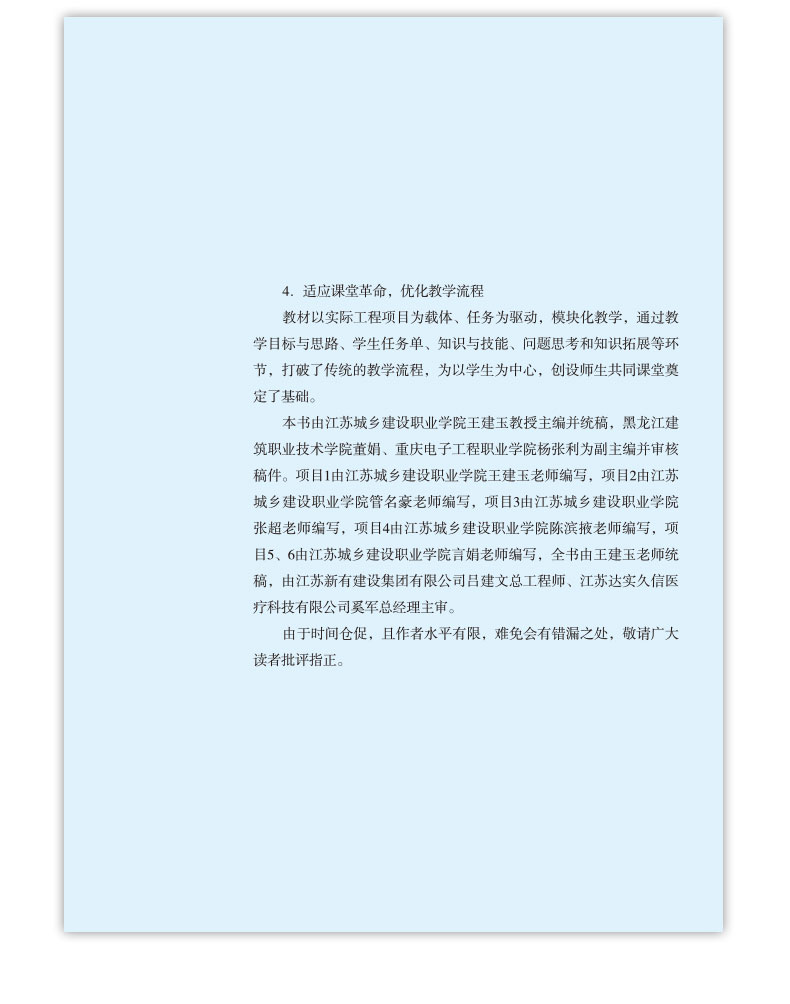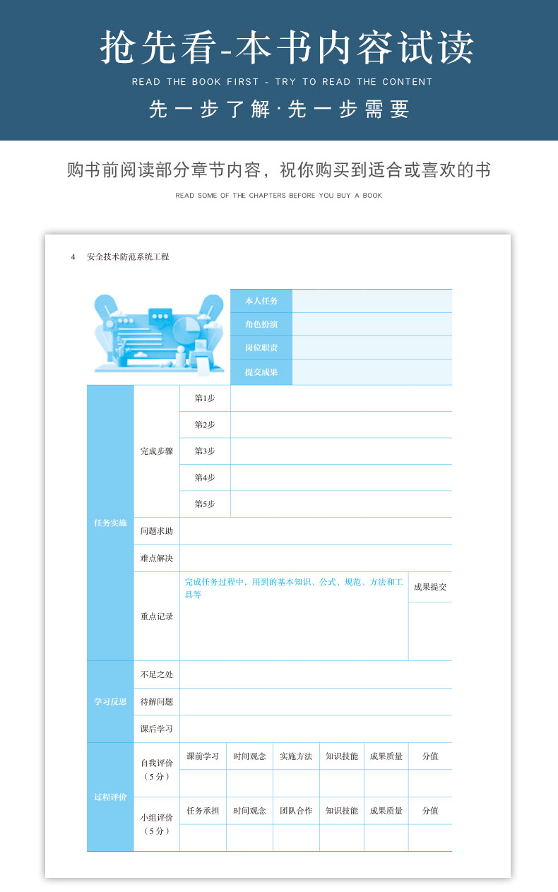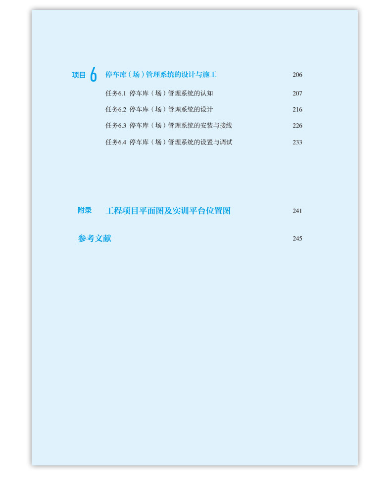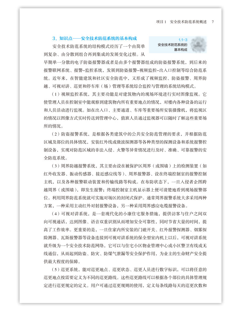本教材分为六各项目主要有:项目一 安全技术防范系统概述(包括安全技术防范系统的认识、安全技术防范系统的规划设计、安全技术防范系统工程的实施三个任务);项目二 视频安防监控系统施工(包括视频安防监控系统的认识、视频安防监控系统的设计、前端设备的安装与接线、监控中心设备的安装与接线、前端设备的设置与调试、监控中心设备的设置与调试六个任务);项目三 入侵报警系统施工(包括入侵报警系统的认知、入侵报警系统的设计、入侵报警系统的识图、入侵报警系统的安装与接线、入侵报警系统的设置与调试五个任务);项目四 出入口控制系统施工(包括出入口控制系统的认知、出入口控制系统的设计、出入口控制系统的识图、出入口控制系统的安装与接线、出入口控制系统的设置与调试5个任务);项目五 电子巡查系统的施工(包括电子巡查系统的认识、电子巡查系统的设计、电子巡查系统的识图、电子巡查系统的安装与接线、电子巡查系统的设置与调试5个任务);项目六 停车库(场)管理系统施工(包括停车库(场)管理系统的认知、停车库(场)管理系统的设计、停车库(场)管理系统的识图、停车库(场)管理系统的安装与接线、停车库(场)管理系统的设置与调试5个任务)。