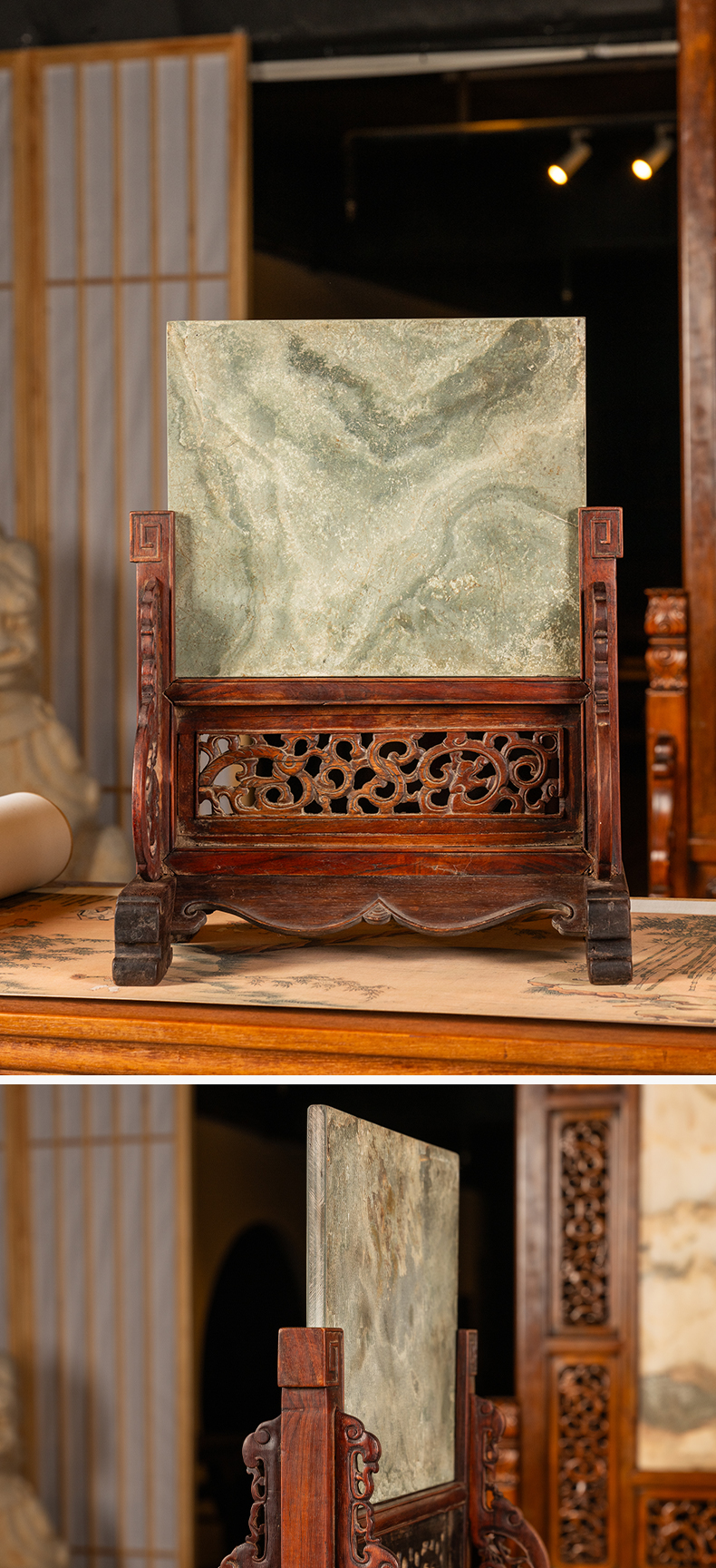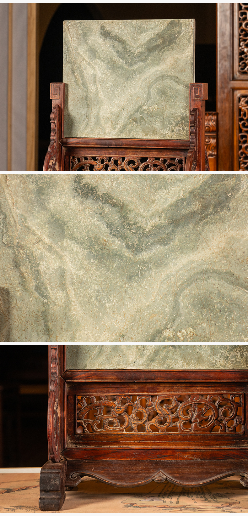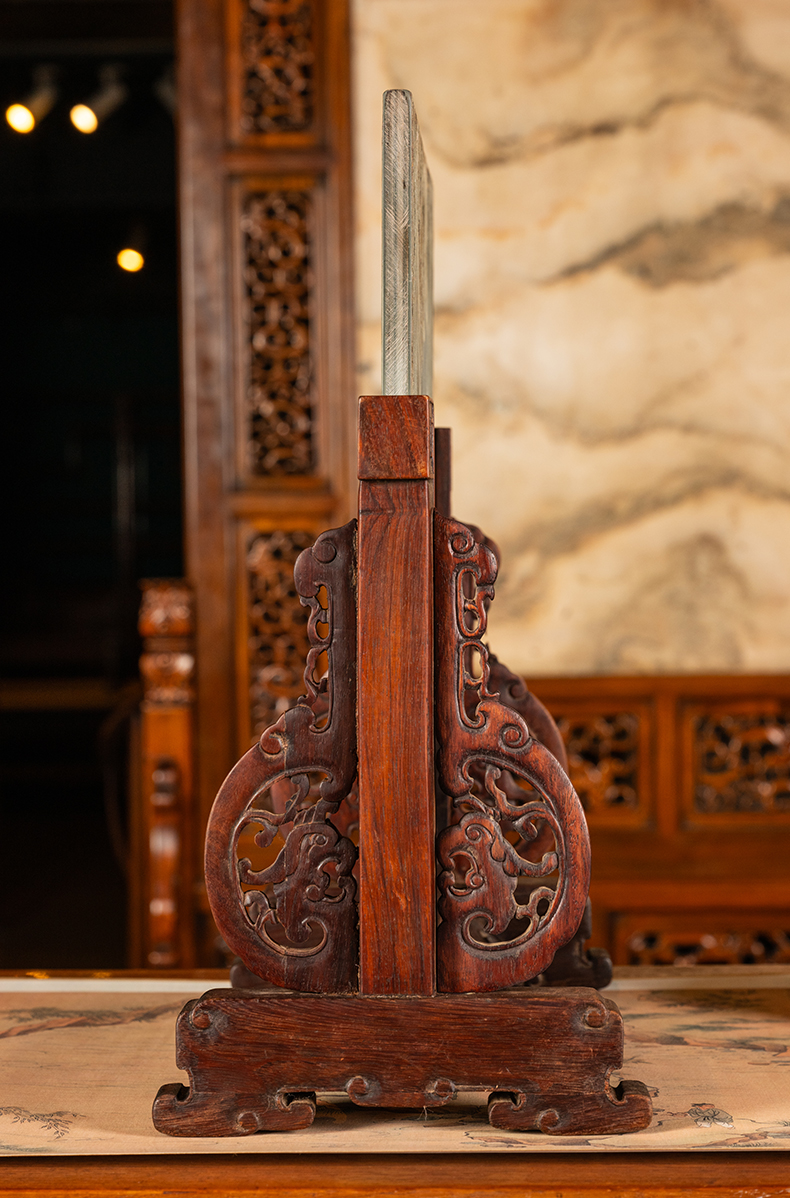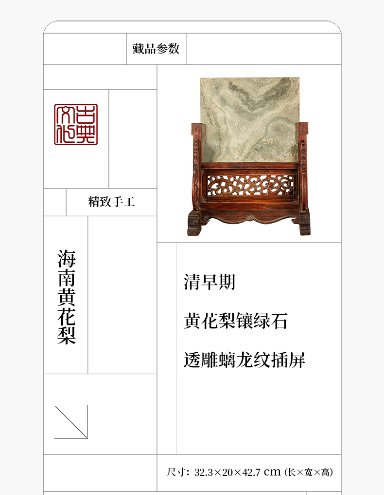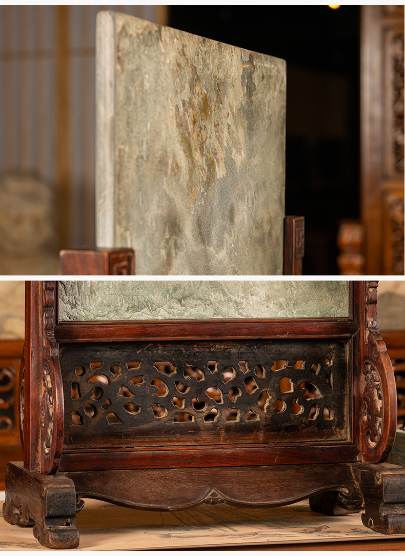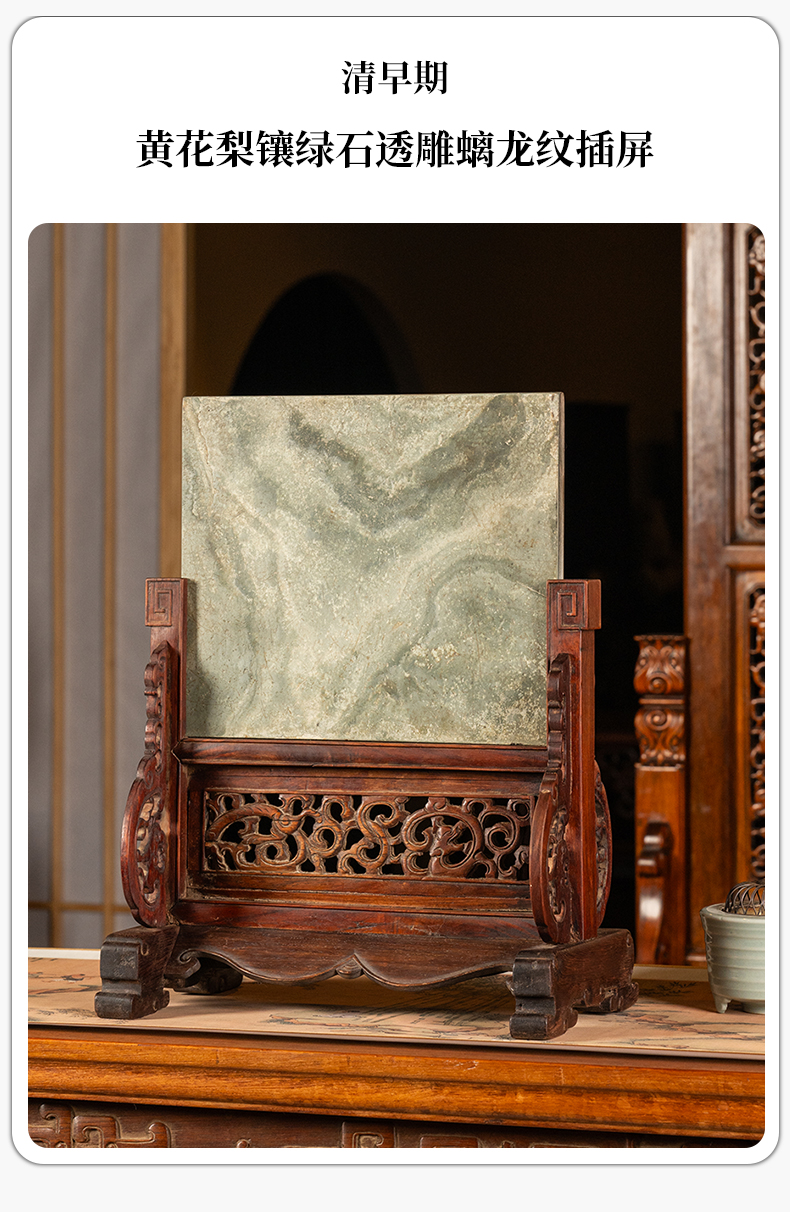 清早期 黄花梨镶绿石透雕螭龙纹插屏