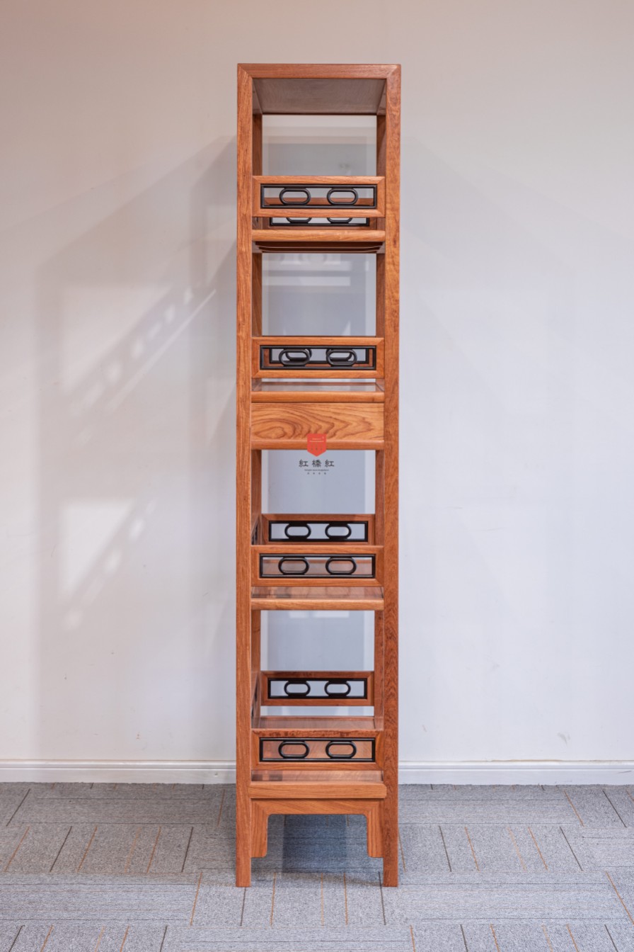 我们保持整体器型不变的情况下,做实用调整,比例得当,调整层板比例,增添抽屉两具,具明式轻巧秀挺之风,陈置雅物或堆叠书籍皆宜。屉近及胸,素面微落于足枨之下,侧墙装槽抽拉顺滑,面饰简约铜活锦上不争,脚稍高,足间素牙光素匀称。整器层次分明,空灵通透。