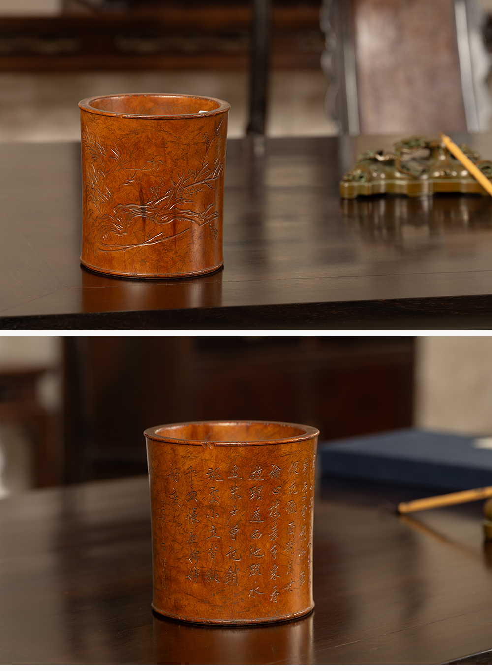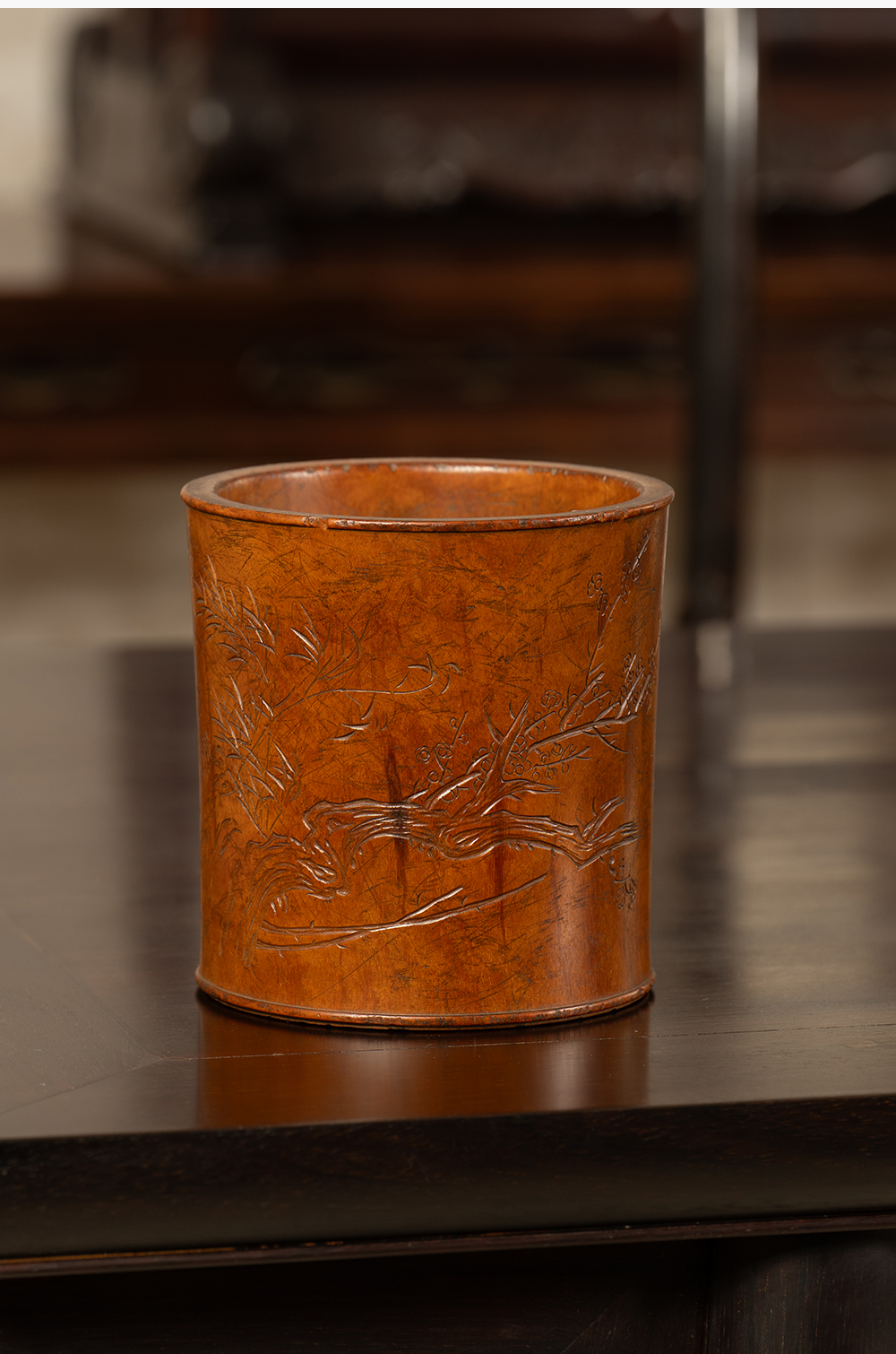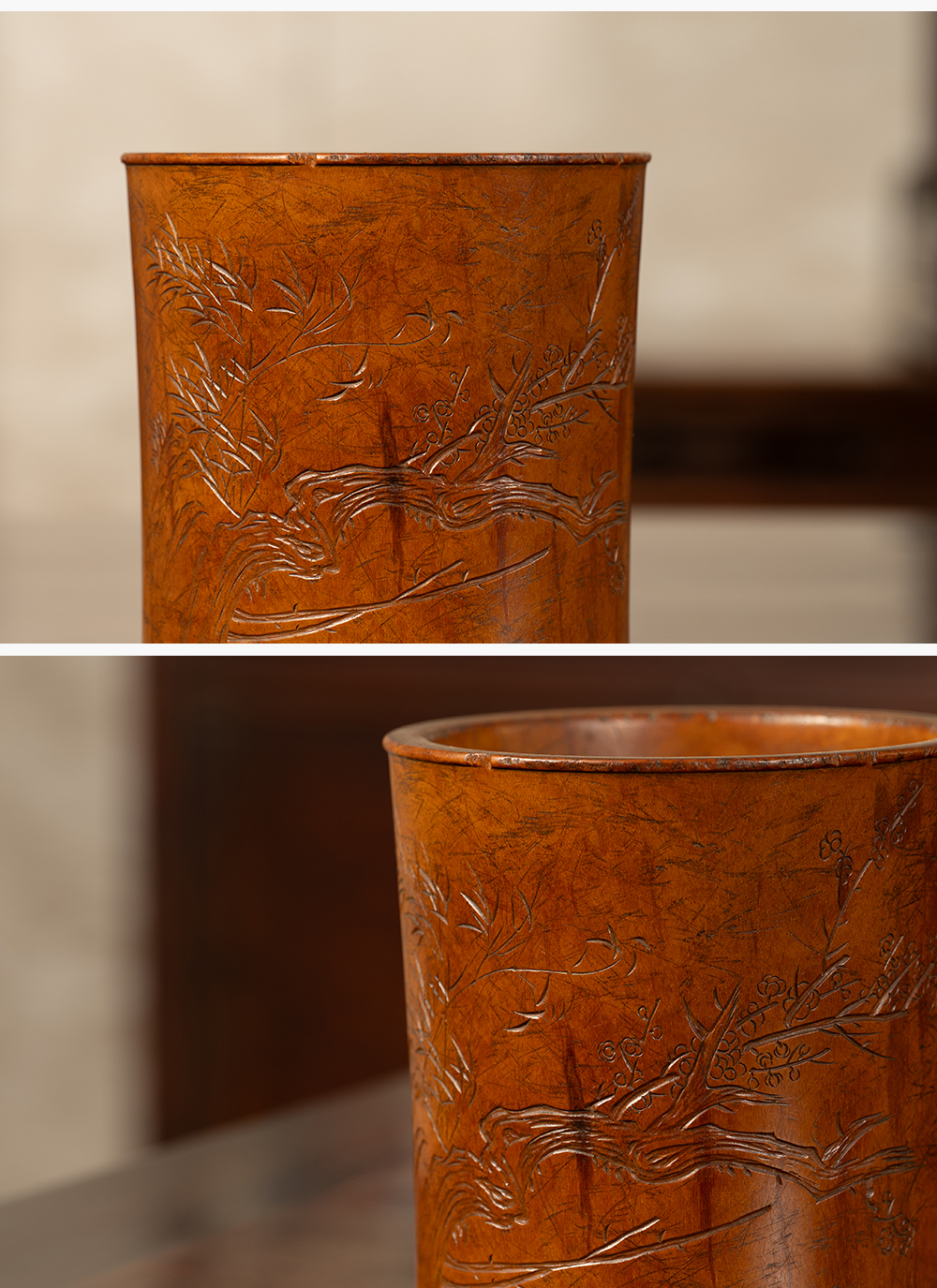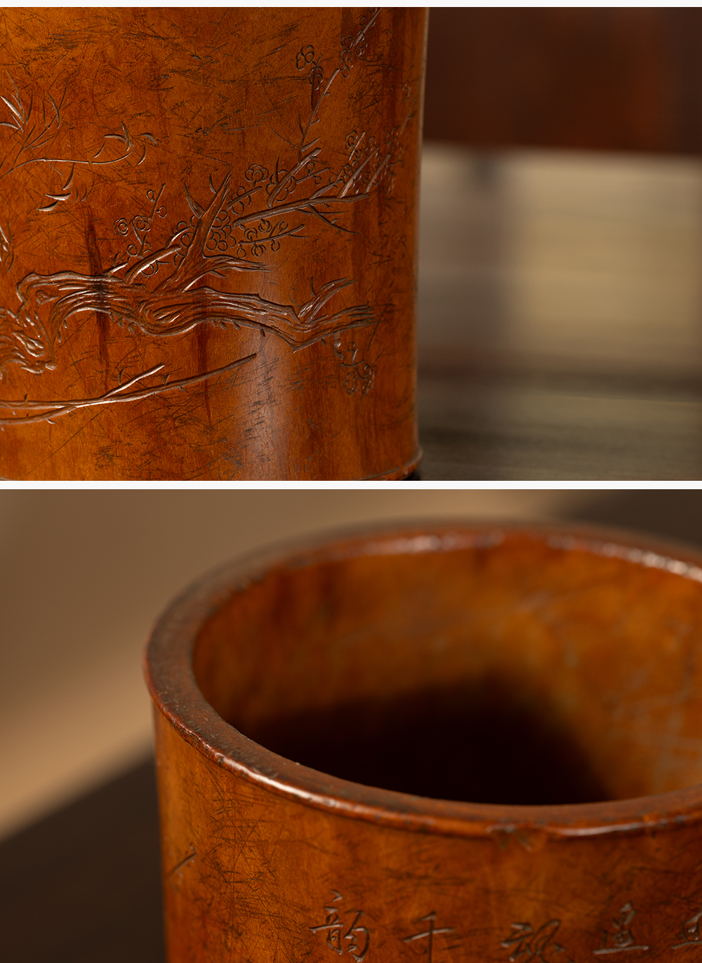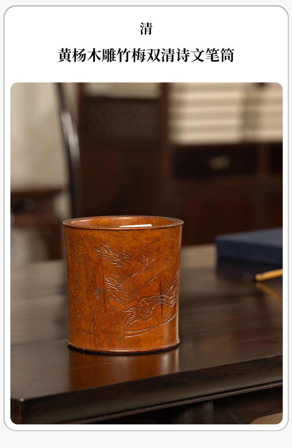 清 黄杨木雕竹梅双清诗文笔筒