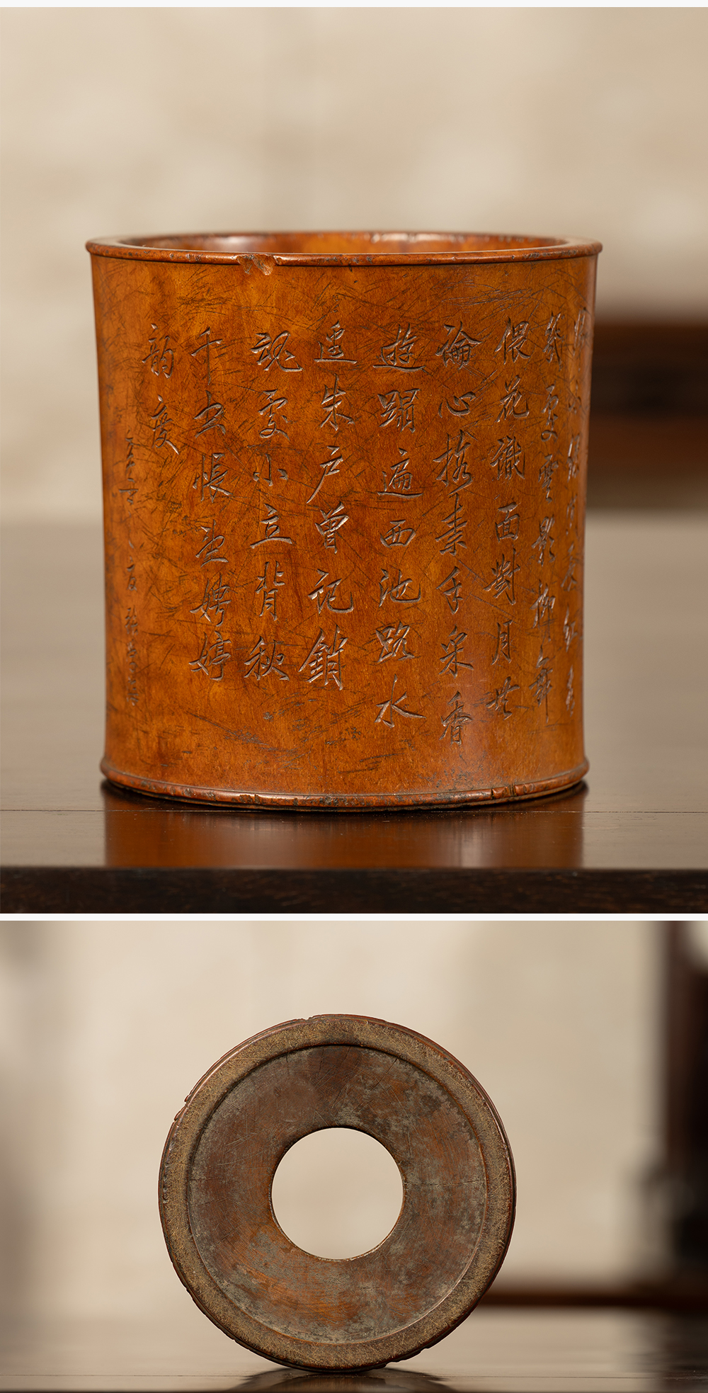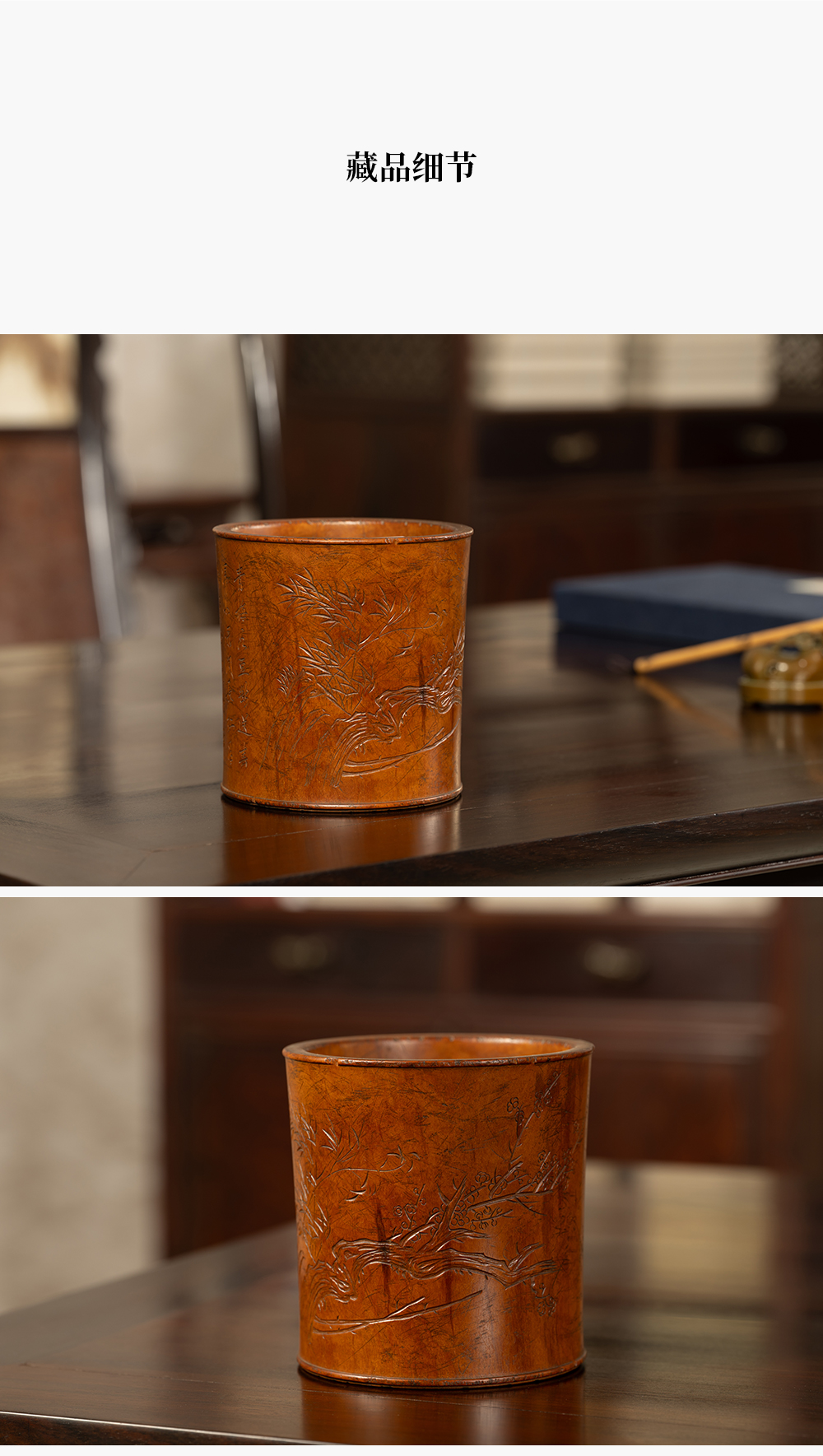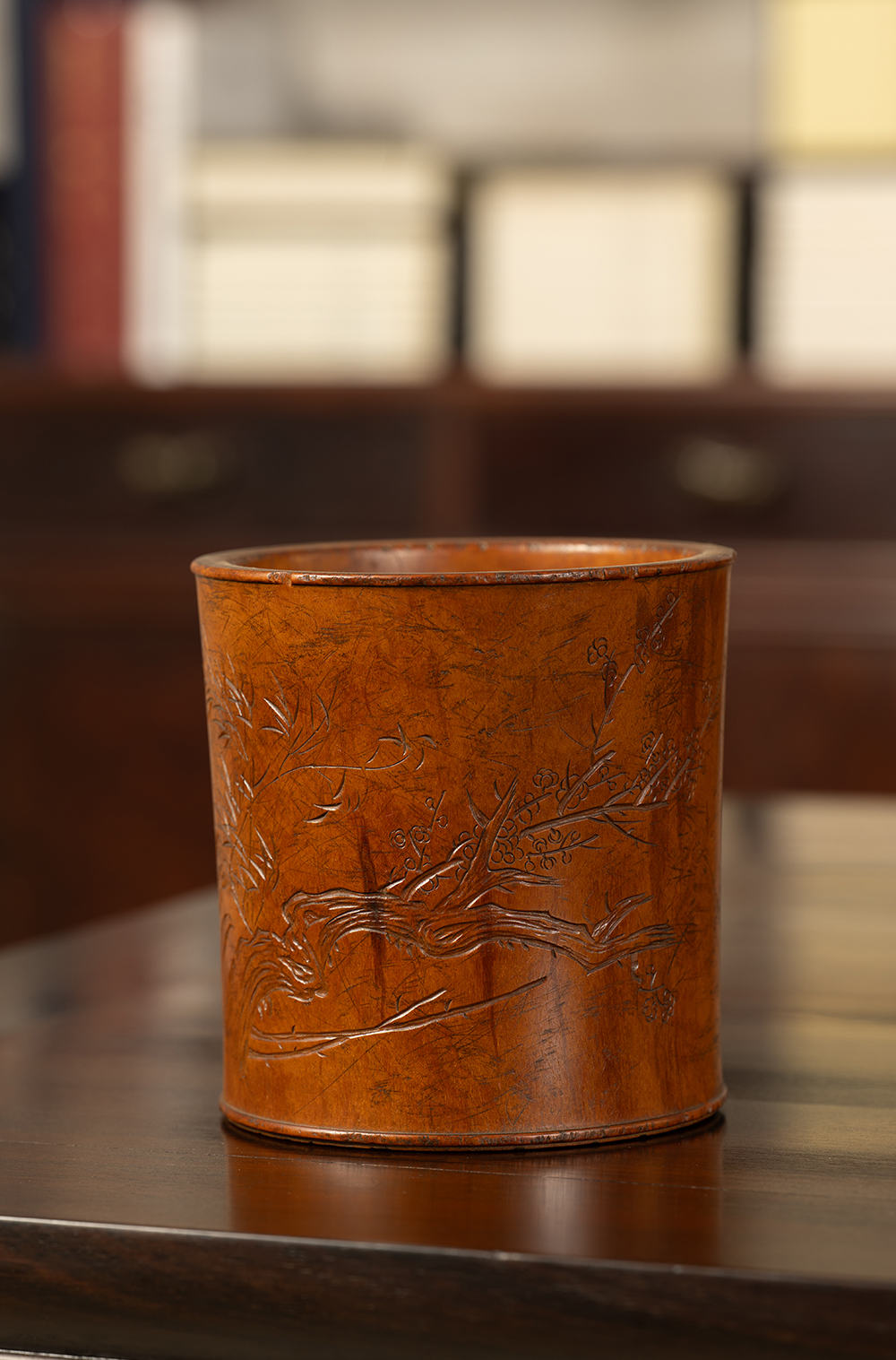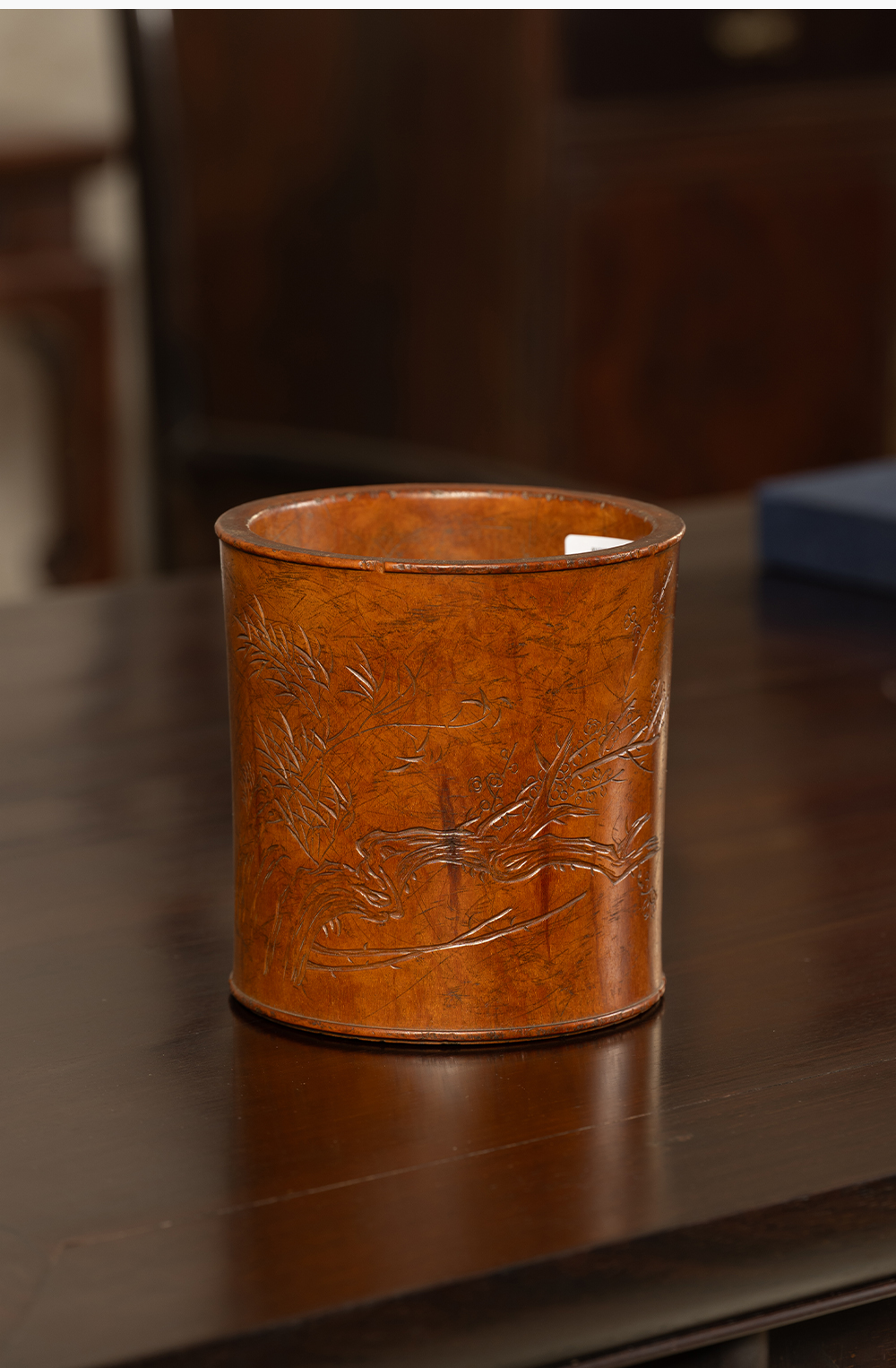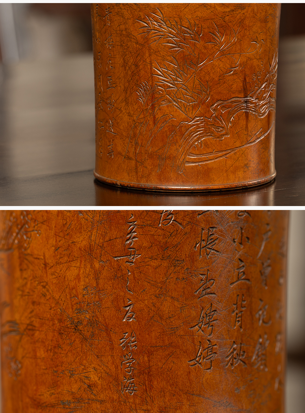 清 黄杨木雕竹梅双清诗文笔筒