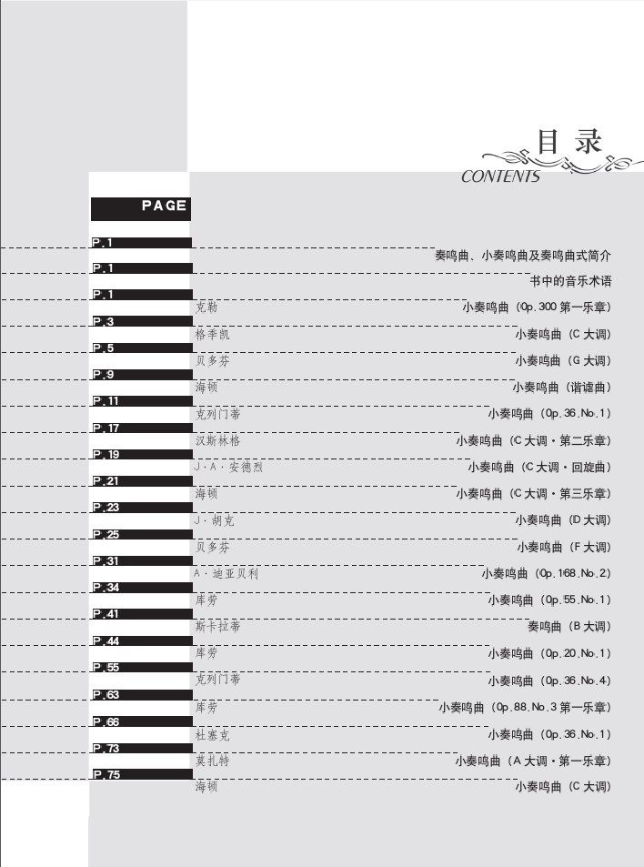 这本教材编入了克列门蒂、库劳、莫扎特、贝多芬等14位作曲家不同程度的小奏鸣曲作品27首。书中附有对奏鸣曲、小奏鸣曲及奏鸣曲式的简略介绍,还对各位作曲家、作品的风格特点及如何弹奏也作出了简明扼要的介绍和提示,力图帮助学琴者理解作品和正确弹奏作品。