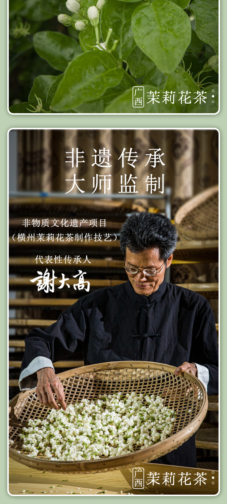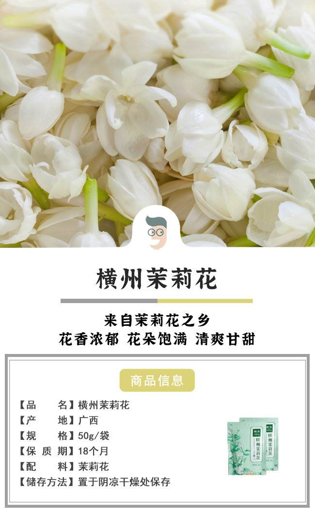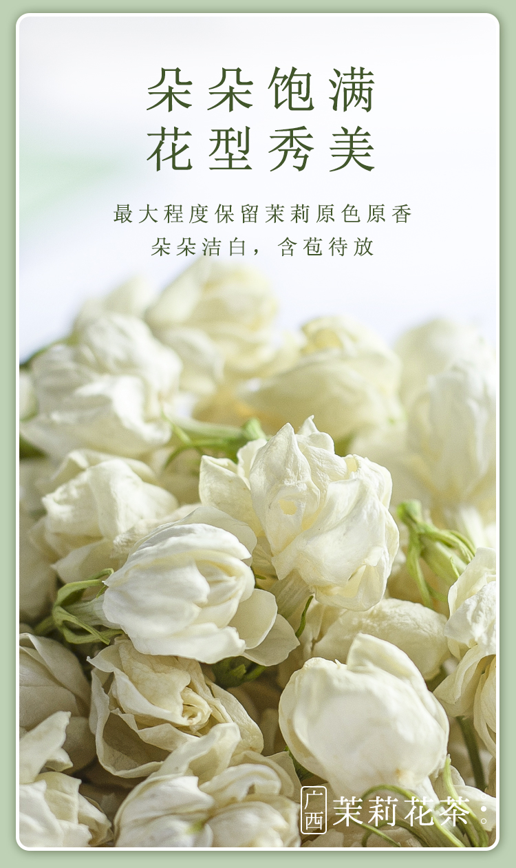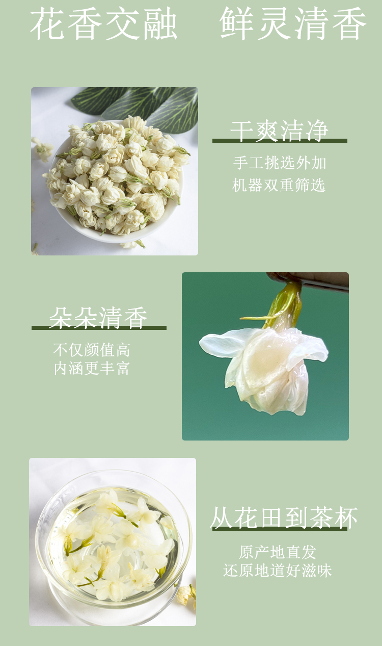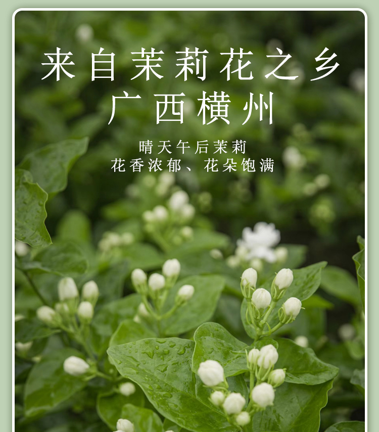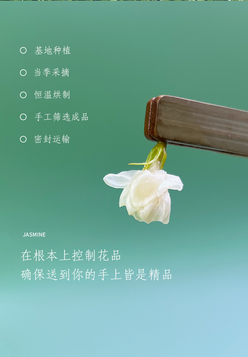 横州茉莉花 | 选用晴天午后茉莉 机器首筛人工复筛 6斤鲜花出1斤干花 花香更浓郁朵型更饱满 一花一杯茶 清爽甜润 香气清雅