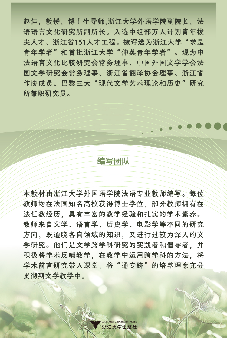 本教材由浙江大学外国语学院法语专业教师编写。每位教师均在法国知名高校获得博士学位,部分教师拥有在法任教经历,具有丰富的教学经验和扎实的学术素养。教师来自文学、语言学、历史学、电影学等不同的研究方向,既通晓各自领域的知识,又进行过较为深入的文学研究。他们是文学跨学科研究的实践者和倡导者,并积极将学术反哺教学,在教学中运用跨学科的方法,将学术前言研究带入课堂,将“通专跨”的培养理念充分贯彻到文学教学中。
