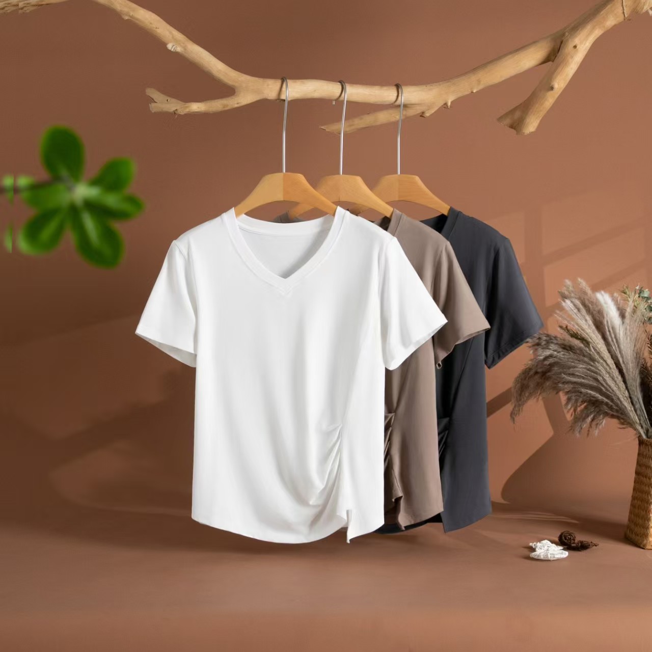 【品名】LS竹纤维女士简约抽褶V领半袖26505