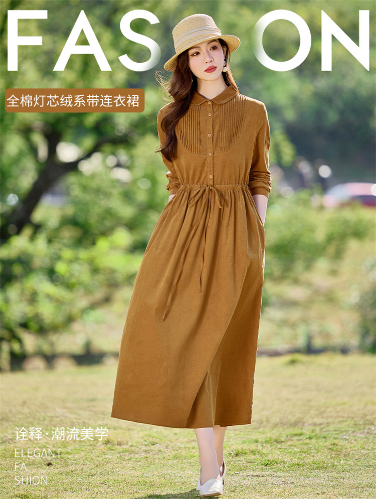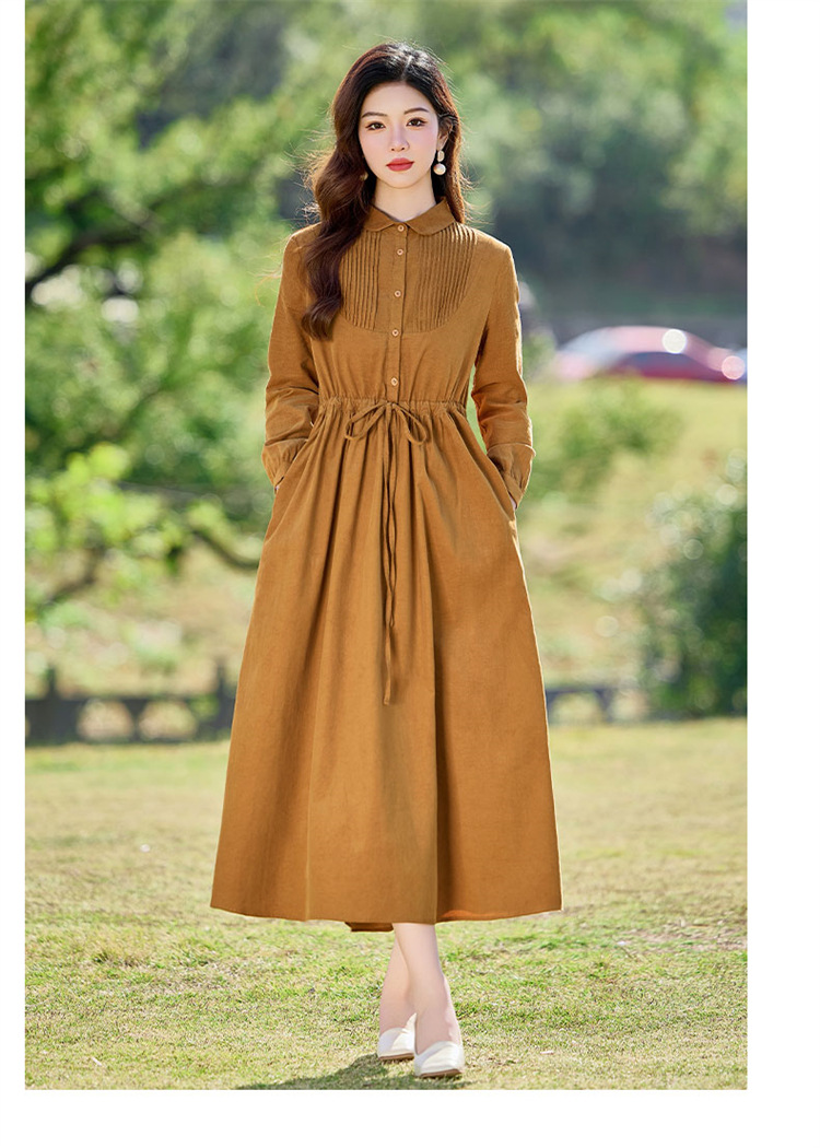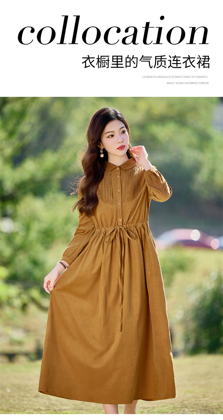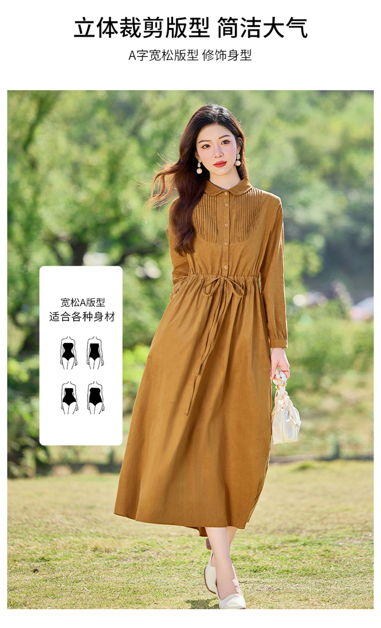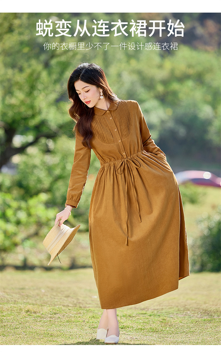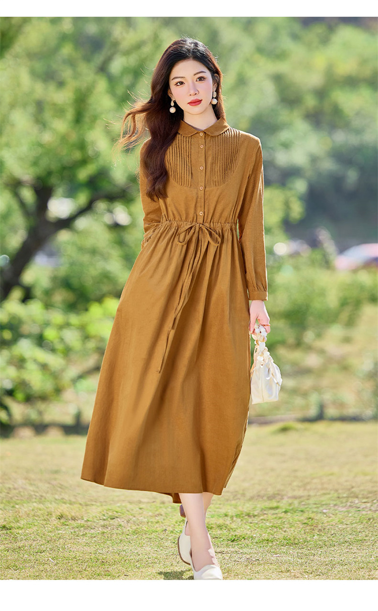 HR-SYY2663文艺气质连衣裙2025女式春季新款长袖时尚收腰显瘦娃娃领中长裙